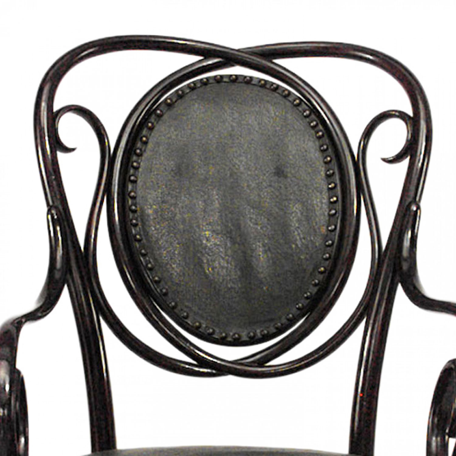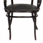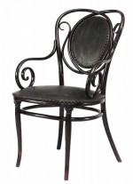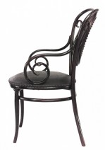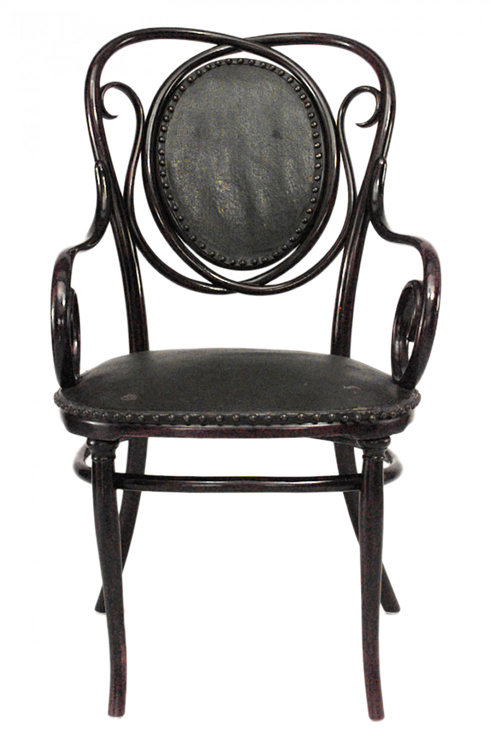 19th Century Bentwood arm chair with scroll design and black upholstered seat & back. (signed with THONET label)
