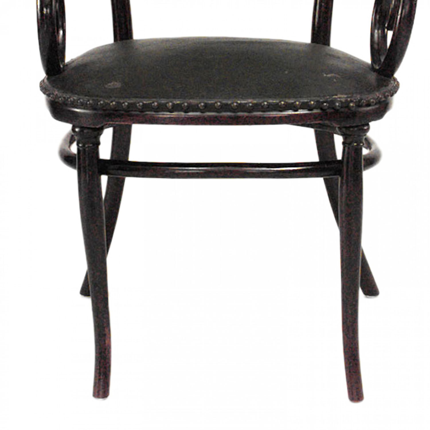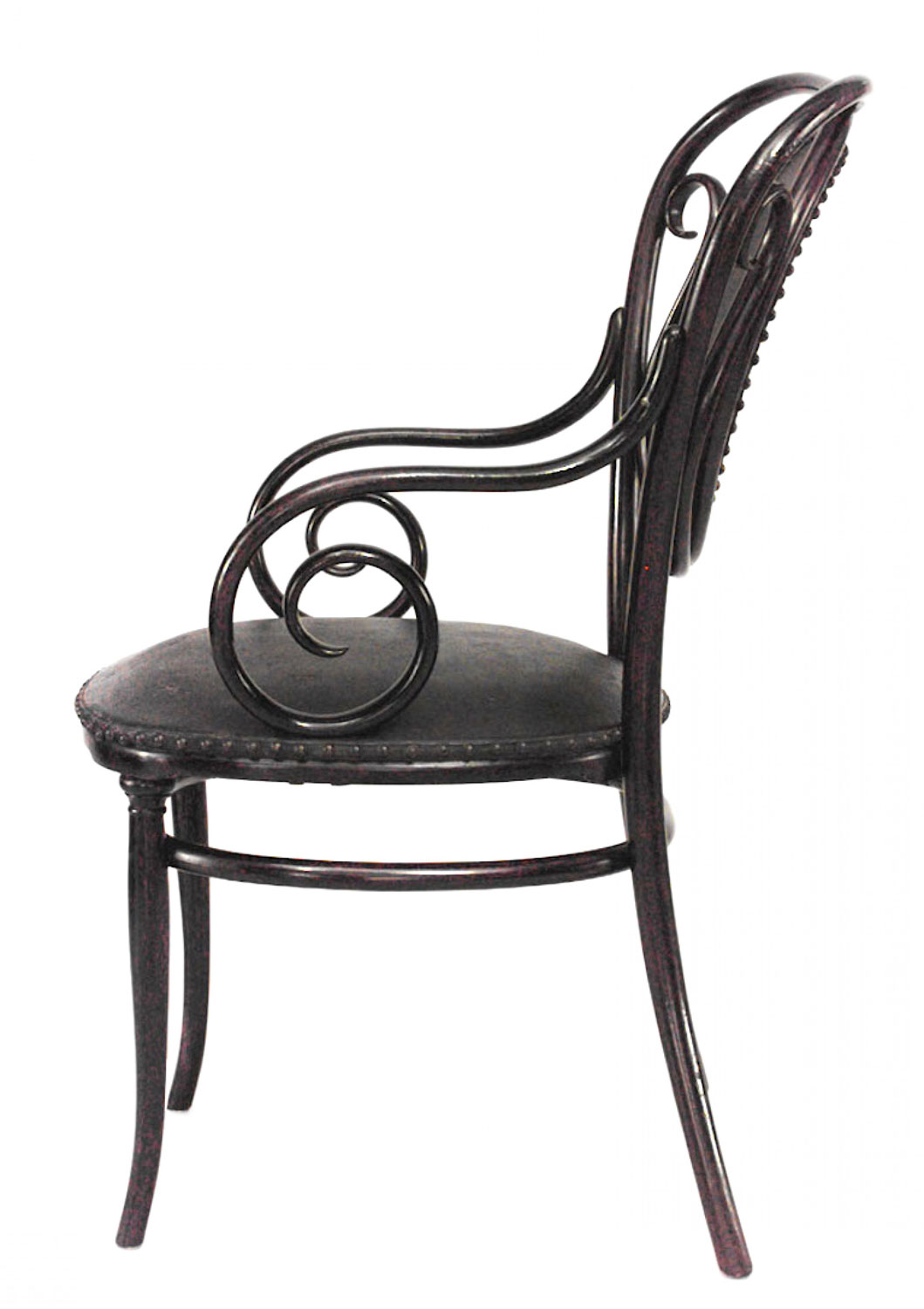 19th Century Bentwood arm chair with scroll design and black upholstered seat & back. (signed with THONET label).