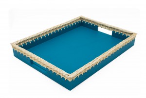 Contemporary rectangular blue leather tray with a woven wicker willow wood edge (Made in Italy) (Related item: MOD021).