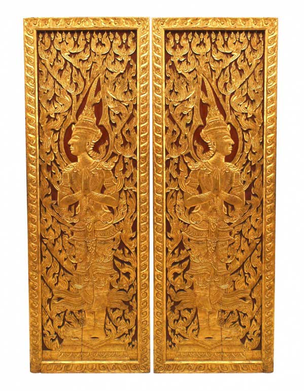 PAIR of Asian Burmese style (19th Century) walnut carved door panels with figures and filigree border (PRICED AS PAIR)..