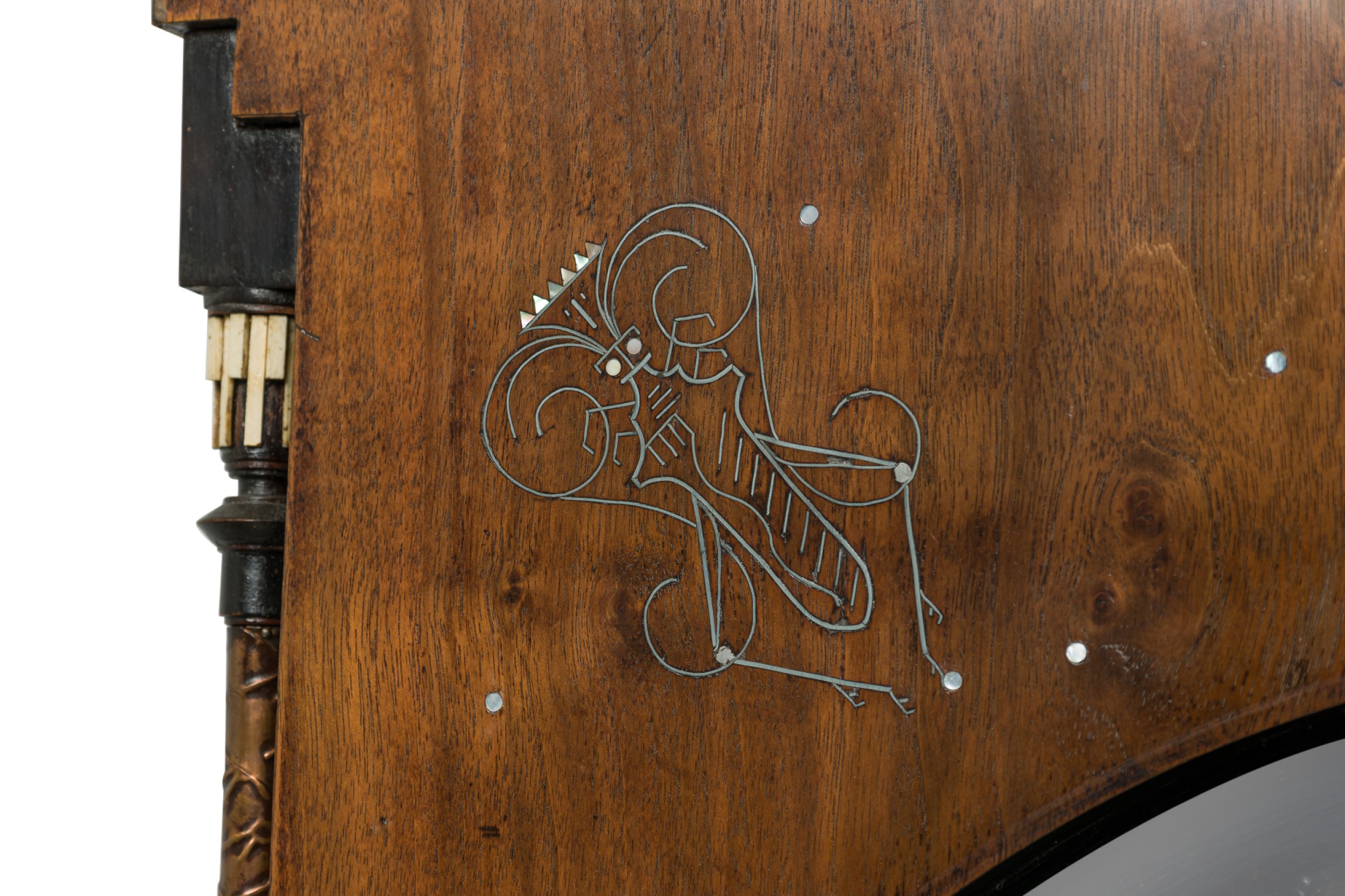 Italian Art Nouveau narrow hall / hatrack stand having a walnut & ebonized wood frame with pewter & pearl inlay and a shaped inset full-length mirror,with elaborate columns and center pedestal having copper veneer, featuring elaborate geometric bone trim, all resting on a triangular base (CARLO BUGATTI)