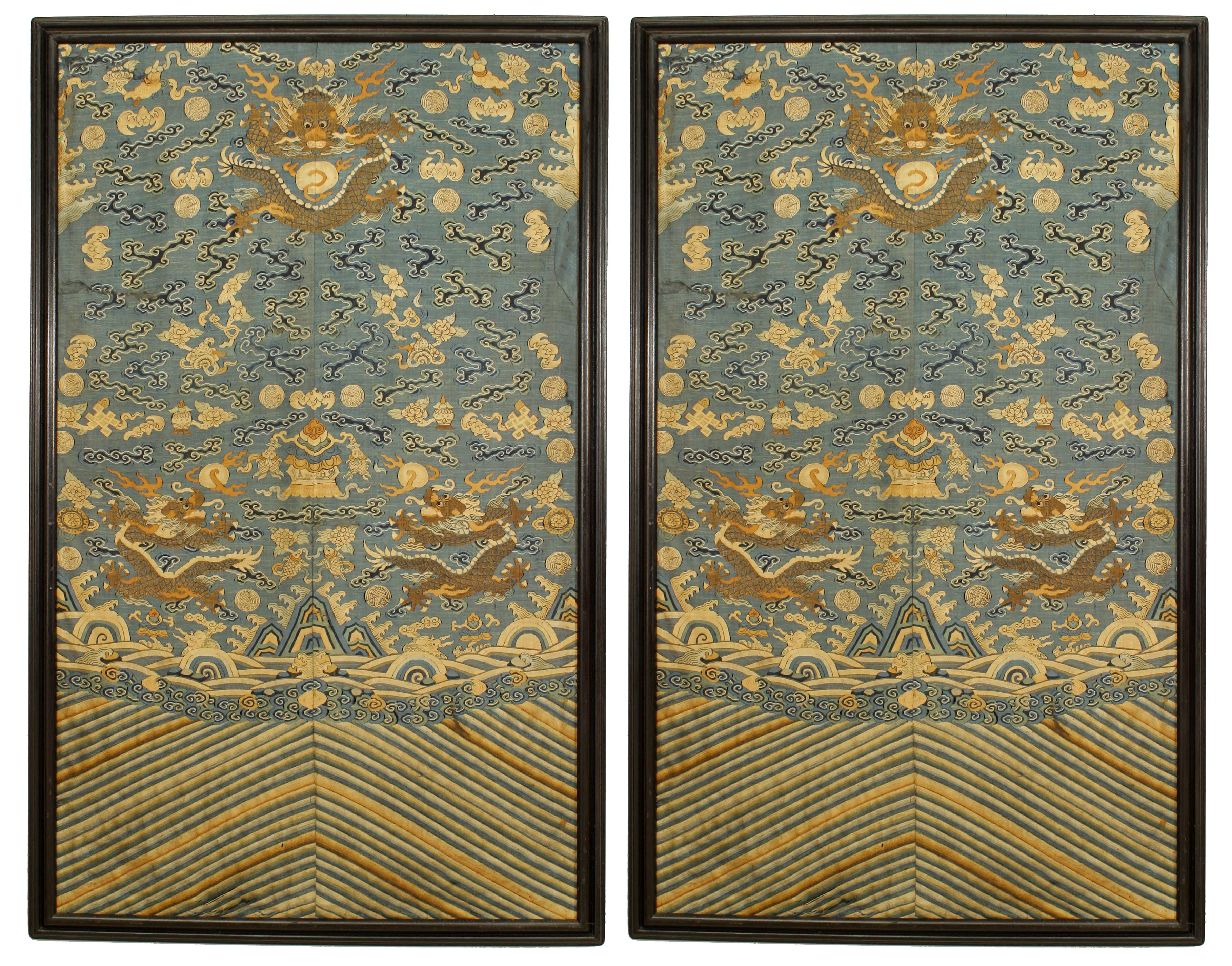 Asian Chinese style (19th Century) black framed embroidery wall hangings with blue background (PRICED EACH)