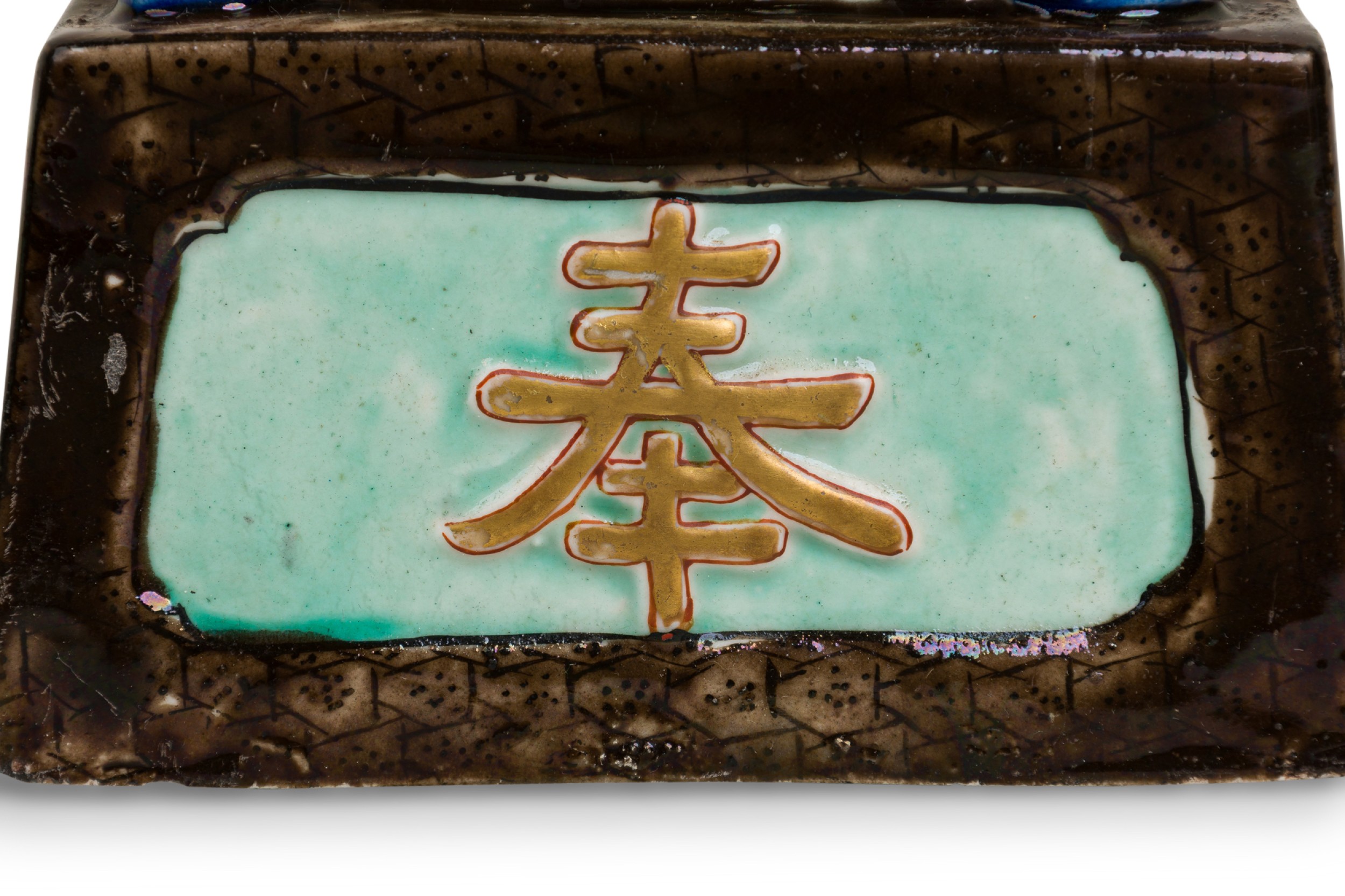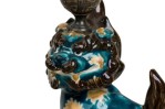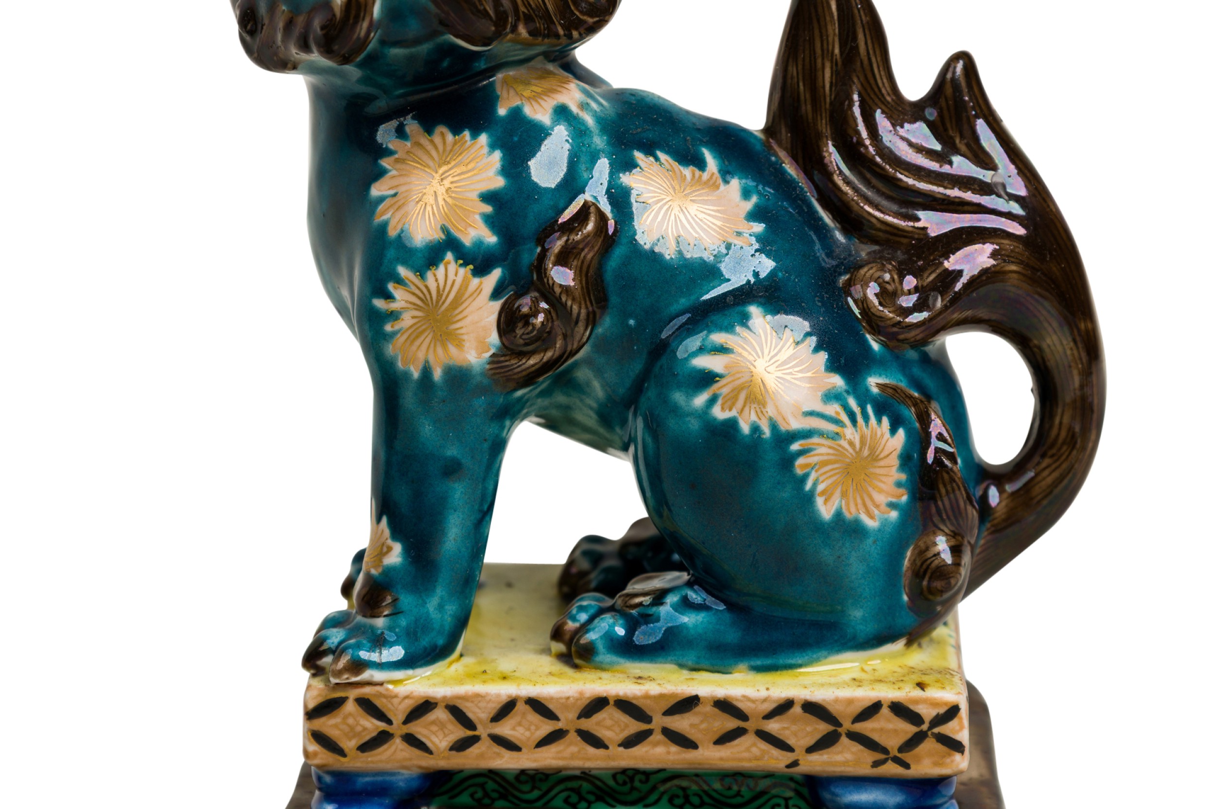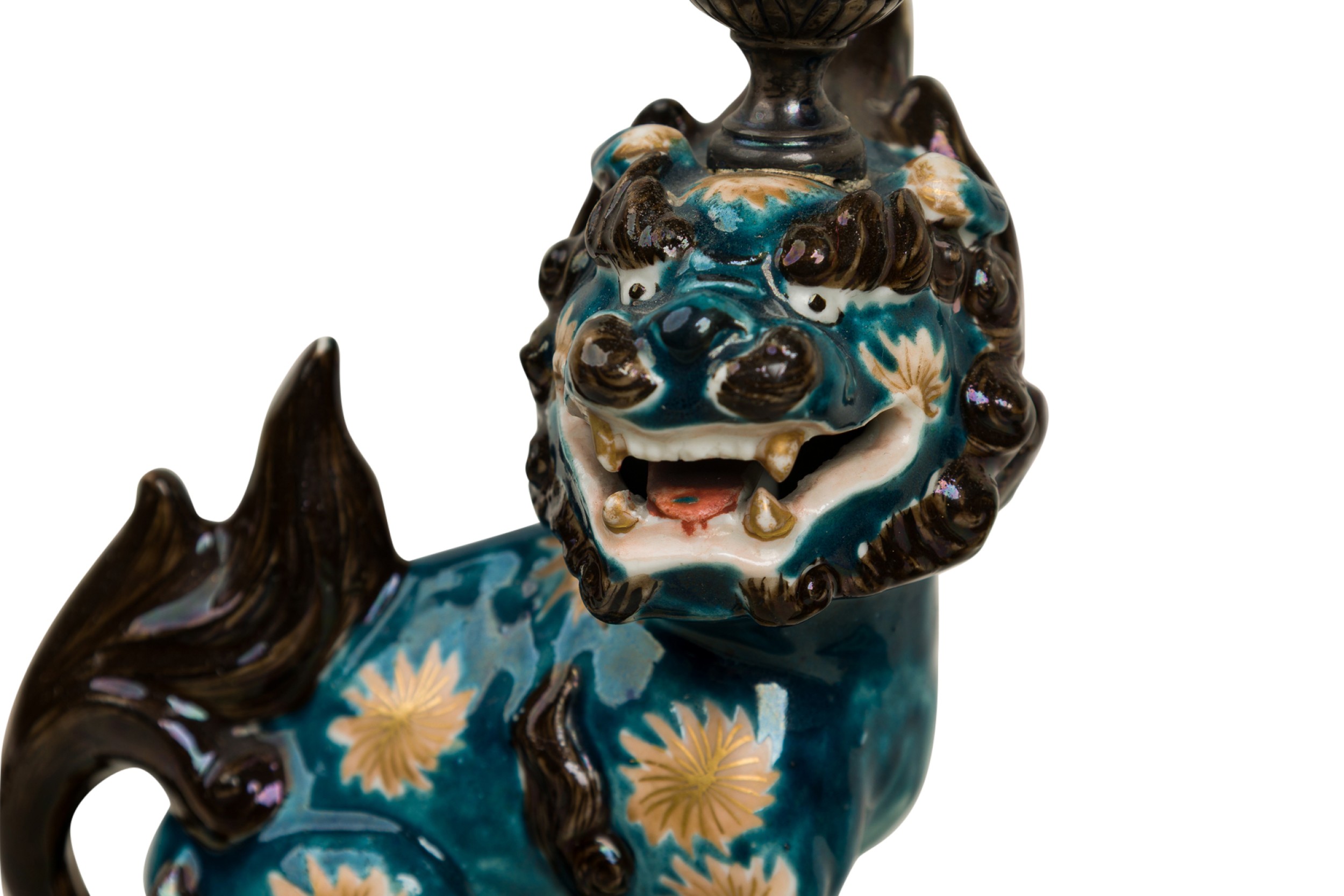 PAIR of Asian Chinese style (19/20th Century) decorative blue-painted porcelain Foo Dog figures with brown floral decoration having silver candlesticks over their heads and seated on stepped plinths with Chinese inscriptions (PRICED AS PAIR)