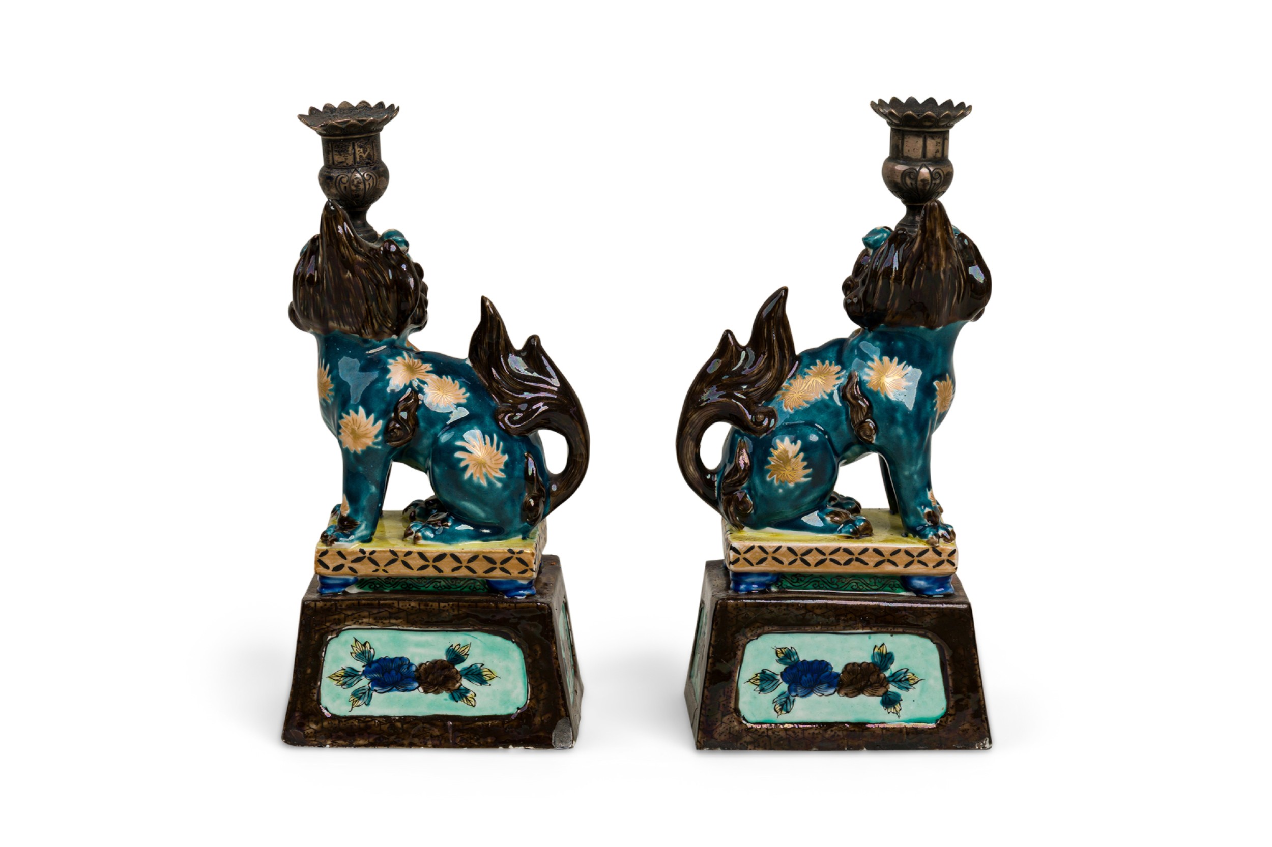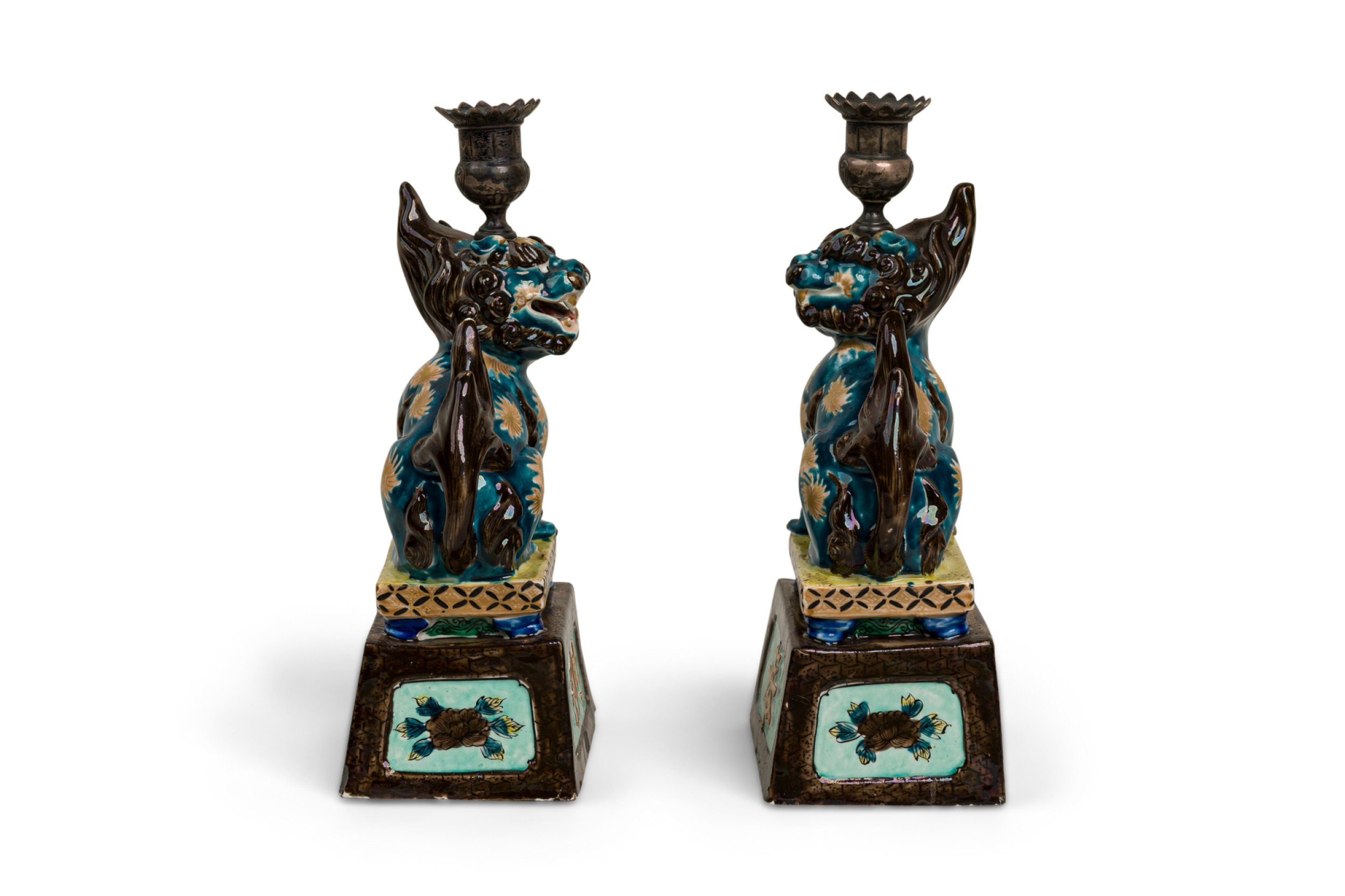 PAIR of Asian Chinese style (19/20th Century) decorative blue-painted porcelain Foo Dog figures with brown floral decoration having silver candlesticks over their heads and seated on stepped plinths with Chinese inscriptions (PRICED AS PAIR).
