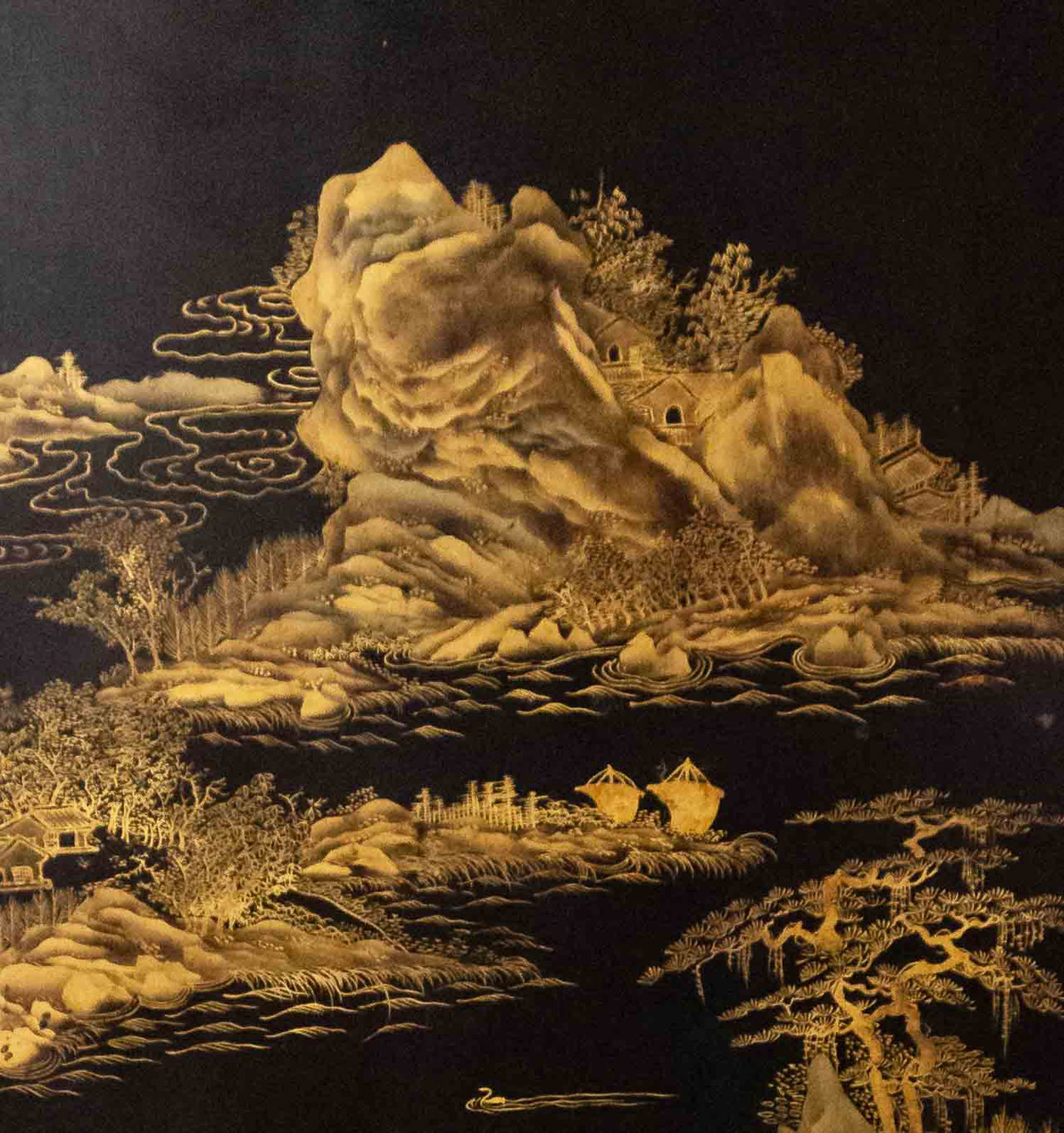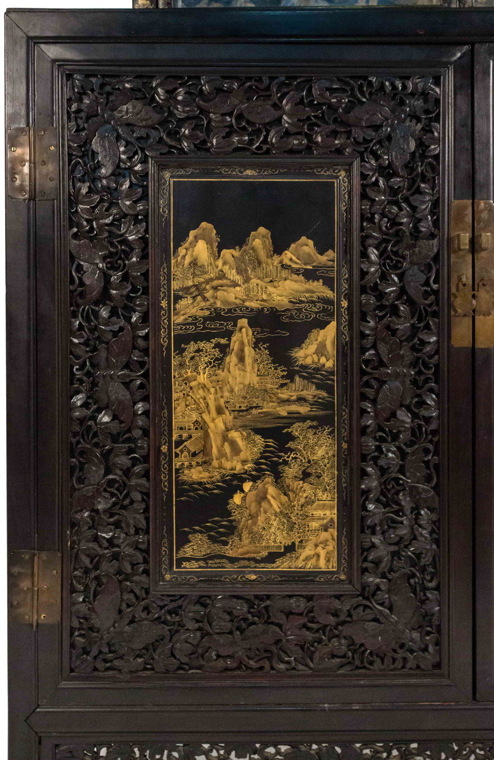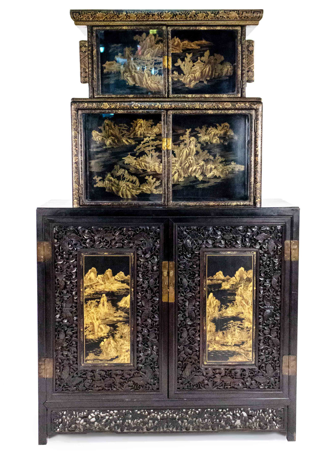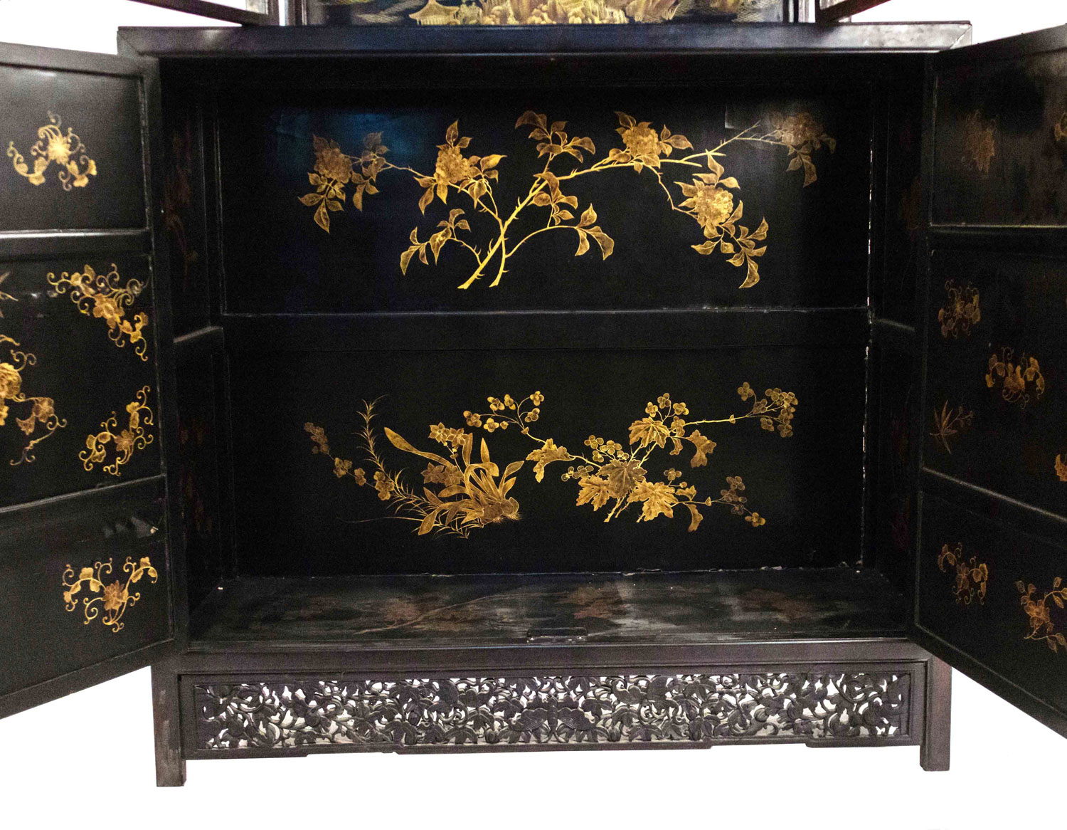 PAIR of Chinese black lacquered (19th Century) three-tiered glass & wooden cabinets decorated with landscape scenes & carved borders with brass hardware & detailed interior (PRICED AS PAIR).