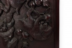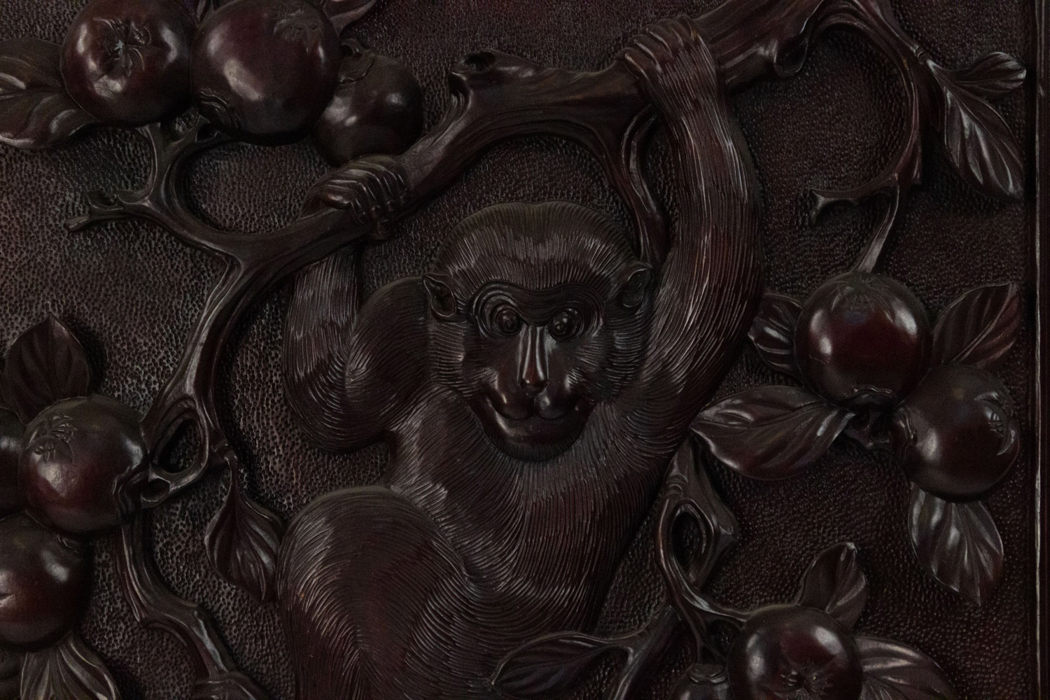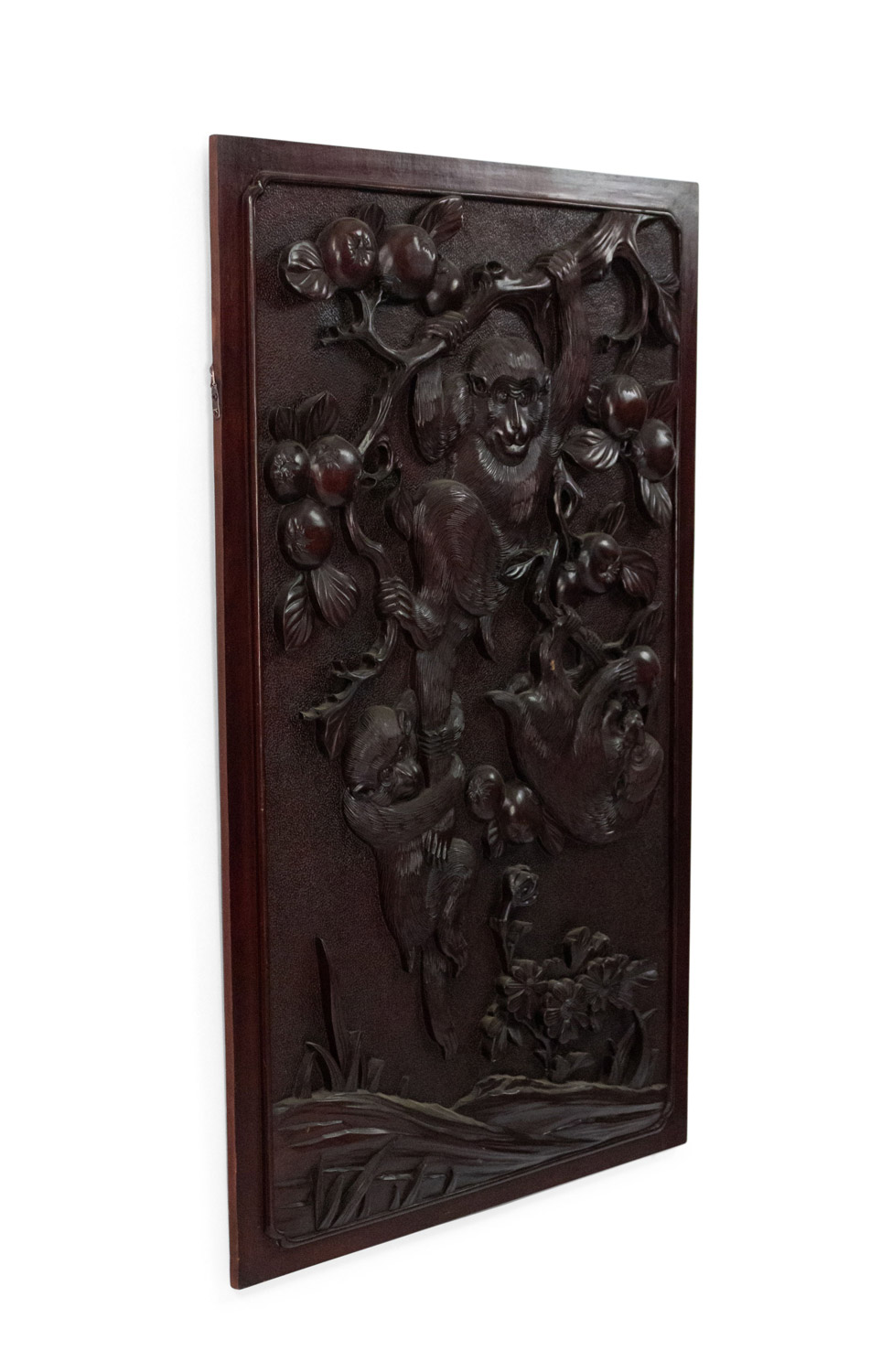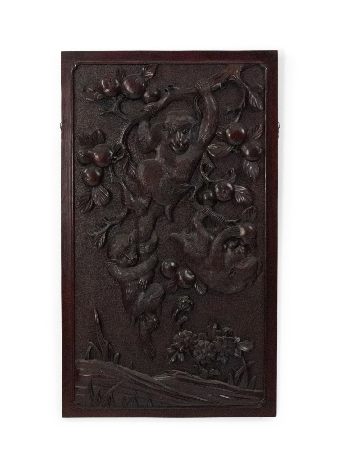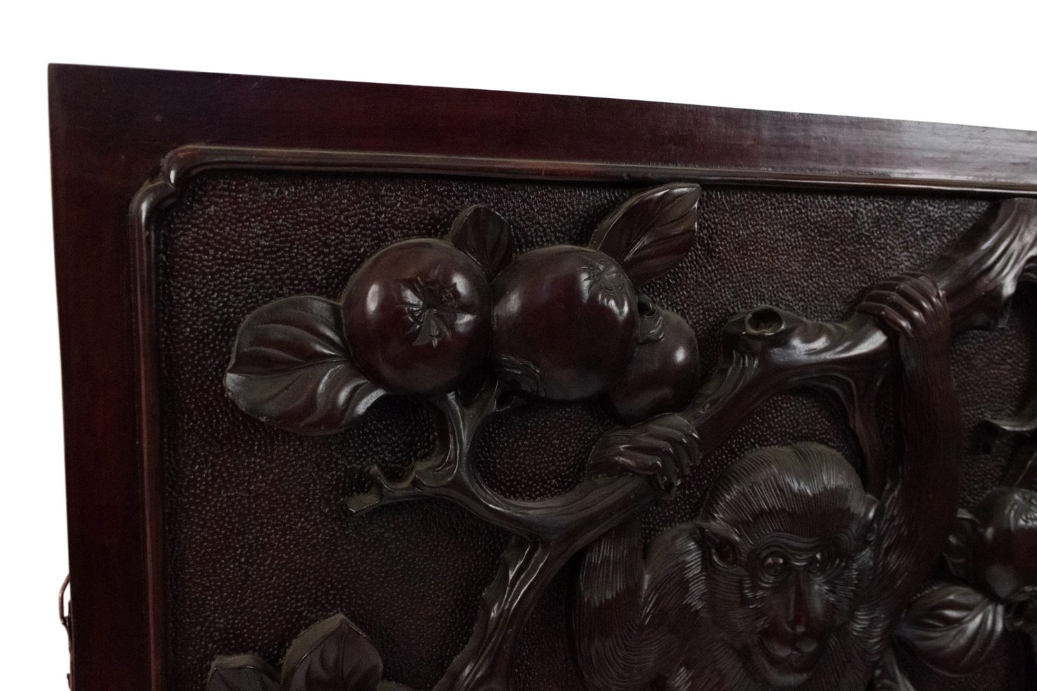 Asian Chinese style (19th Century) carved wall plaque with monkeys playing in trees with fruit (finished on back with bamboo trees).
