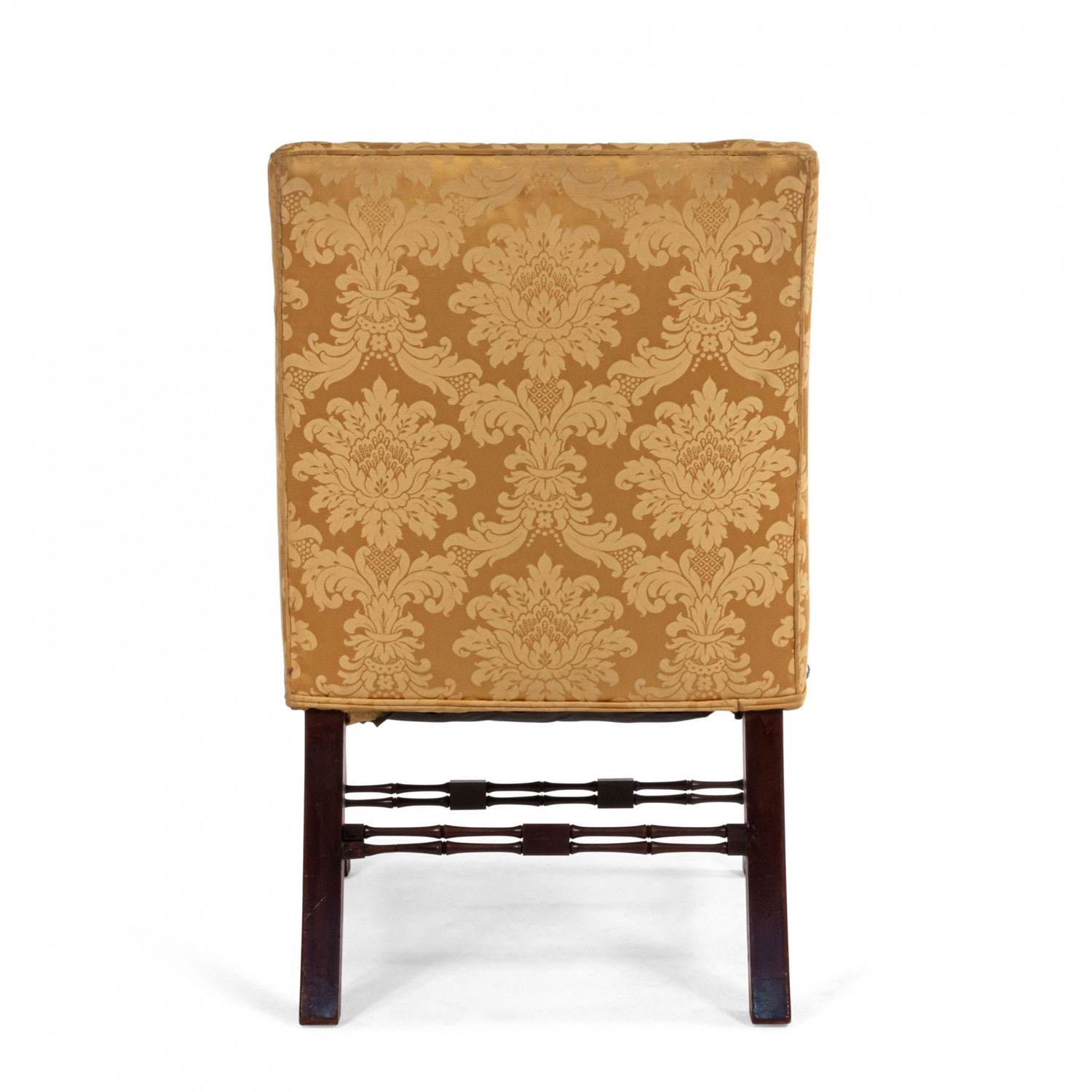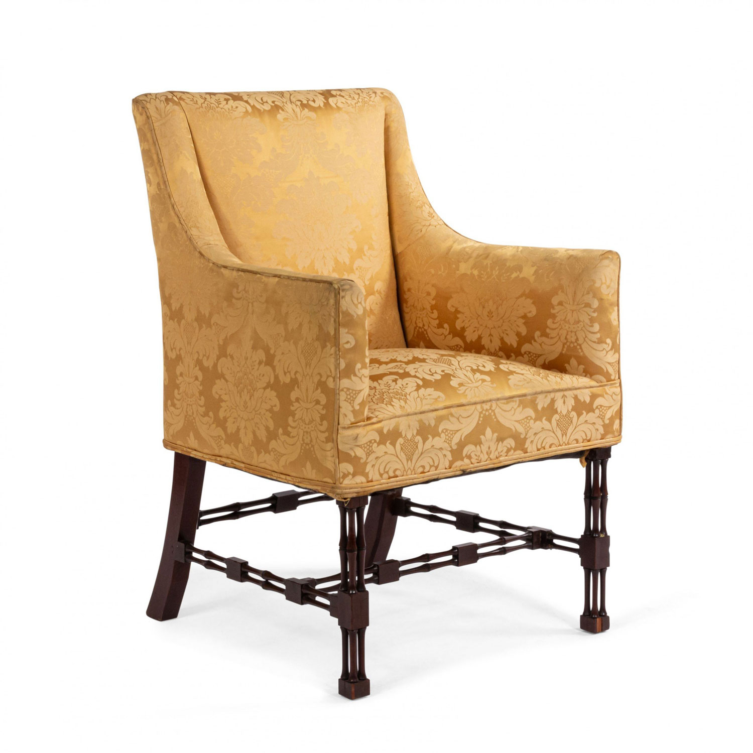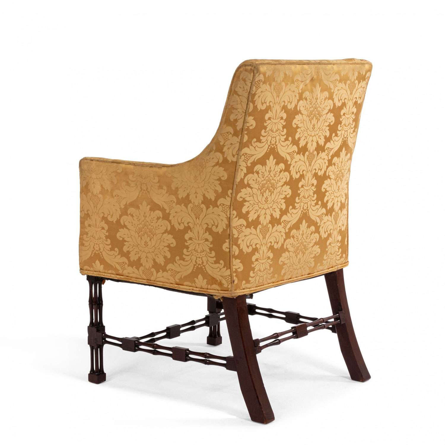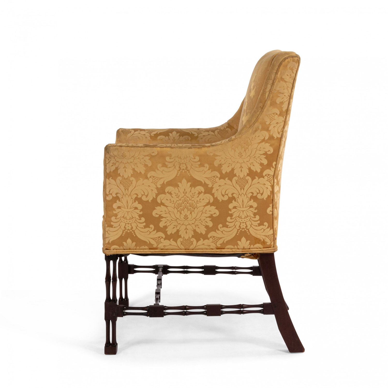PAIR of English Chinese Chippendale-style (19/20th Century) mahogany bergere Armchairs with cluster legs with stretcher and gold damask upholstery (PRICED AS PAIR).