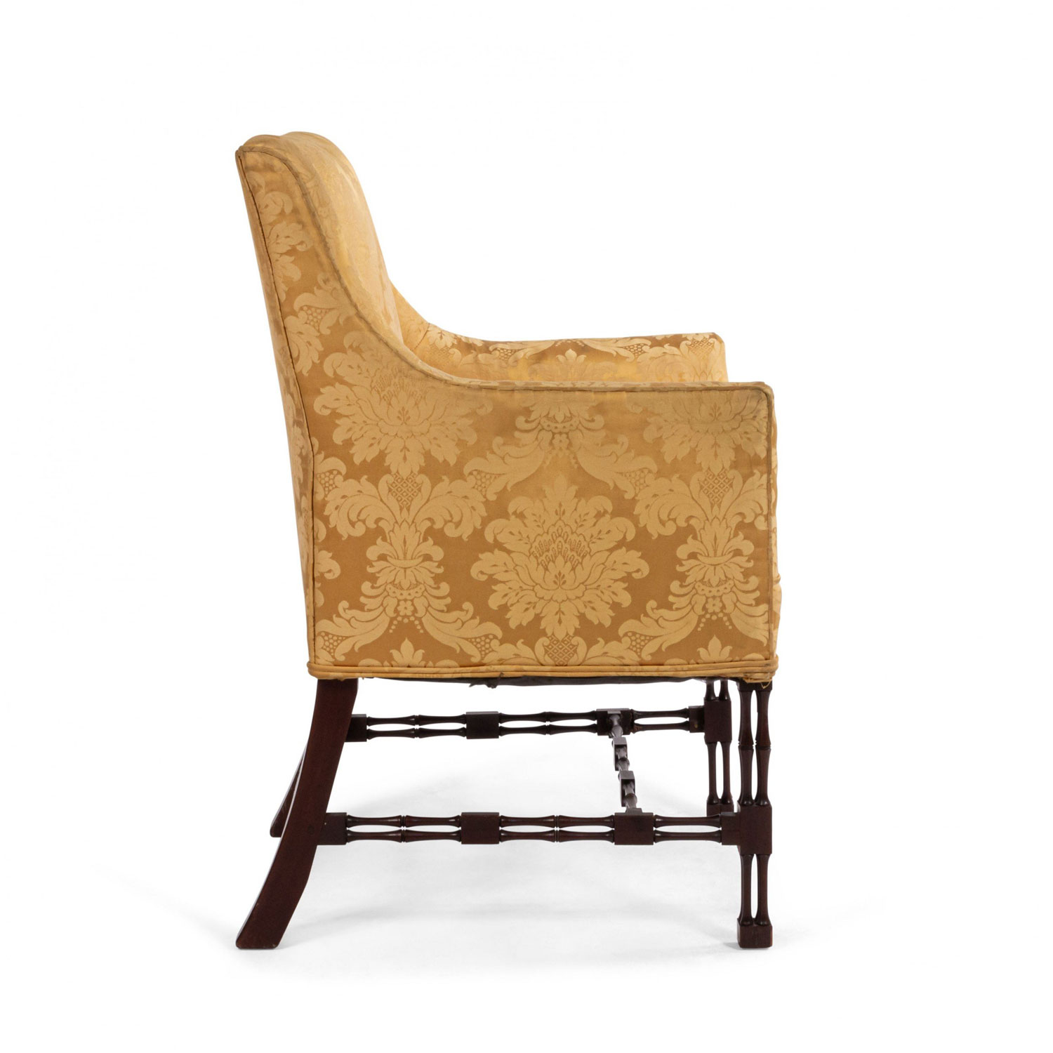 PAIR of English Chinese Chippendale-style (19/20th Century) mahogany bergere Armchairs with cluster legs with stretcher and gold damask upholstery (PRICED AS PAIR)