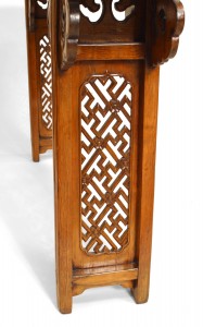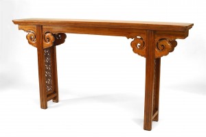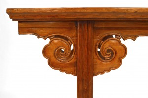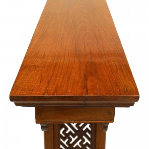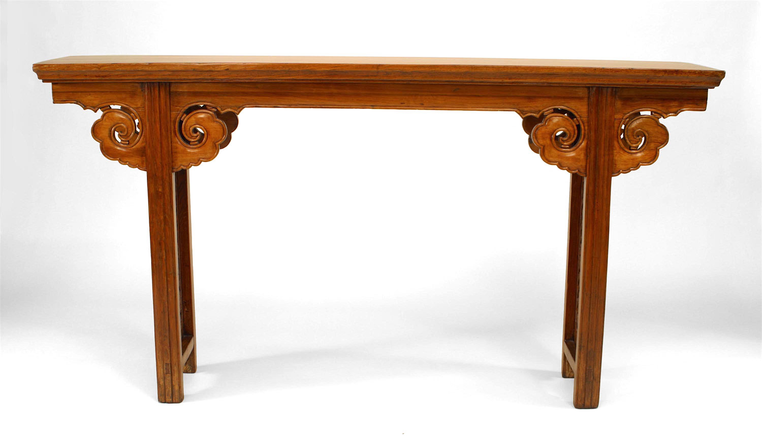 Chinese (18th Century) elmwood (yu-mu) narrow altar style console table with intrically carved geometric design end panels with fluted legs and cloud shaped scroll form spandrels on apron.