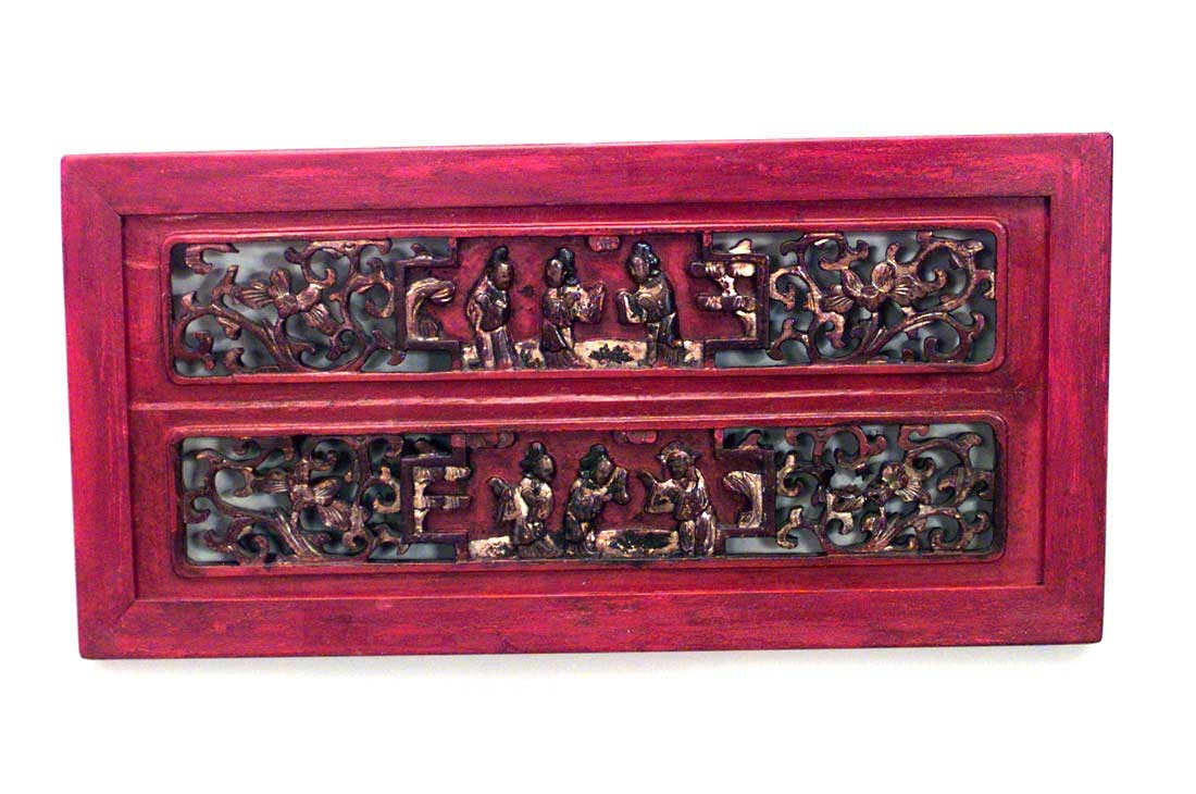 Asian Chinese style (19th Century) red lacquered and gilt trimmed wall plaque with 2 filigree carved panels..