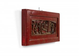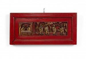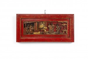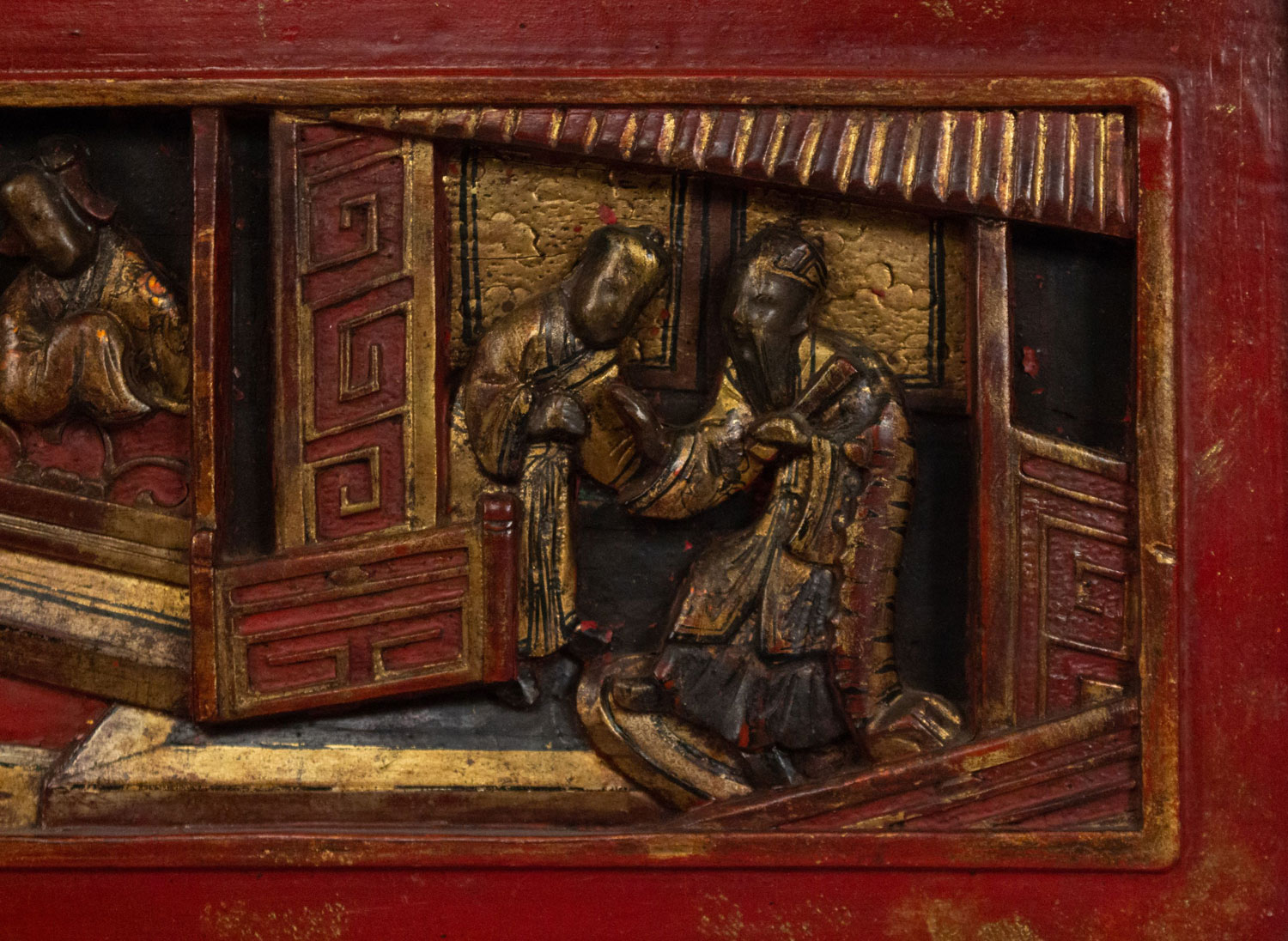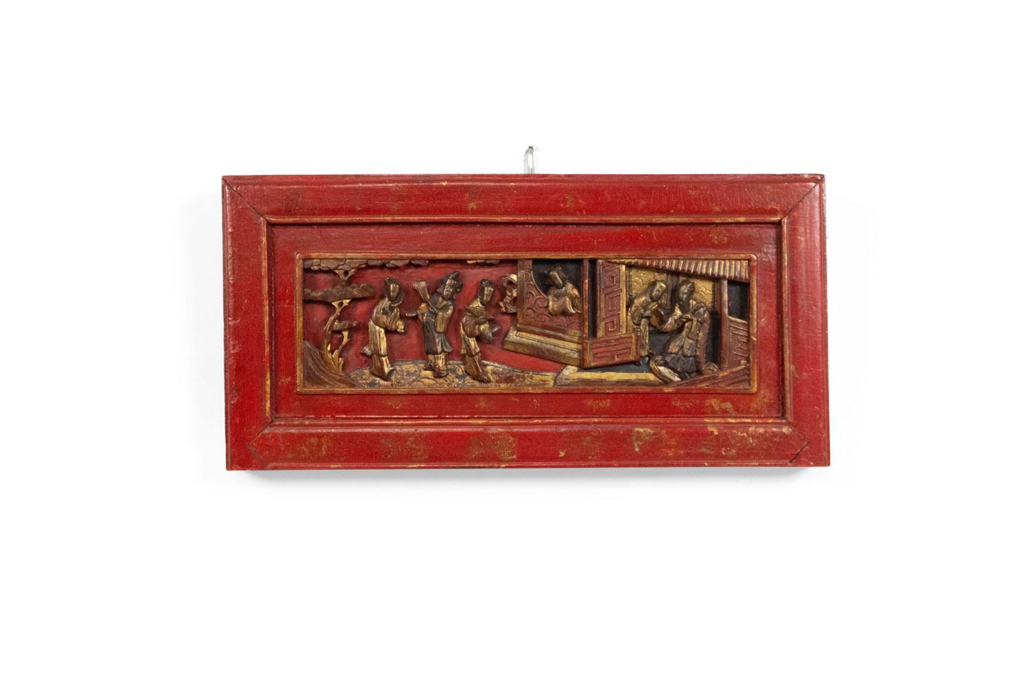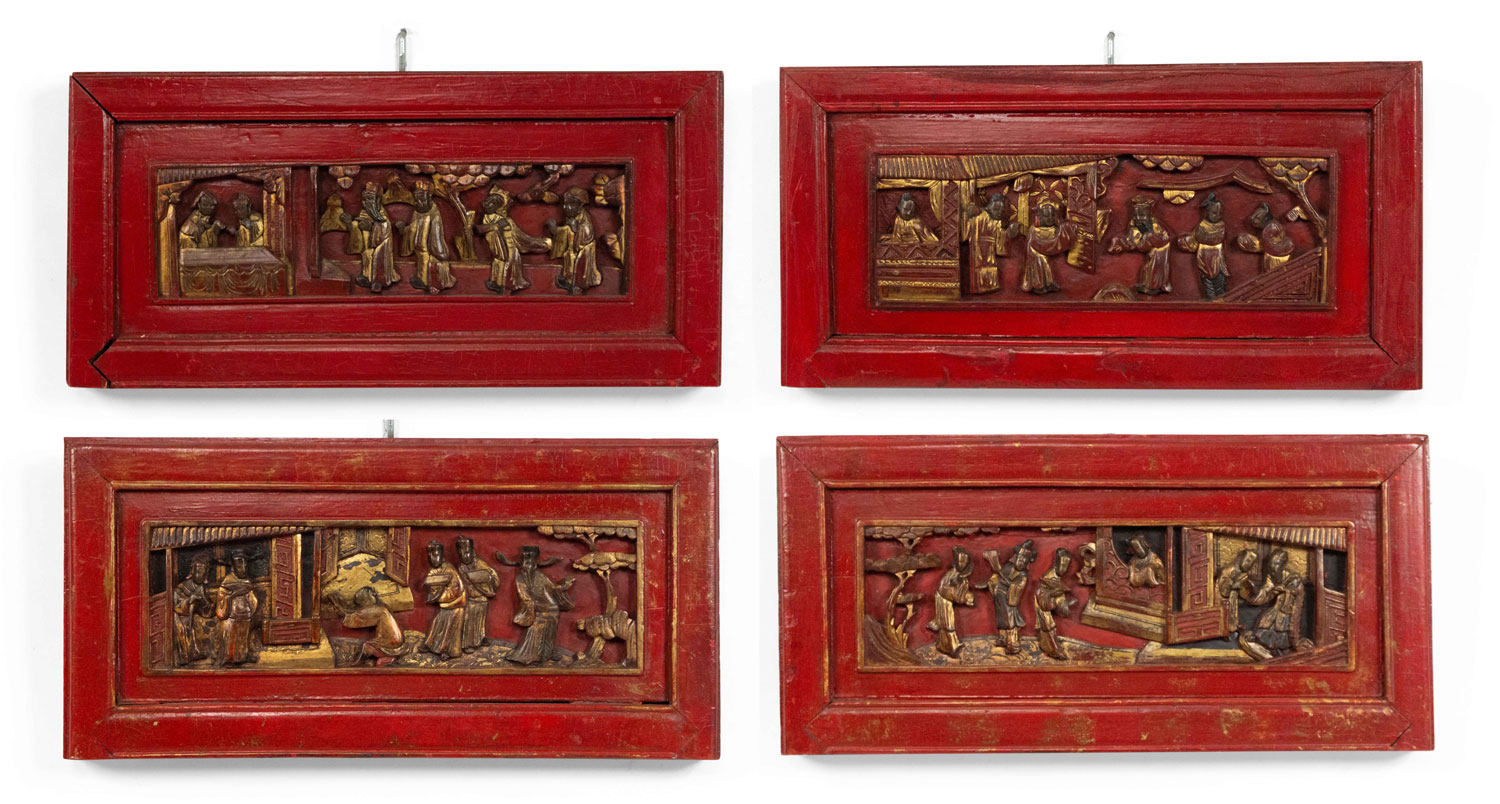 4 Asian Chinese style (19th Century) red lacquered and gilt trimmed wall plaques with carved scenes with figures.