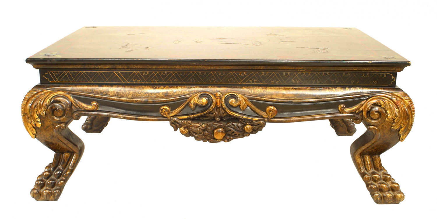 Asian Chinese-style (19/20th Century) carved and lacquered coffee table with a rectangular top featuring a landscape scene with figures and a floral border supported on cabriole claw form legs.