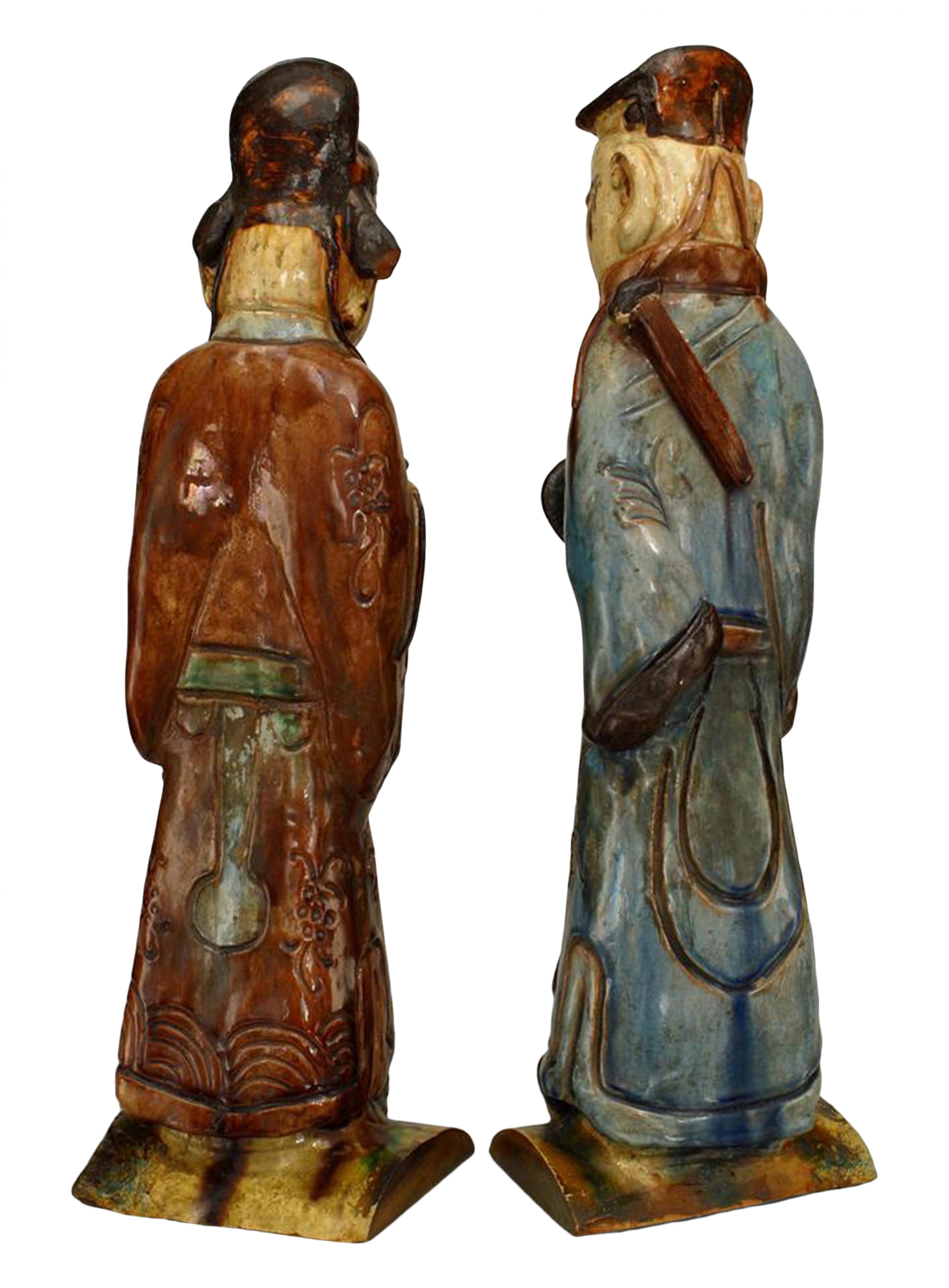 PAIR of Asian Chinese style (early 20th Cent) Shekwan pottery (roof ornament) figures of 2 men wearing a rust and blue/grey colored robes (PRICED AS PAIR)