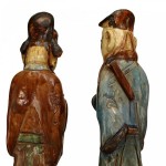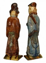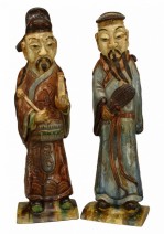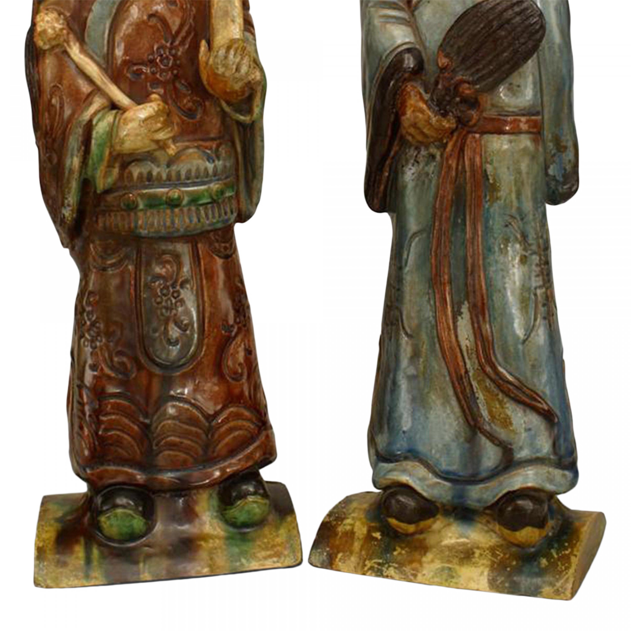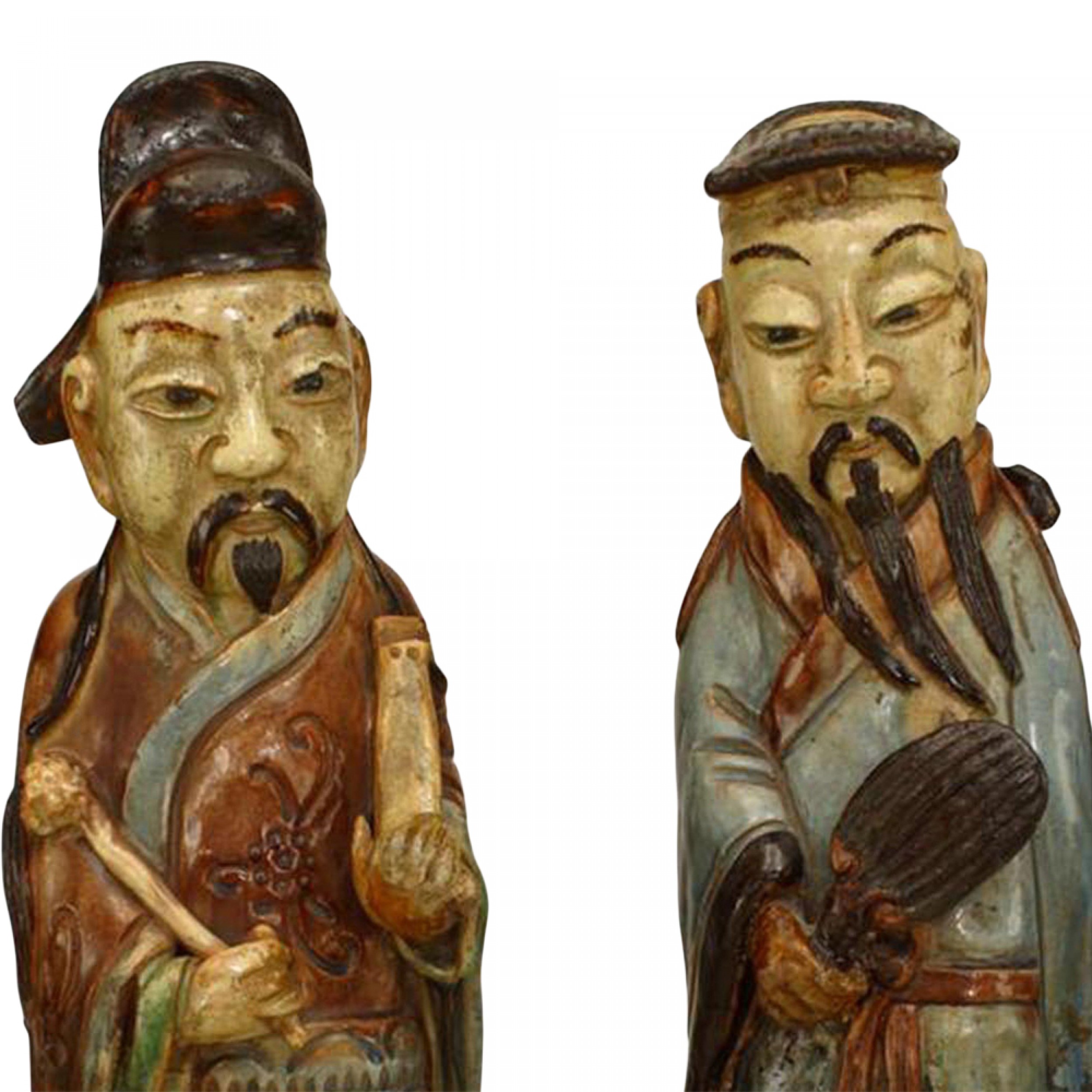 PAIR of Asian Chinese style (early 20th Cent) Shekwan pottery (roof ornament) figures of 2 men wearing a rust and blue/grey colored robes (PRICED AS PAIR).