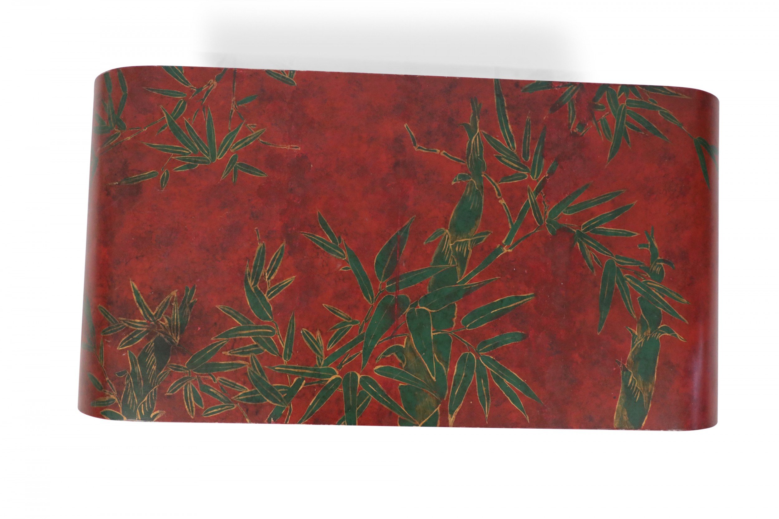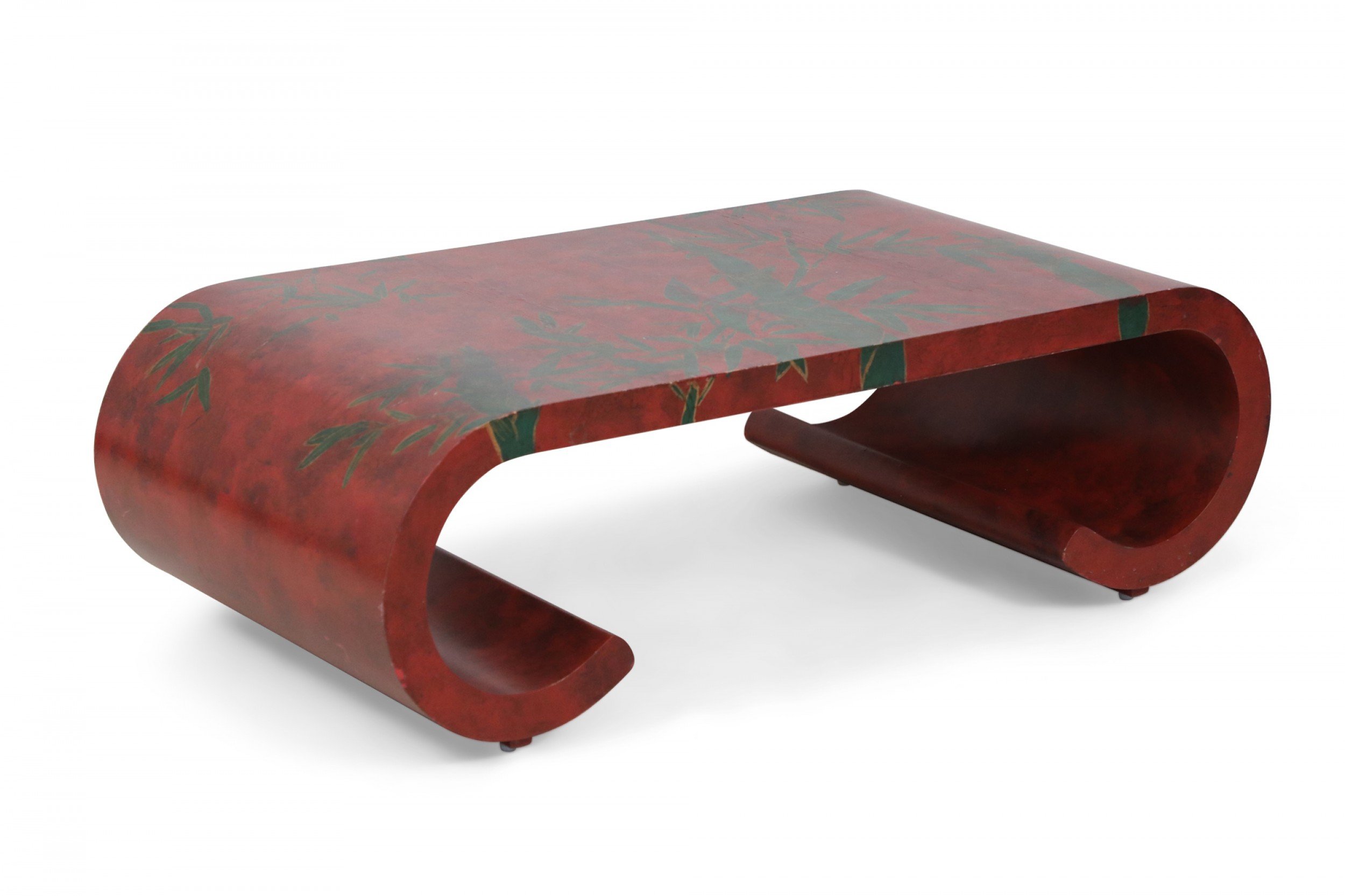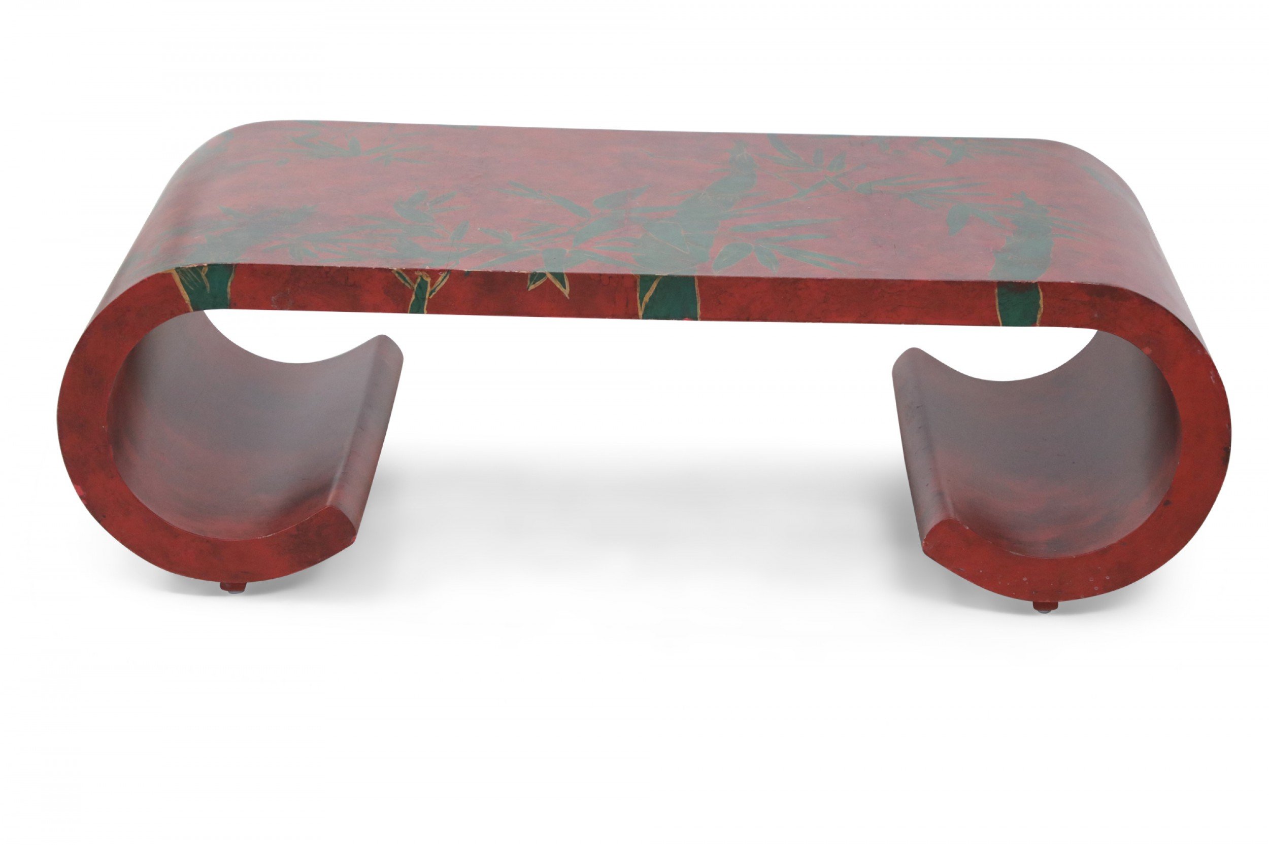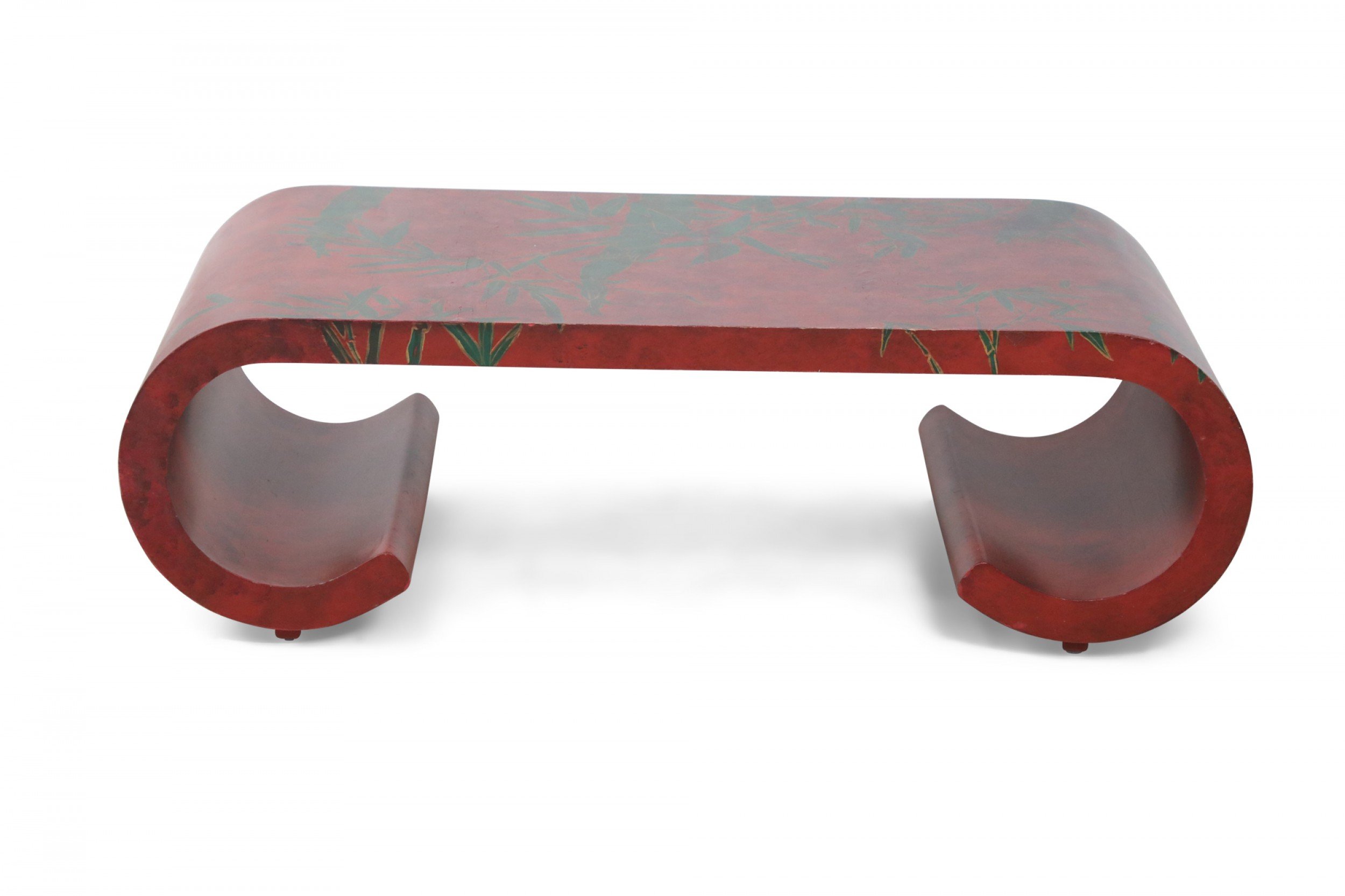 Chinese red lacquered, low scroll side coffee table painted with a muted green bamboo leaf motif, outlined in gold across the surface.