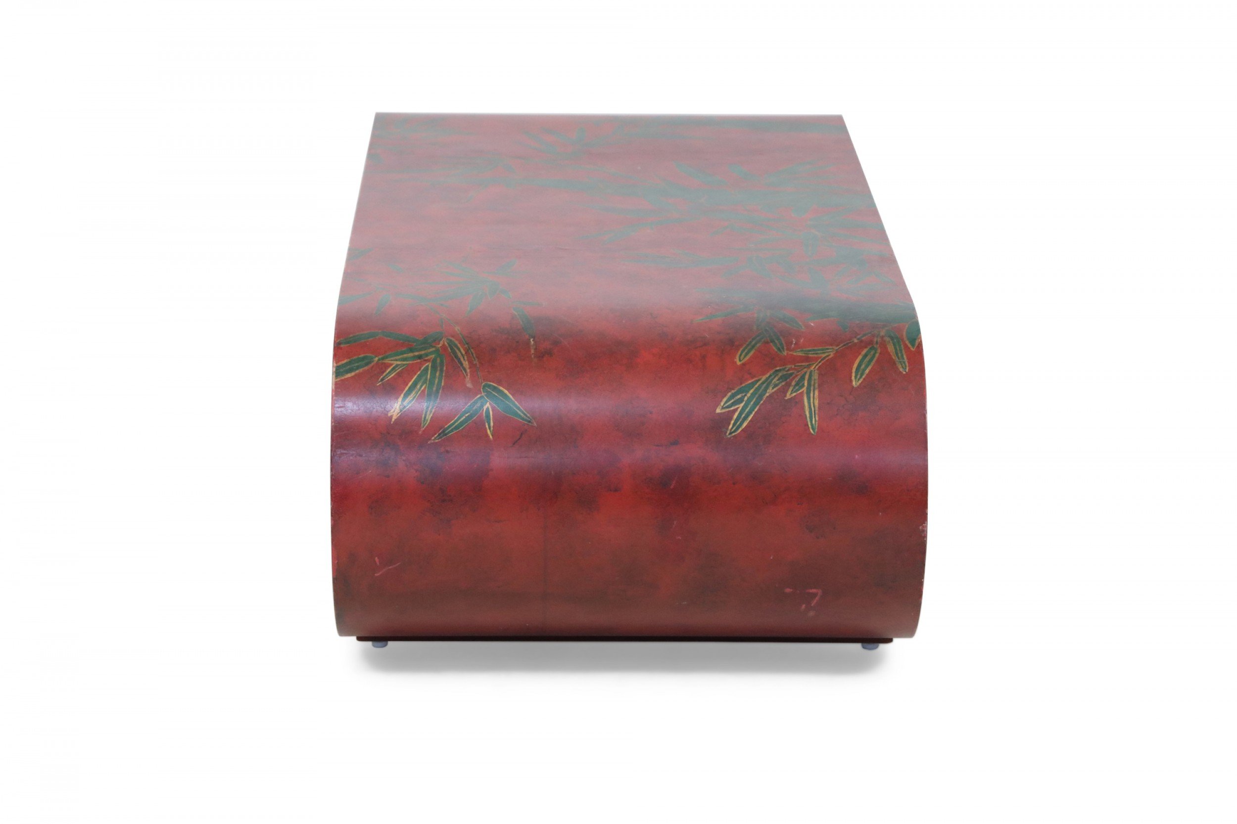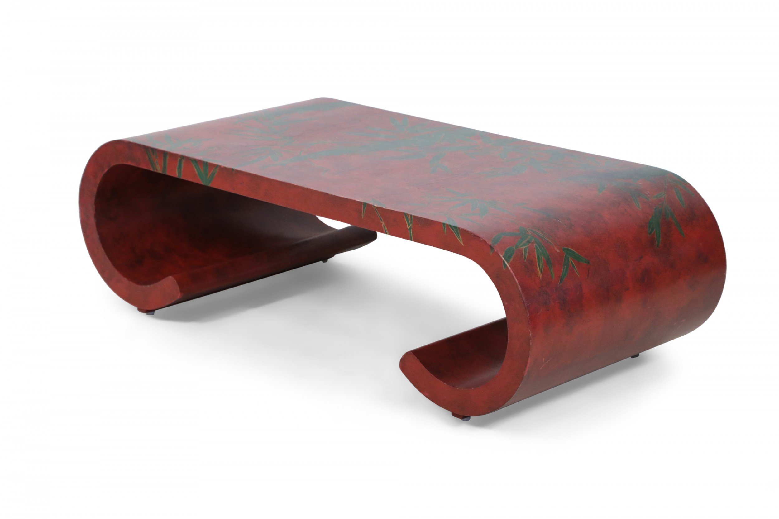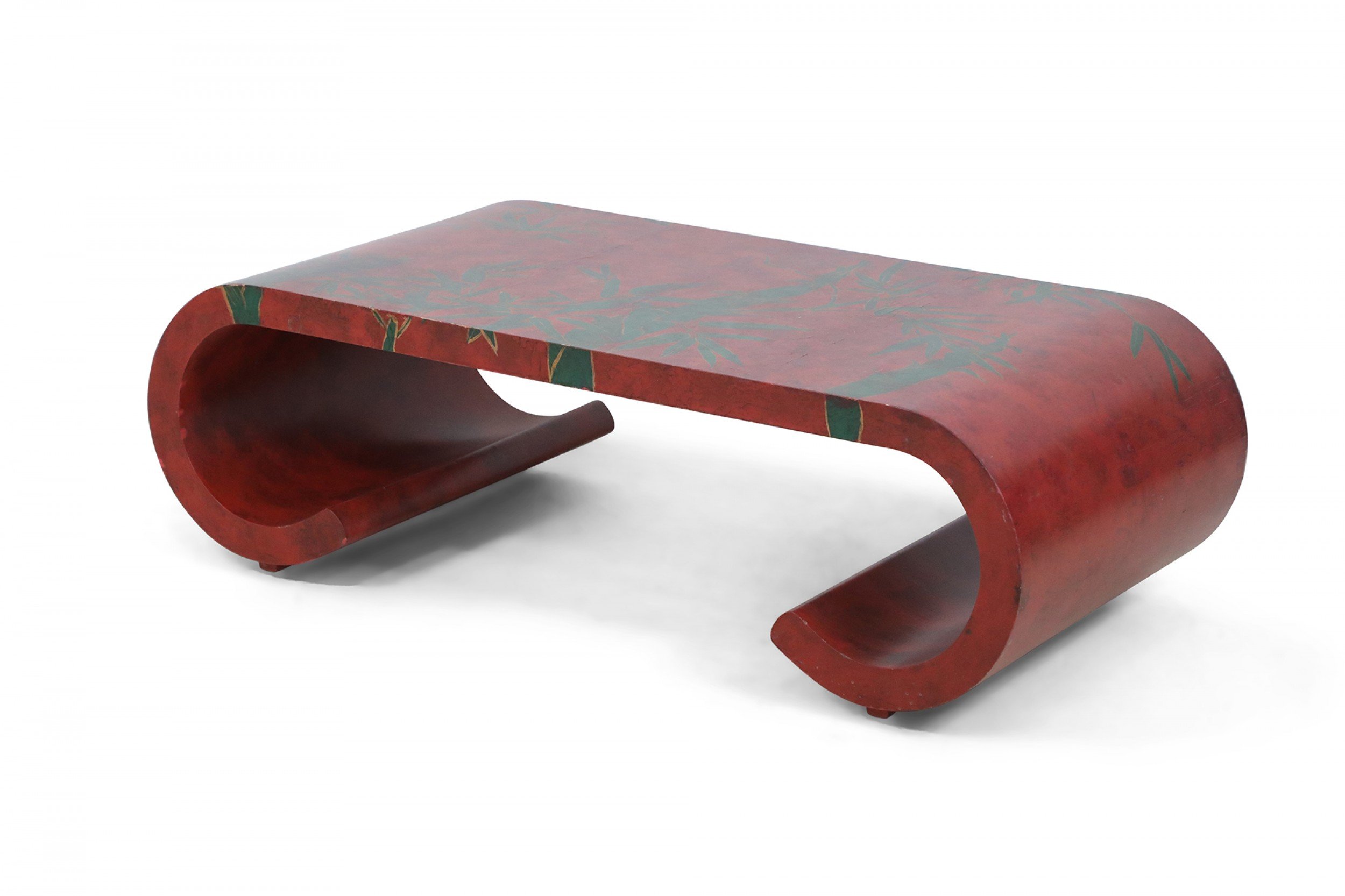 Chinese red lacquered, low scroll side coffee table painted with a muted green bamboo leaf motif, outlined in gold across the surface.
