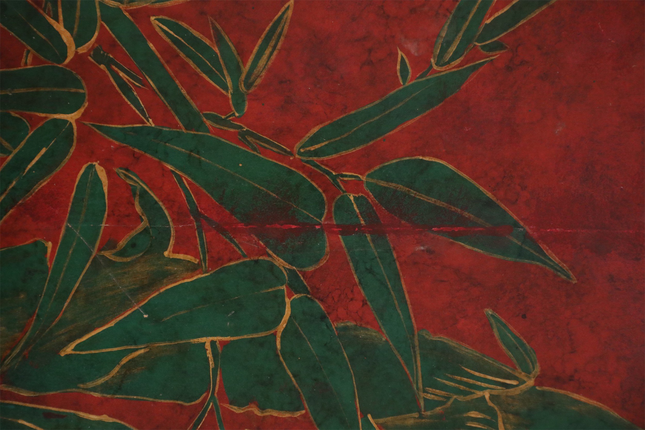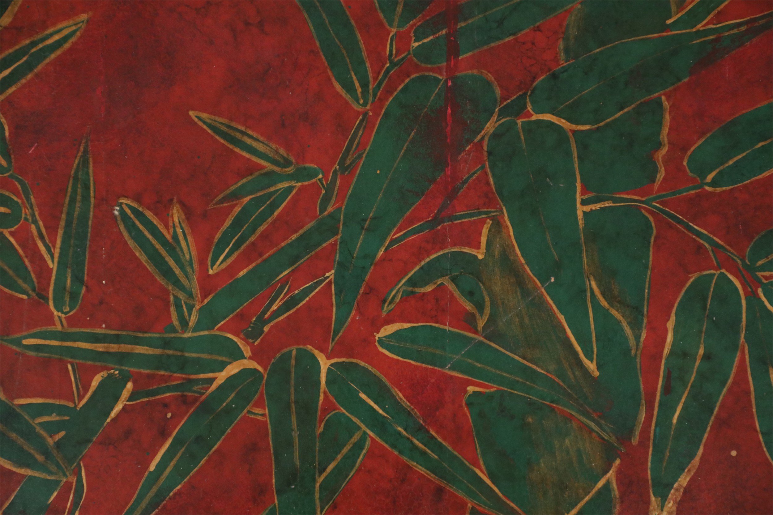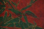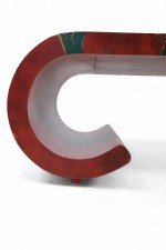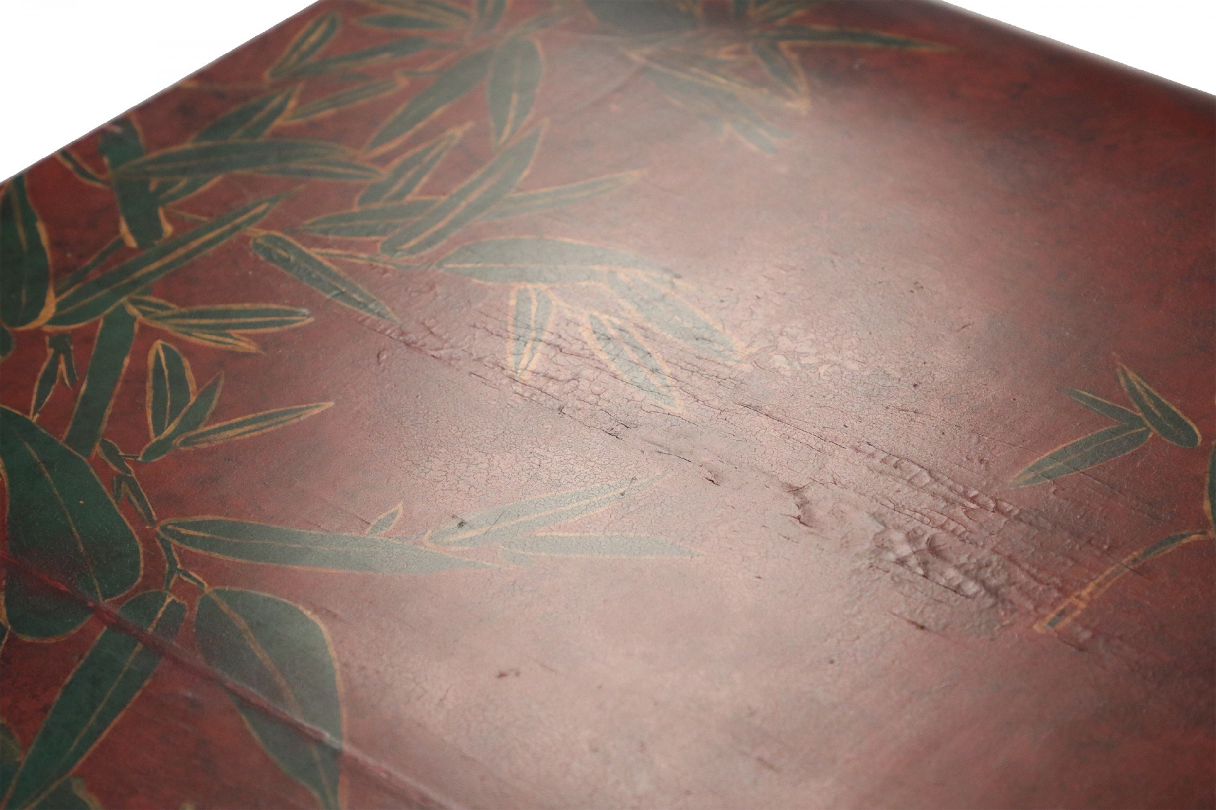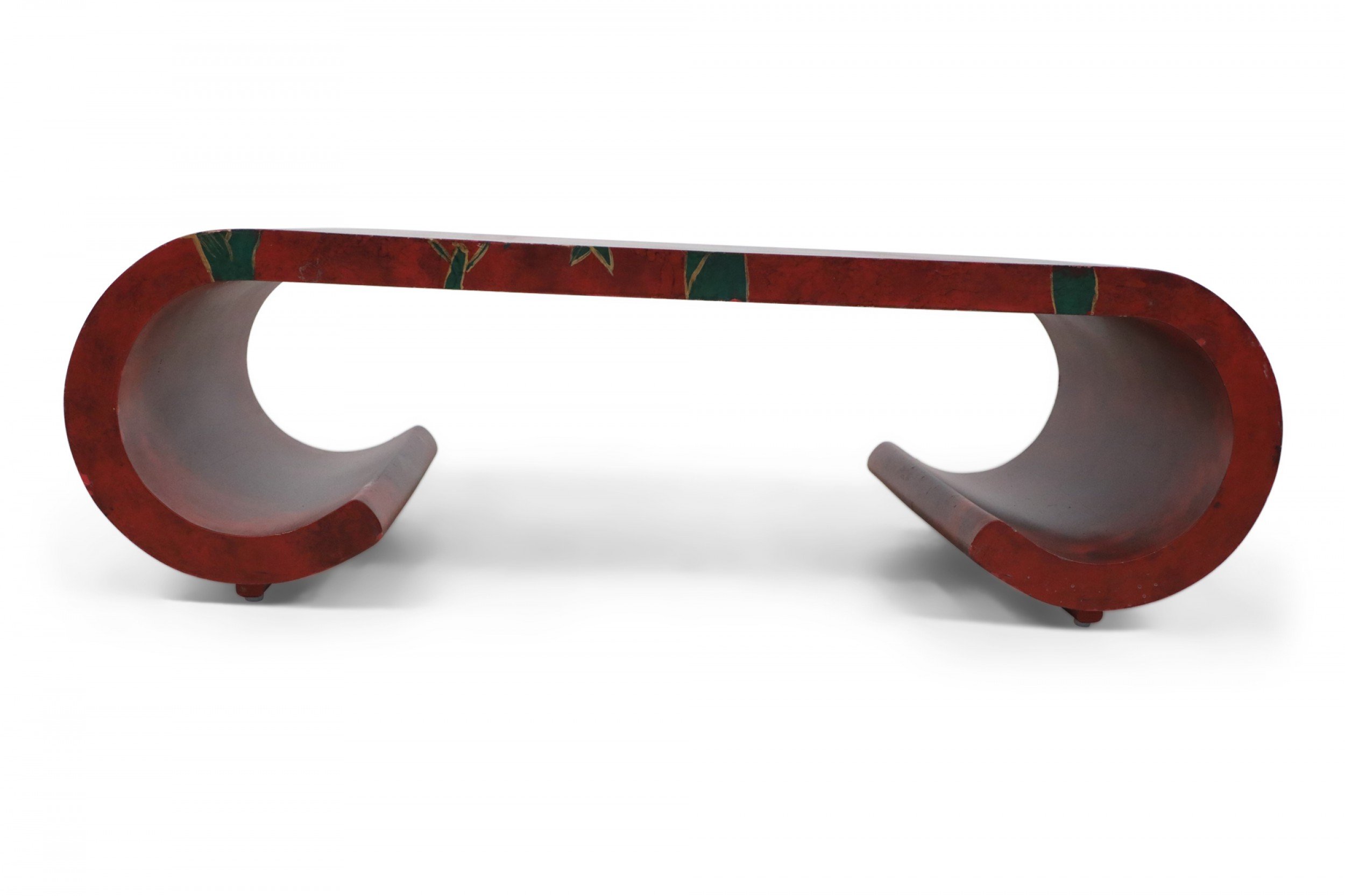 Chinese red lacquered, low scroll side coffee table painted with a muted green bamboo leaf motif, outlined in gold across the surface.