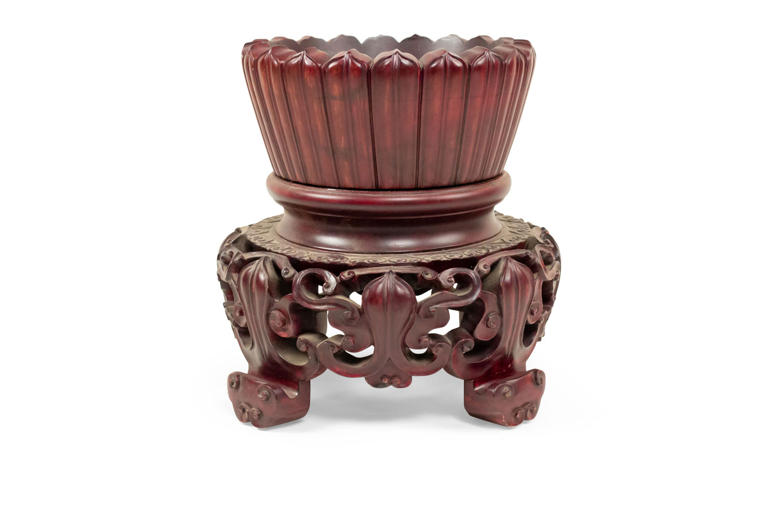 Asian Chinese-style rosewood jardiniere stand with a fluted lotus design over a carved filigree round base with 4 feet..