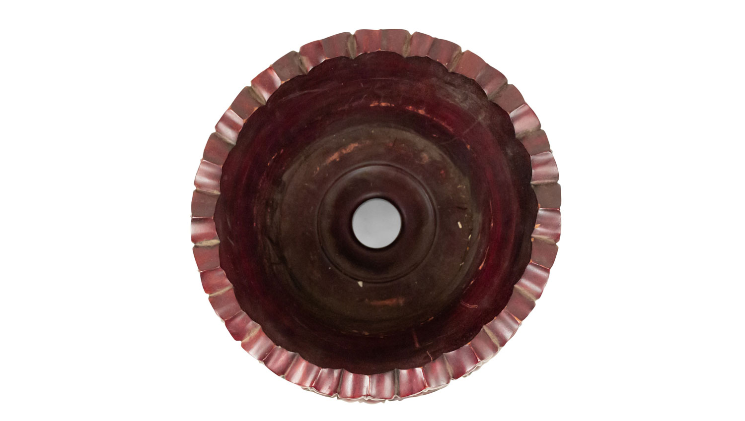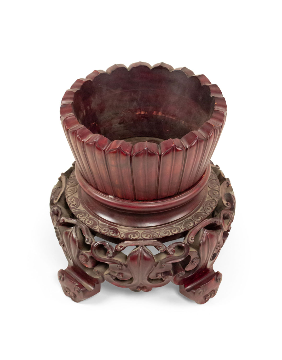 Asian Chinese-style rosewood jardiniere stand with a fluted lotus design over a carved filigree round base with 4 feet.