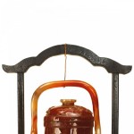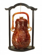 Asian Chinese rust agate (vessel) urn with a carving in relief and ring sides holding a loop handle with a cover having carved bats. (modern hanging stand 8½"w x 11¾"h).