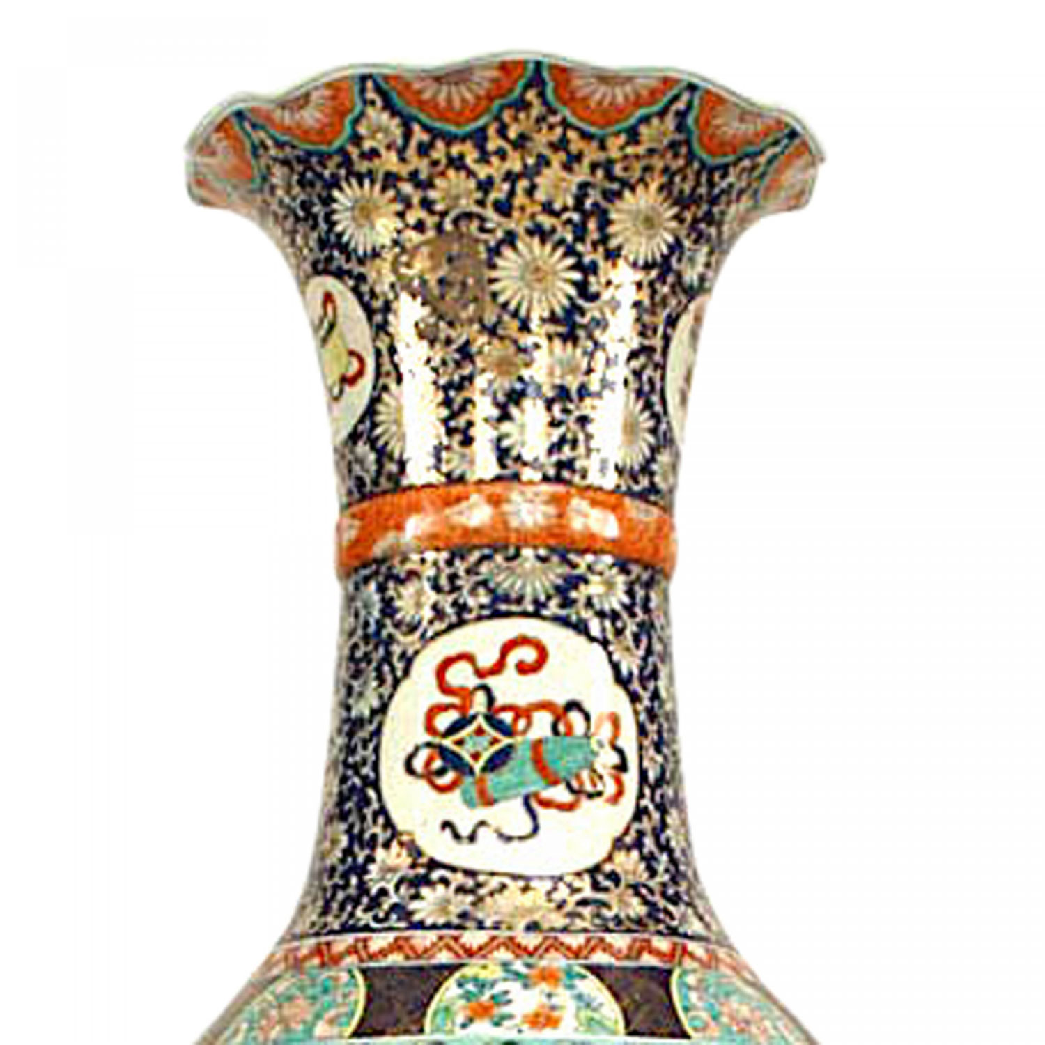 Asian Chinese style (19/20th Cent) monumental porcelain floor vase with orange, blue & white colors and floral decoration with scalloped top.