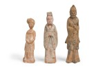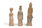 ***Auction Hold***Group of (2) Chinese Terracotta Figures and (2) Stone Warriors***Auction Hold*** SET of 3 Chinese terracotta standing figurines in the style of Tang dynasty tomb figures (in graduated heights: woman, man, warrior) (PRICED AS SET)