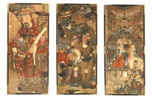 Set of 3 Asian Chinese (18/19th Cent) watercolor portraits each with 2 elaborately costumed figures in gilt trimmed frames.