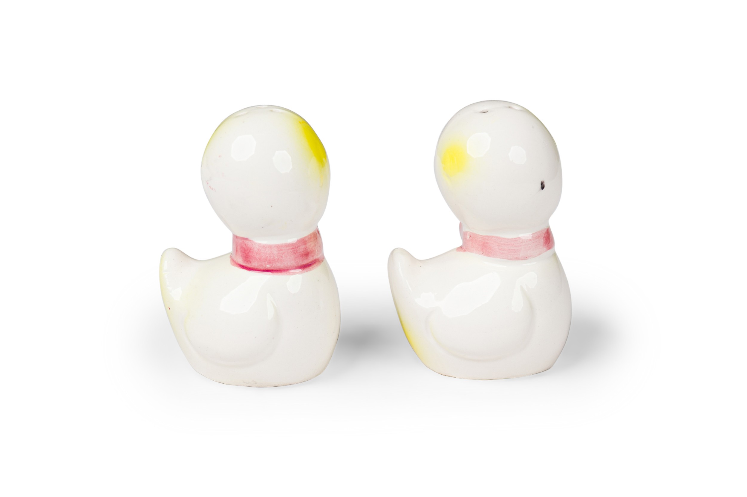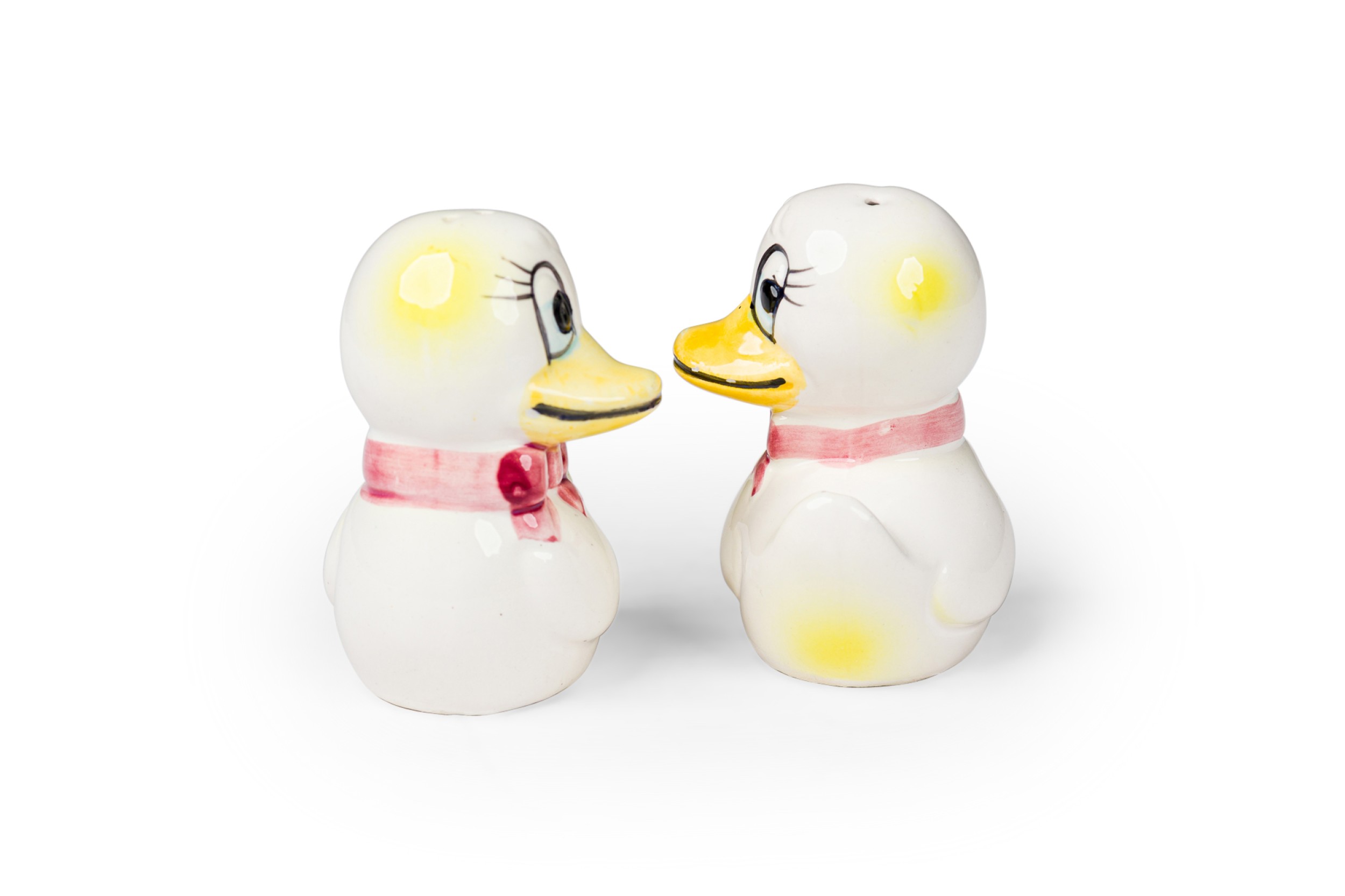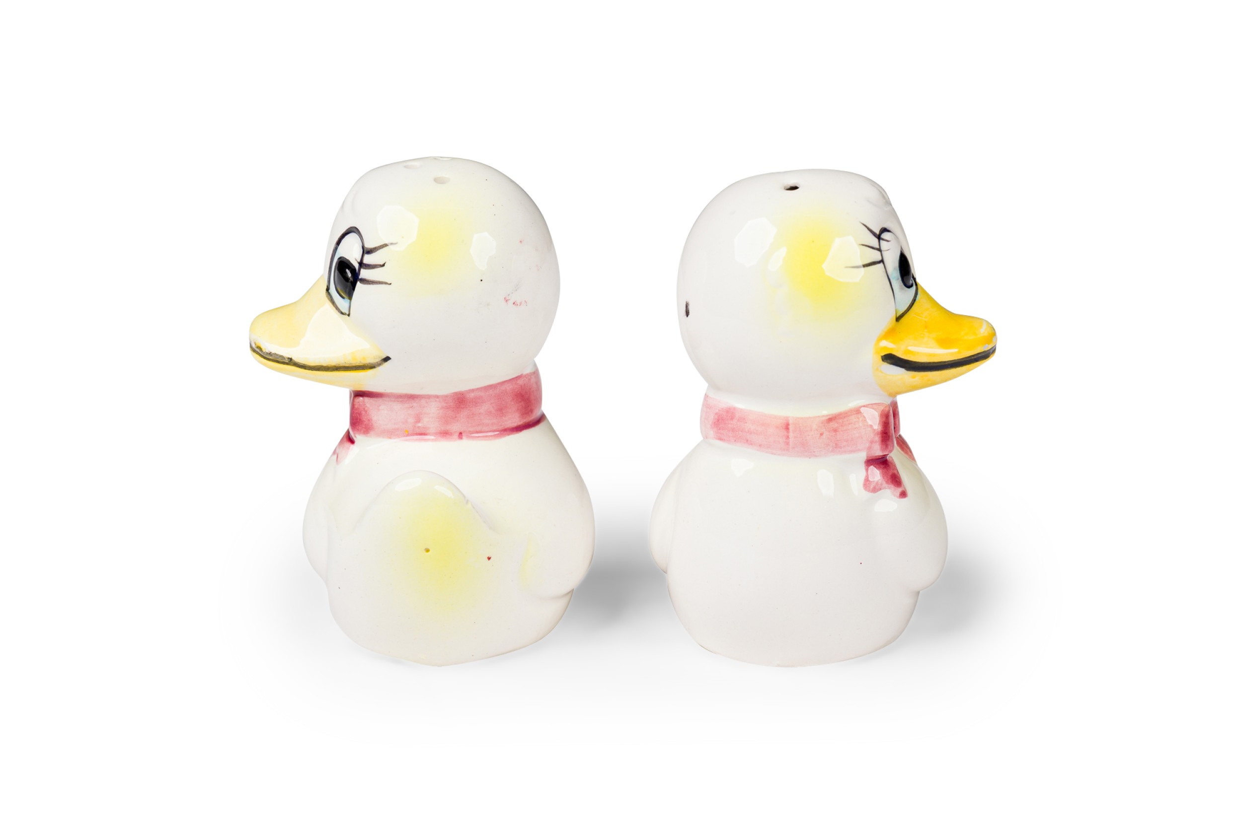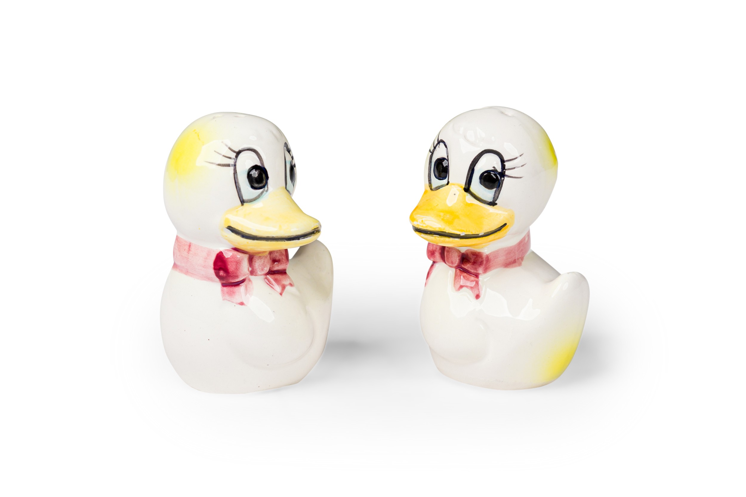 =American Contemporary bow tied duck figurine salt & pepper shakers on a circular base (ENESCO).