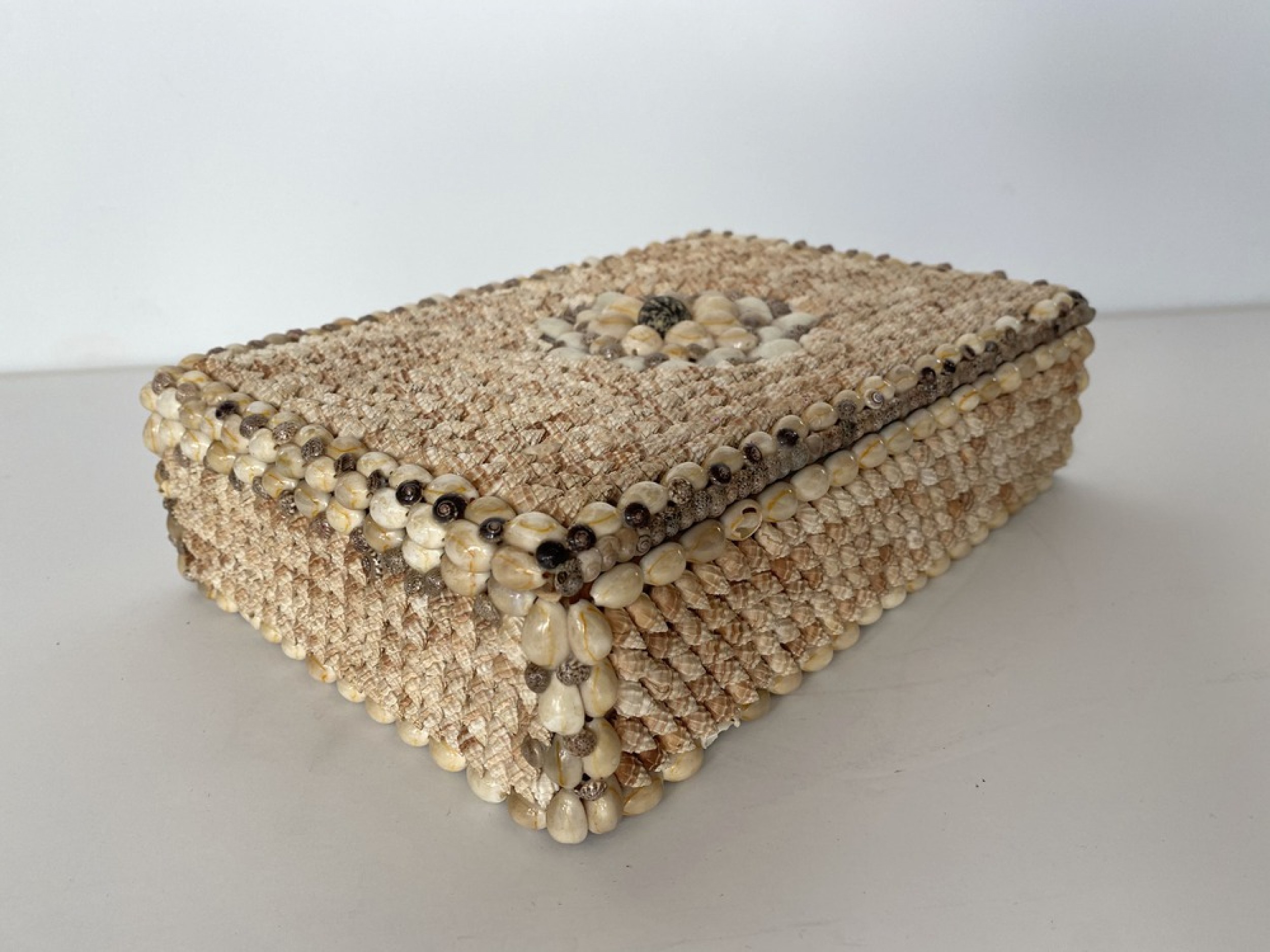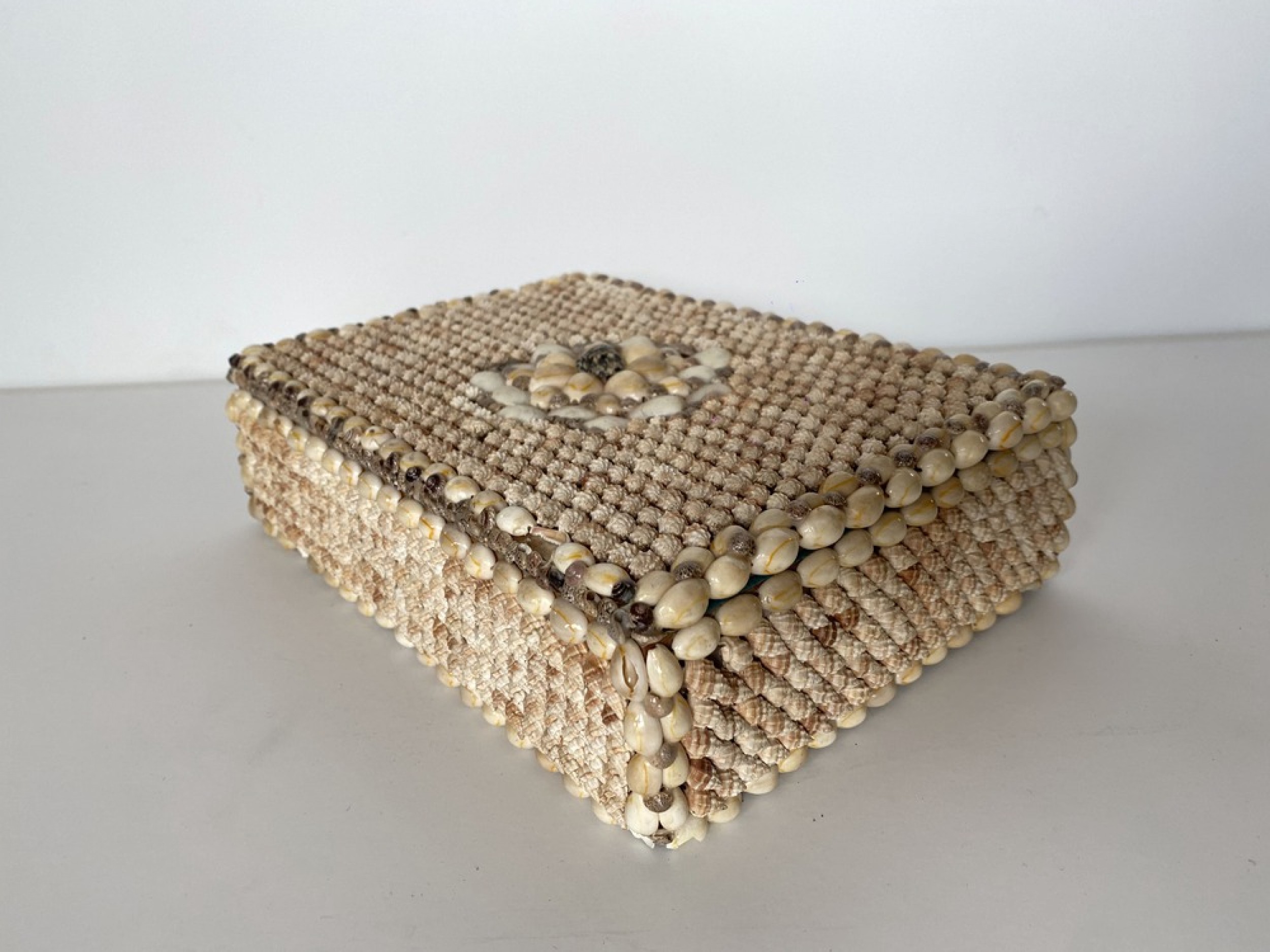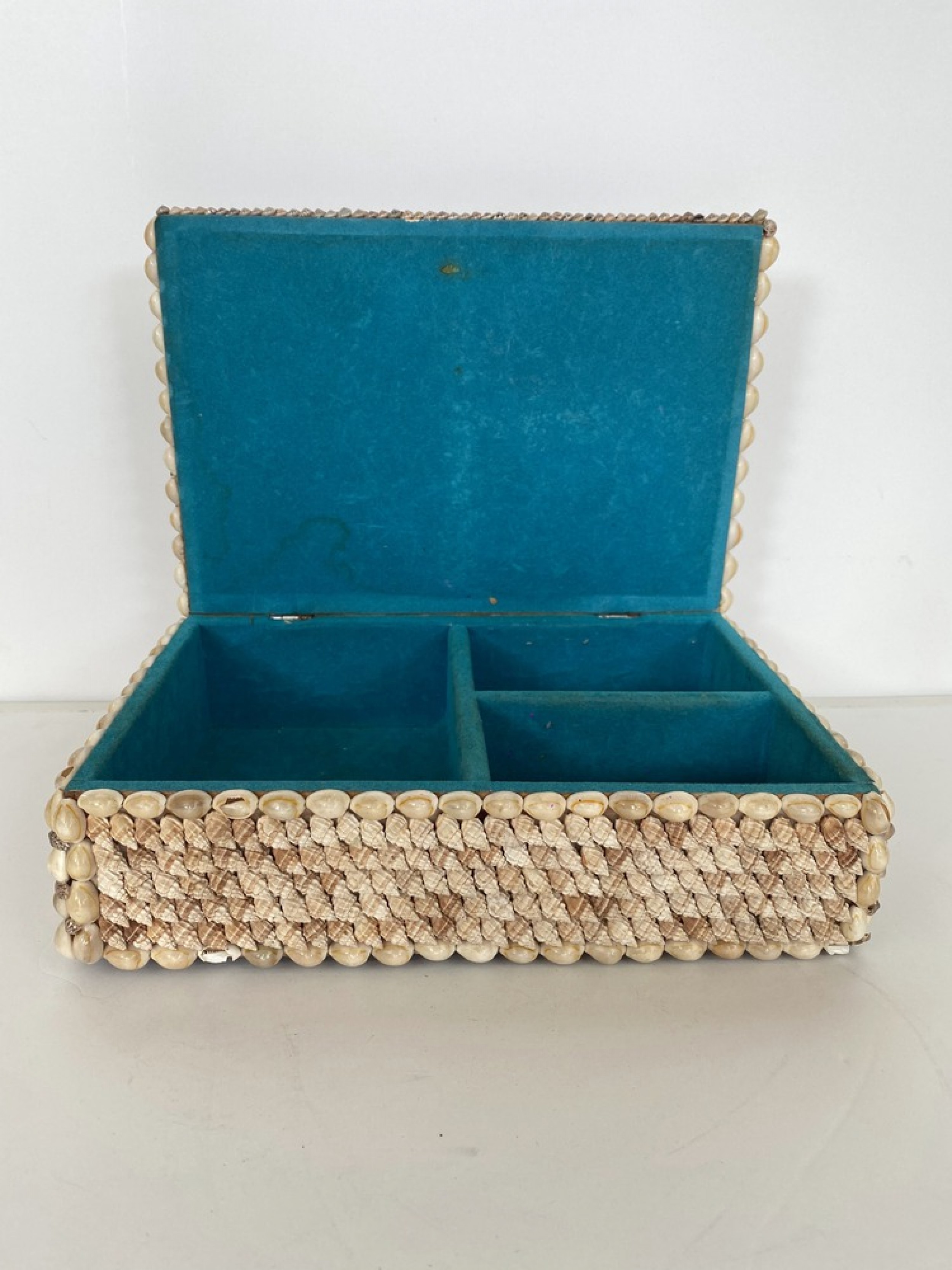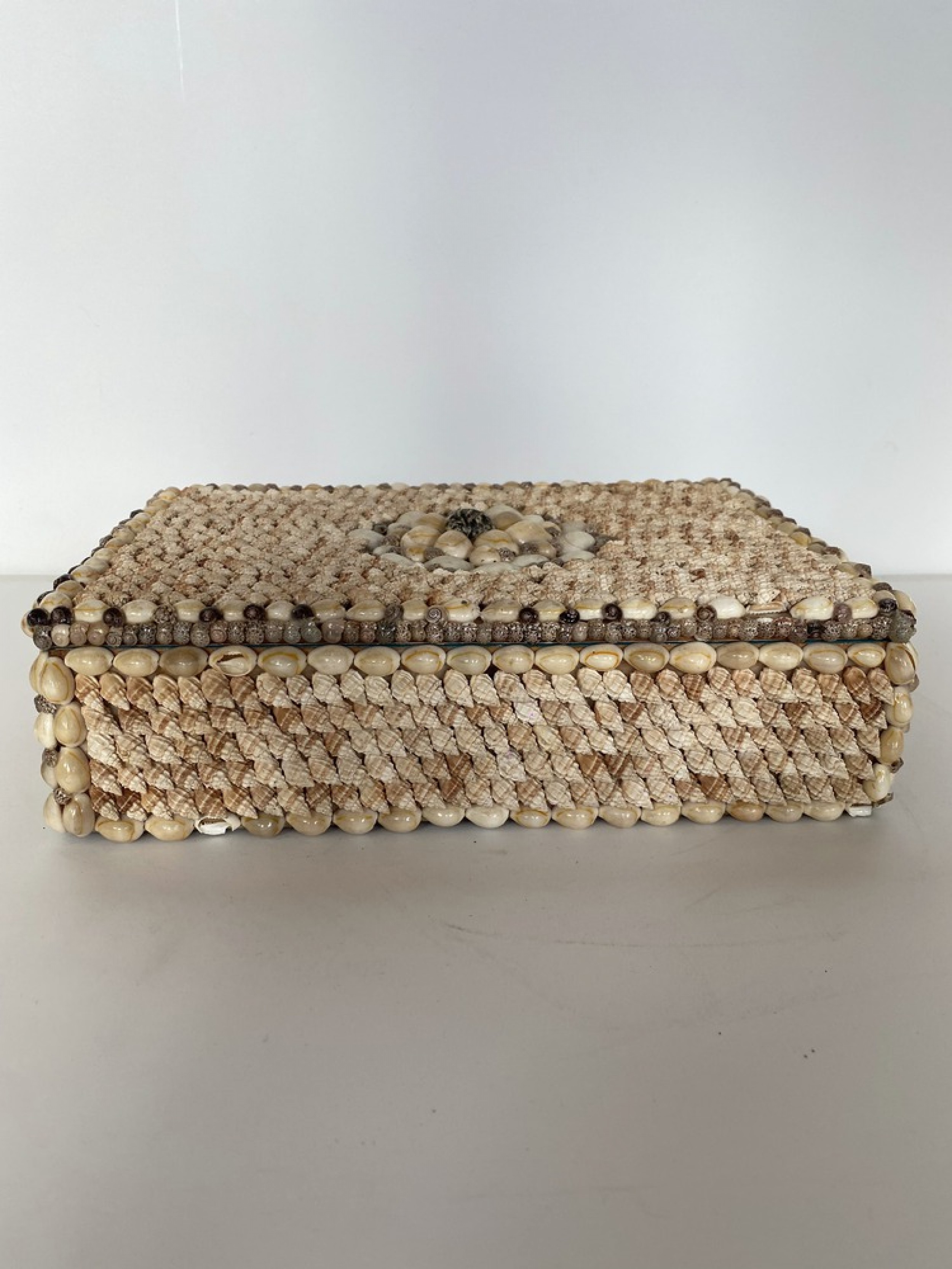 Contemporary American Modern rectangular jewelry box with an exterior finished in applied miniature conch and cowrie seashells, which opens to a teal velvet interior..