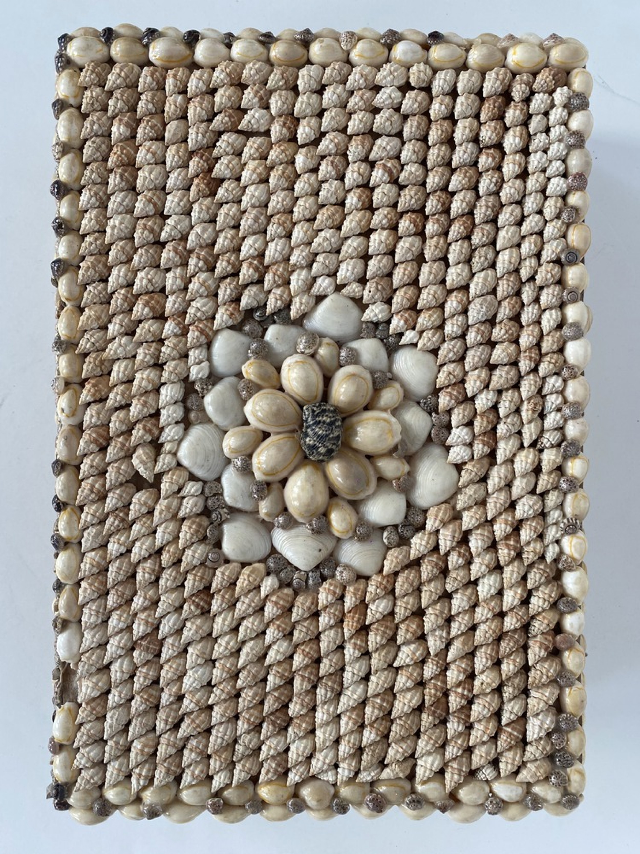 Contemporary American Modern rectangular jewelry box with an exterior finished in applied miniature conch and cowrie seashells, which opens to a teal velvet interior.