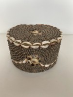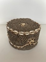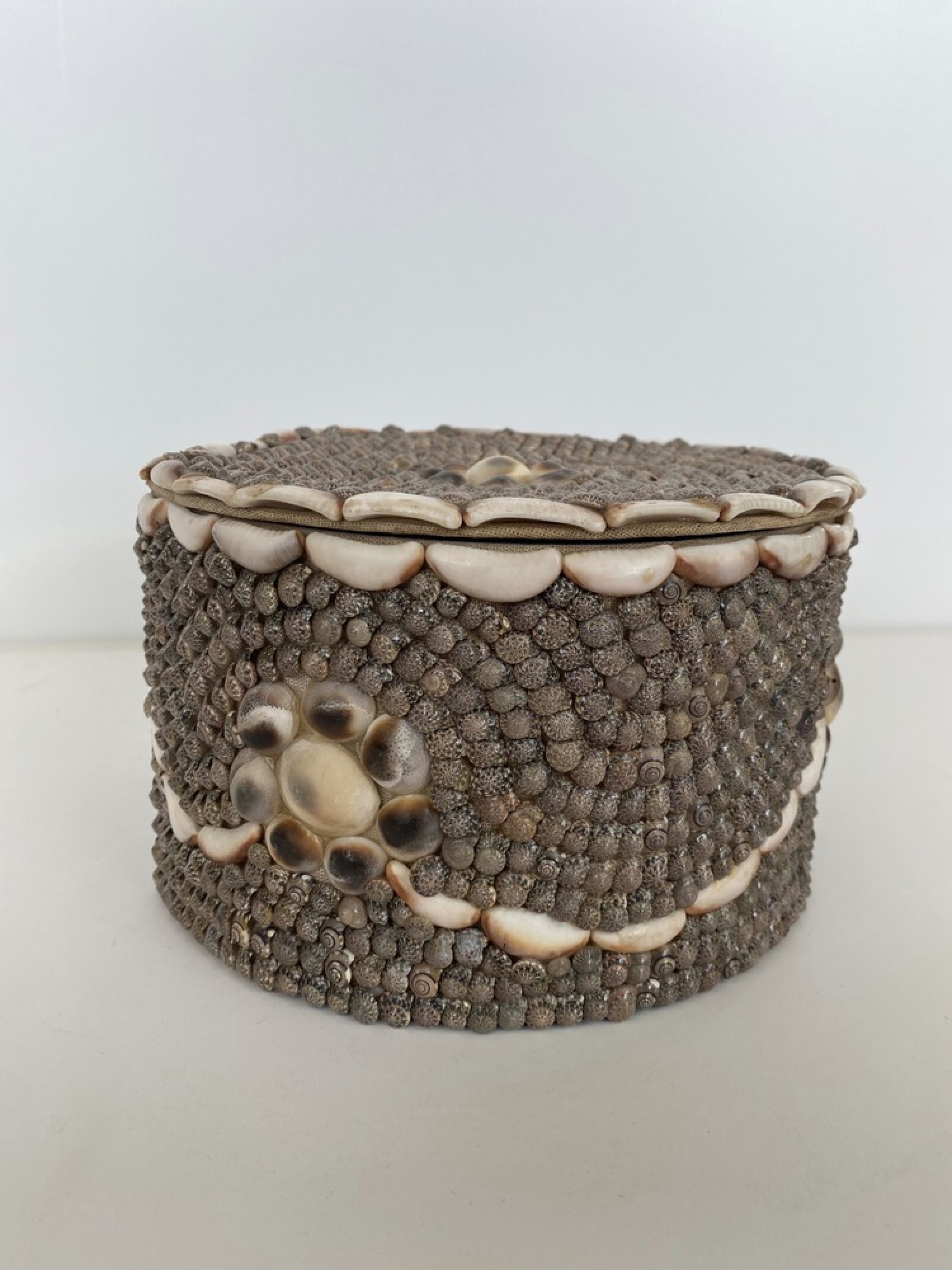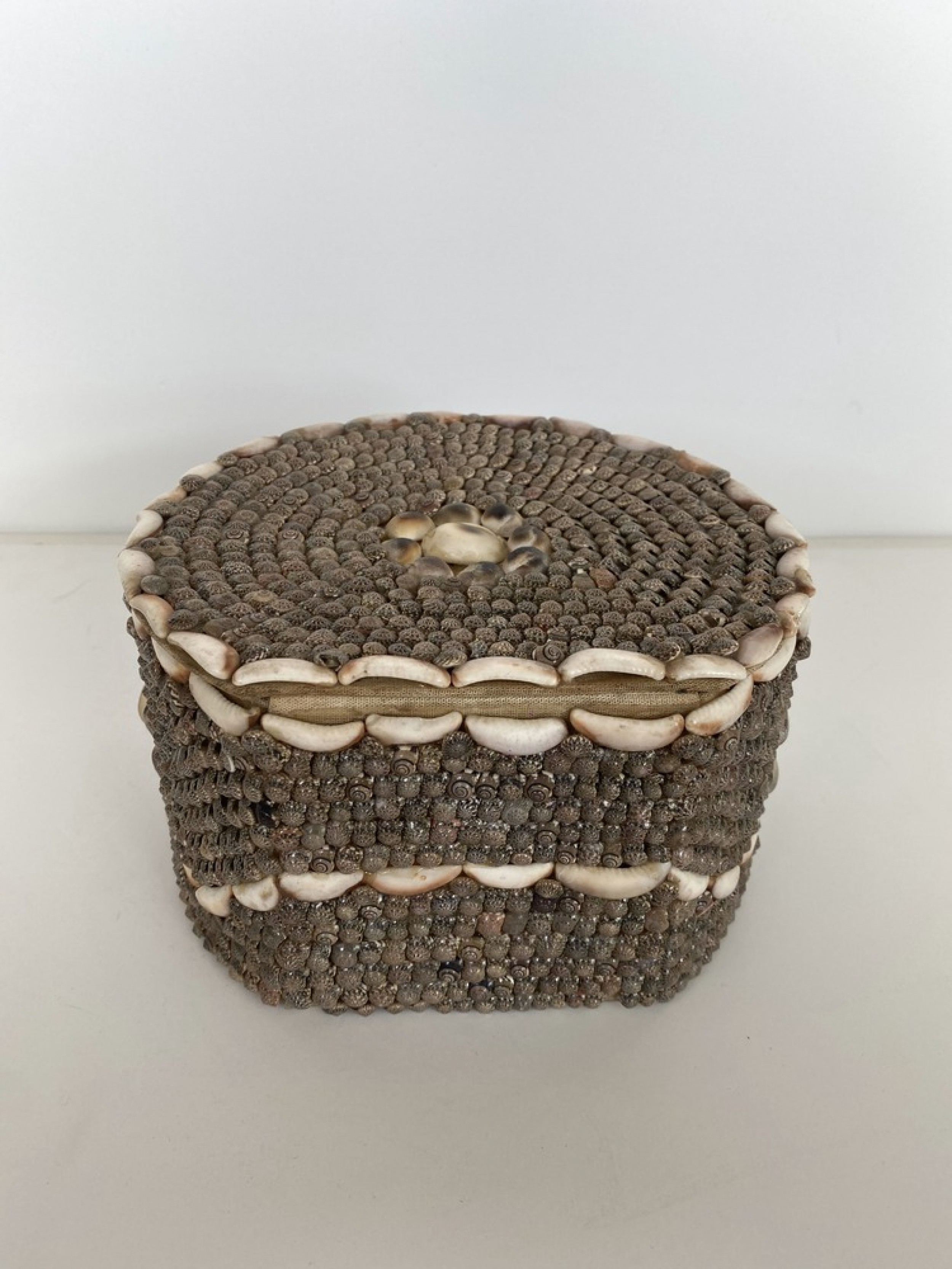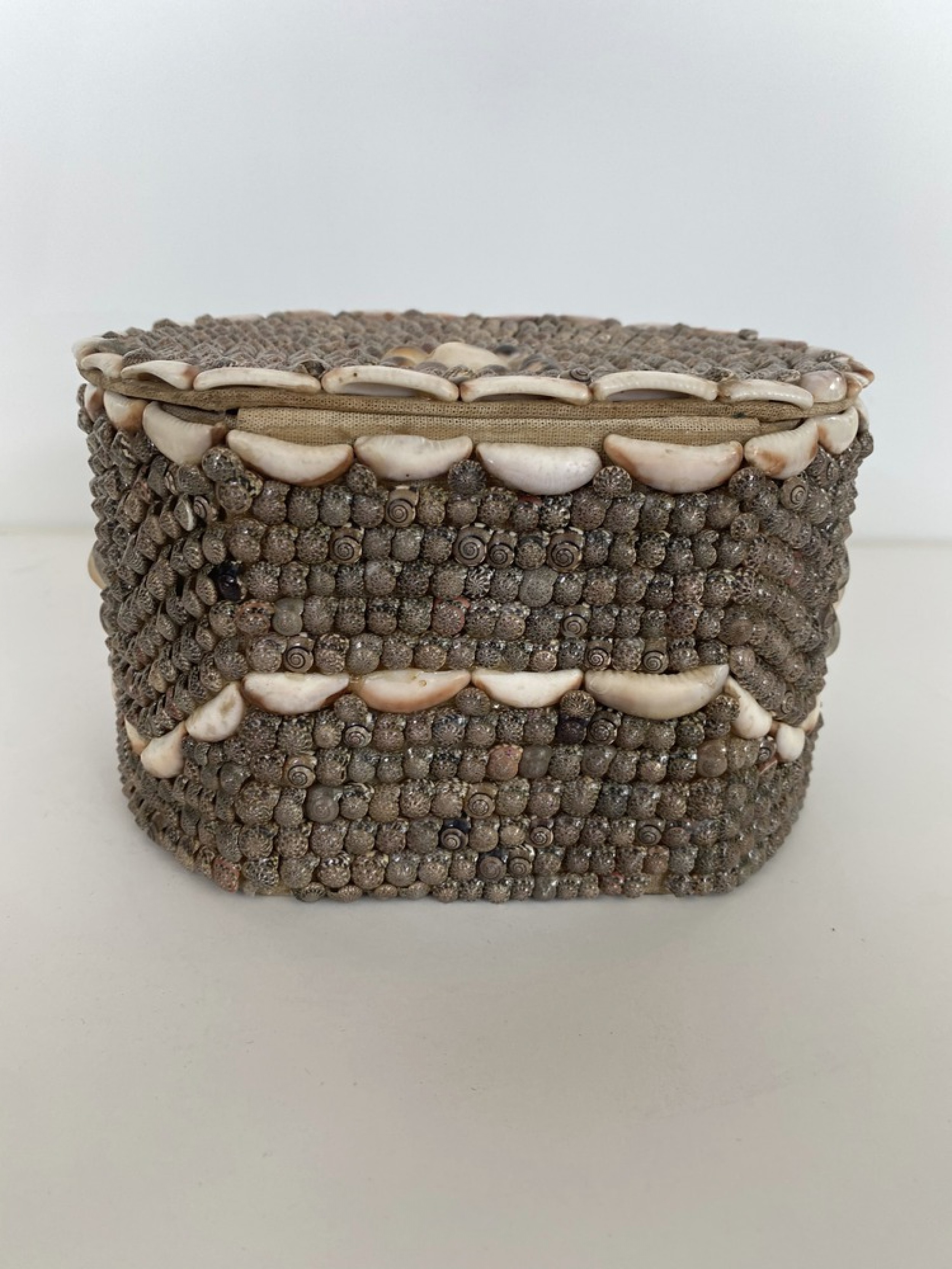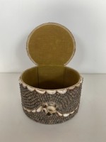 Contemporary American Modern oval jewelry box with an applied brown and beige seashell exterior and green velvet interior.