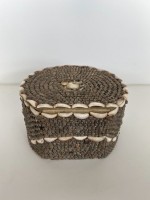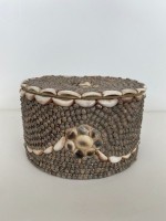 Contemporary American Modern oval jewelry box with an applied brown and beige seashell exterior and green velvet interior..