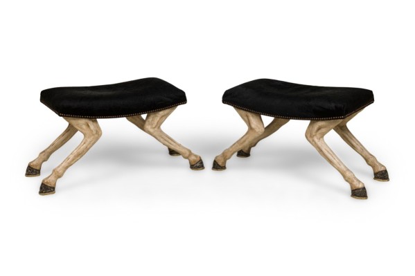 6 Contemporary Archi ceramic stools bearing a monolithic structure with a slightly concaved seating in a distressed off-white palette with brown/blue touches (PRICED EACH)(ELSA FOULON).