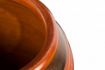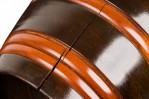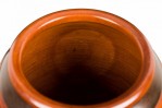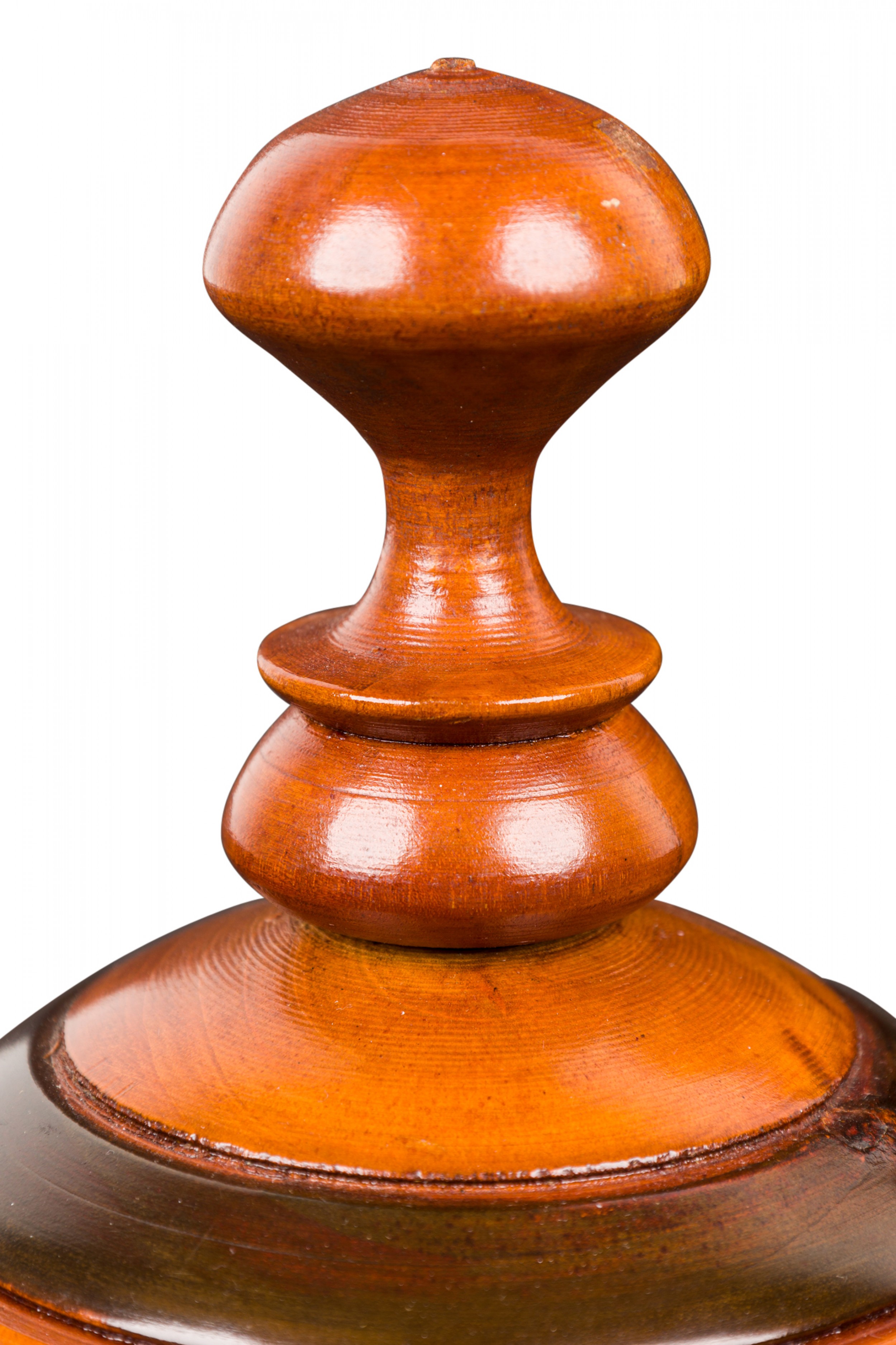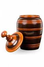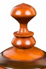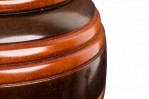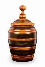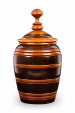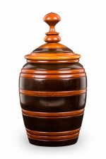 Contemporary turned wood lidded jar with a dark brown base and raised lighter brown horizontal stripes, topped with a fitted lid witth a turned ball finial.