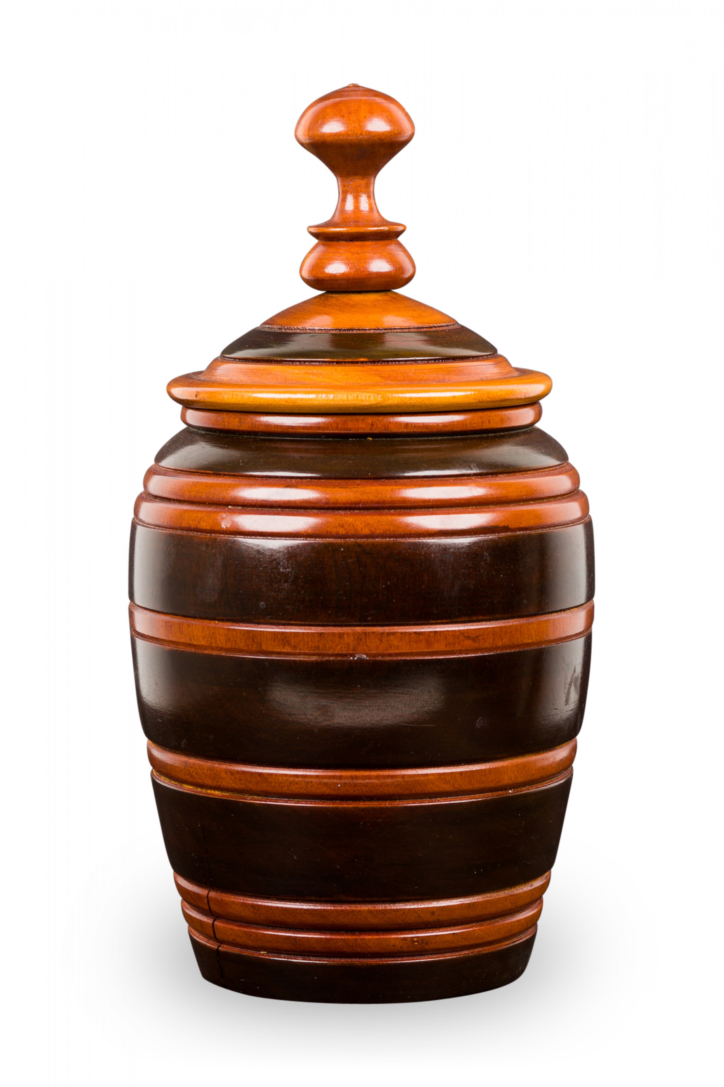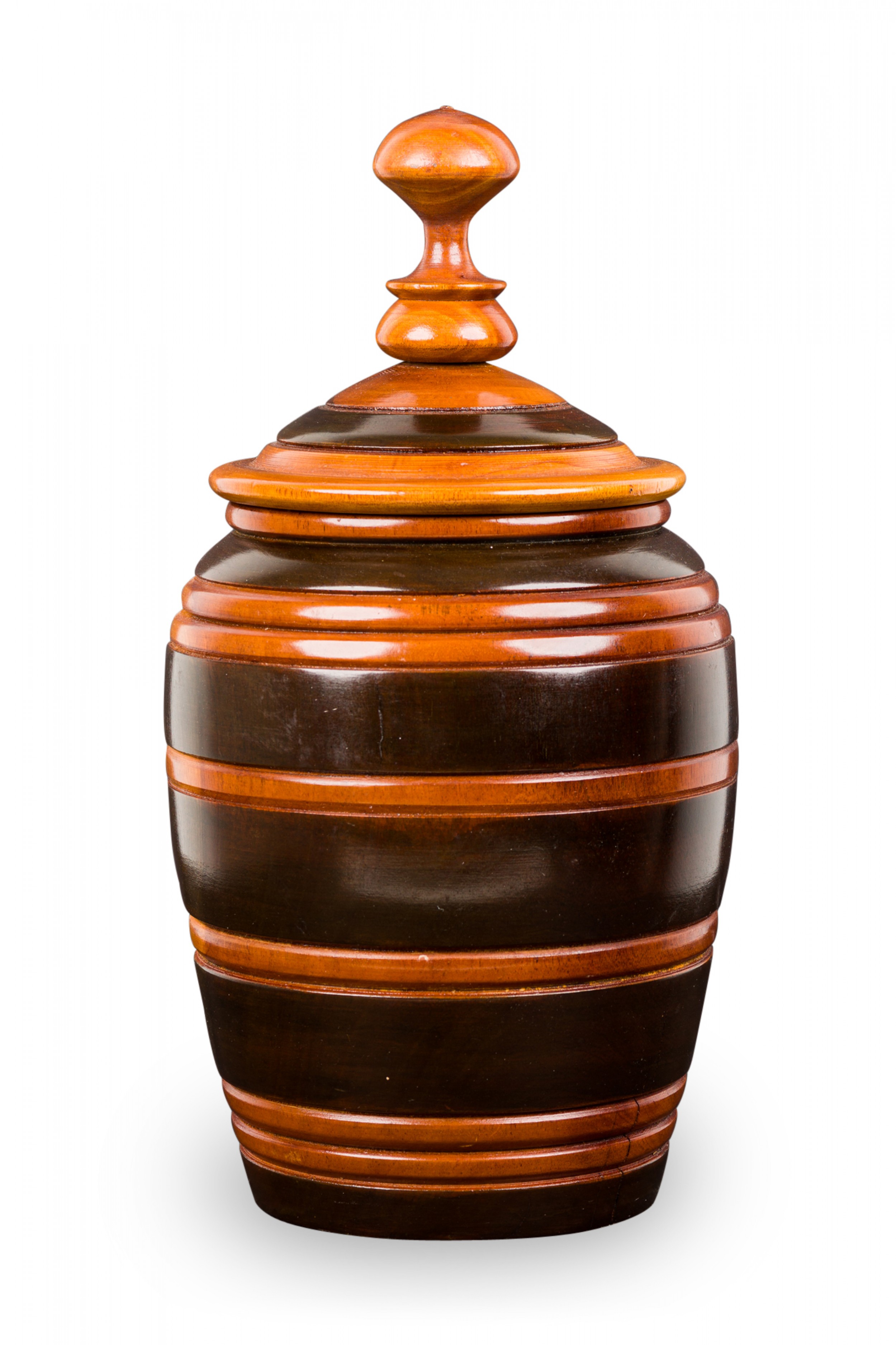 Contemporary turned wood lidded jar with a dark brown base and raised lighter brown horizontal stripes, topped with a fitted lid witth a turned ball finial..