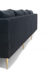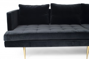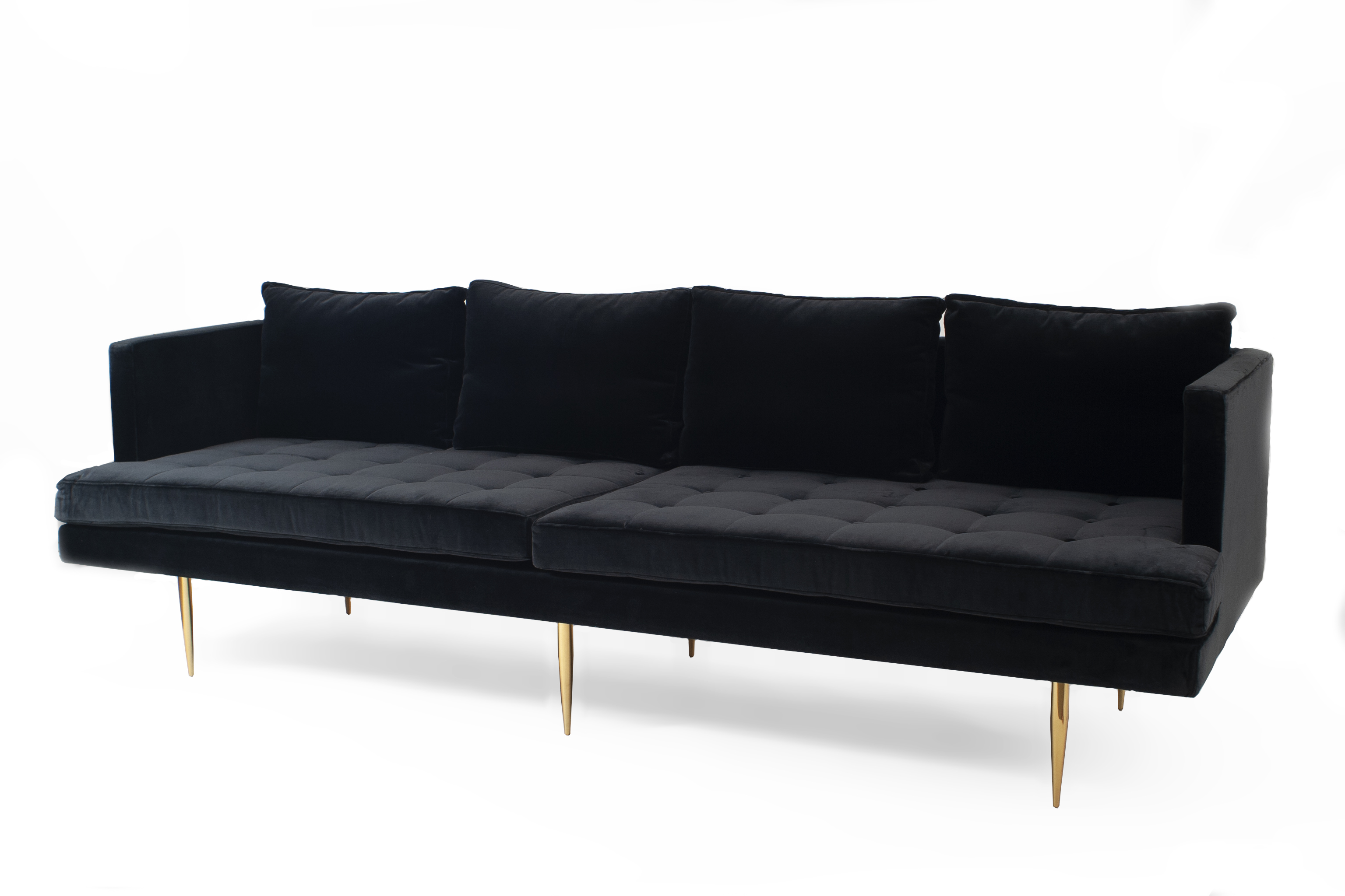 Contemporary black velvet sofa with button tufted seat, 4 removable back cushions, square arms, and 6 tapered gilt metal legs (Available in red: 061733)