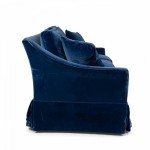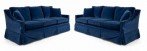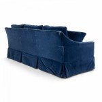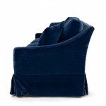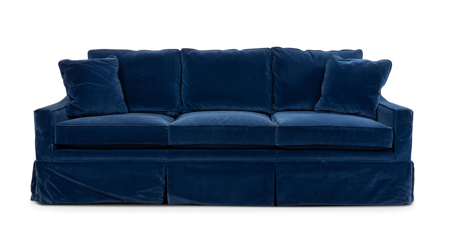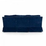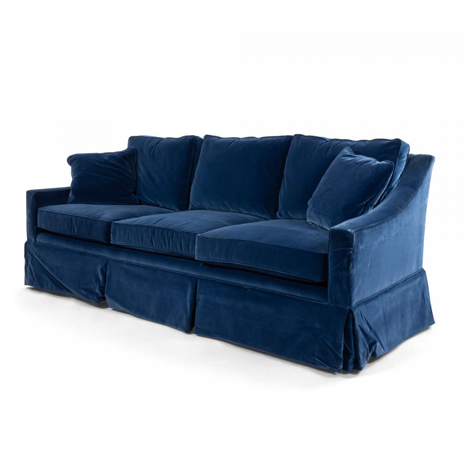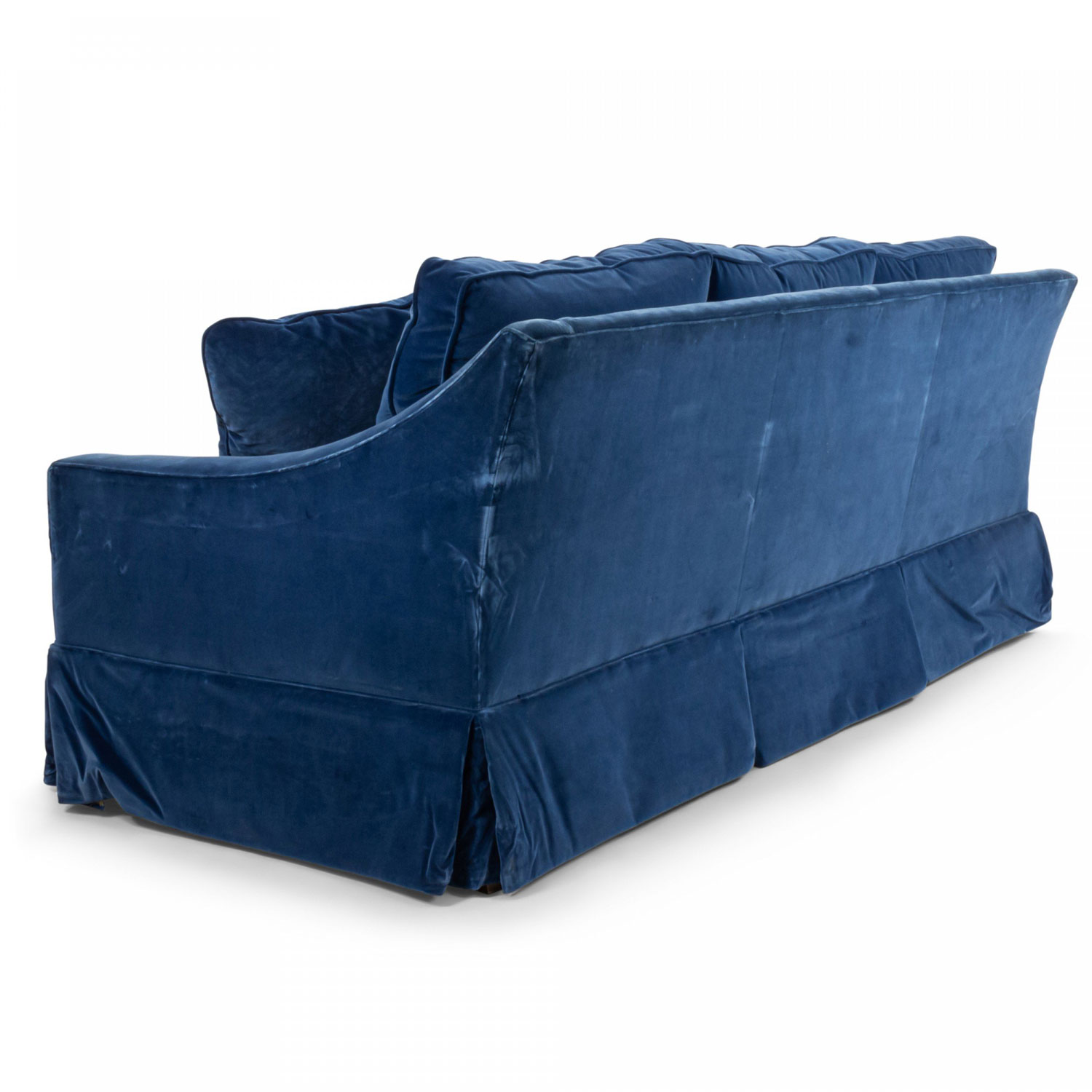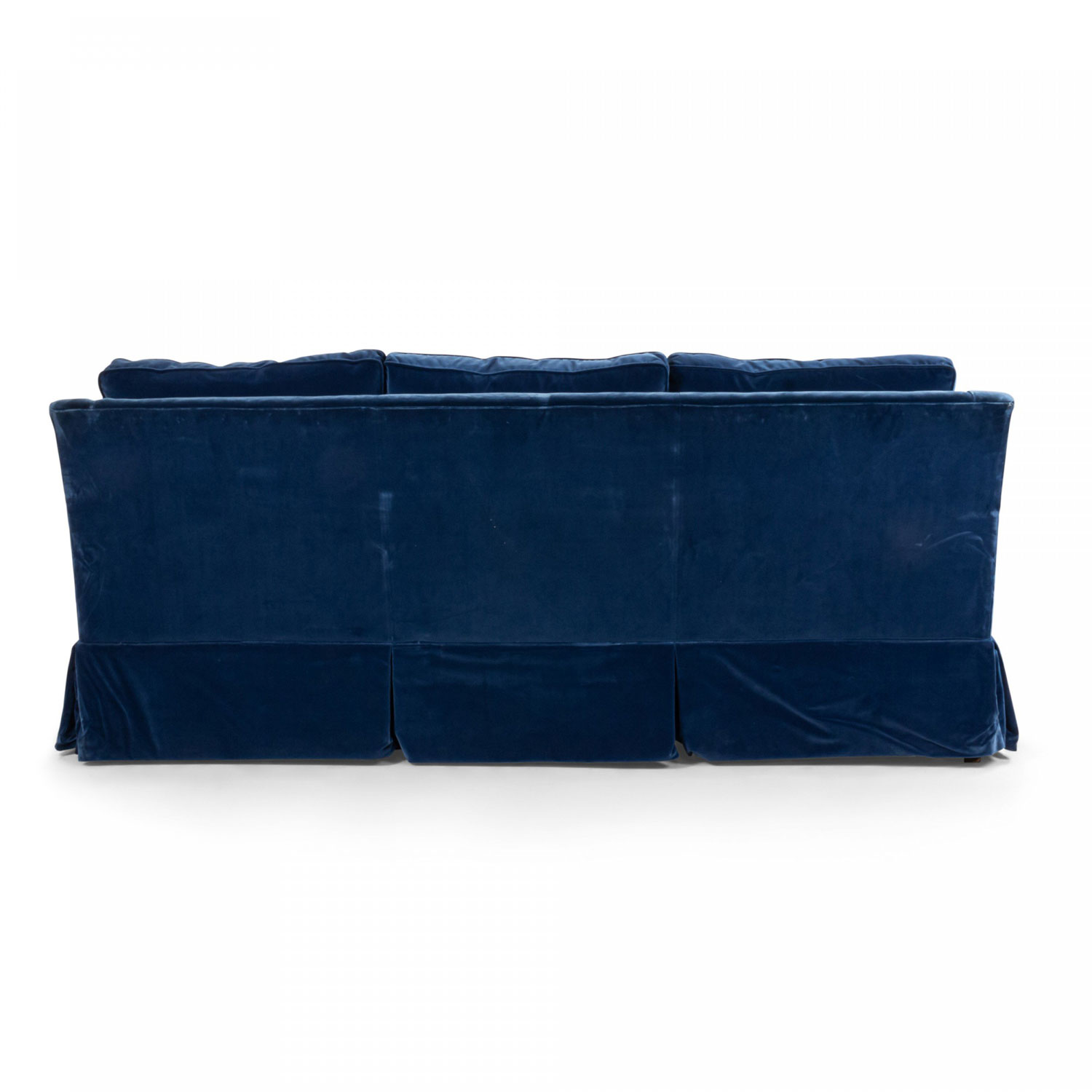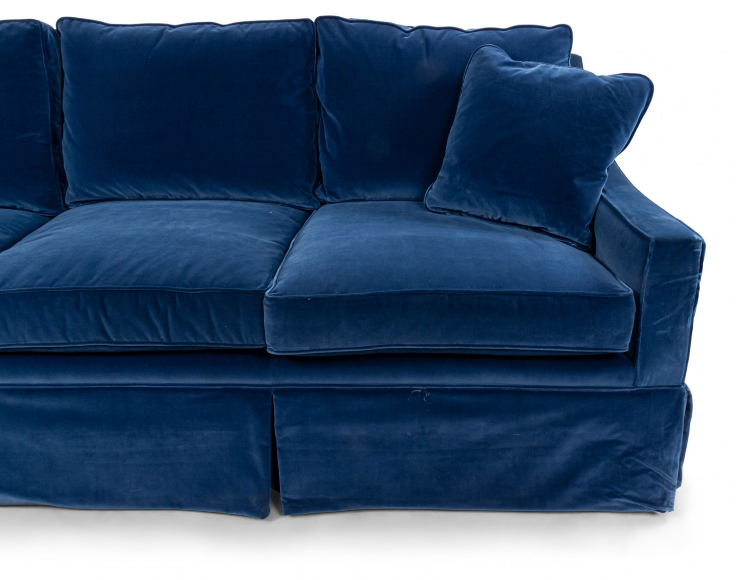 2 Contemporary straight back dark blue velvet sofas with arm rests and three seat cushions and two matching throw pillows.(PRICED EACH)..