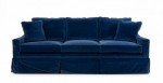 2 Contemporary straight back dark blue velvet sofas with arm rests and three seat cushions and two matching throw pillows.(PRICED EACH).