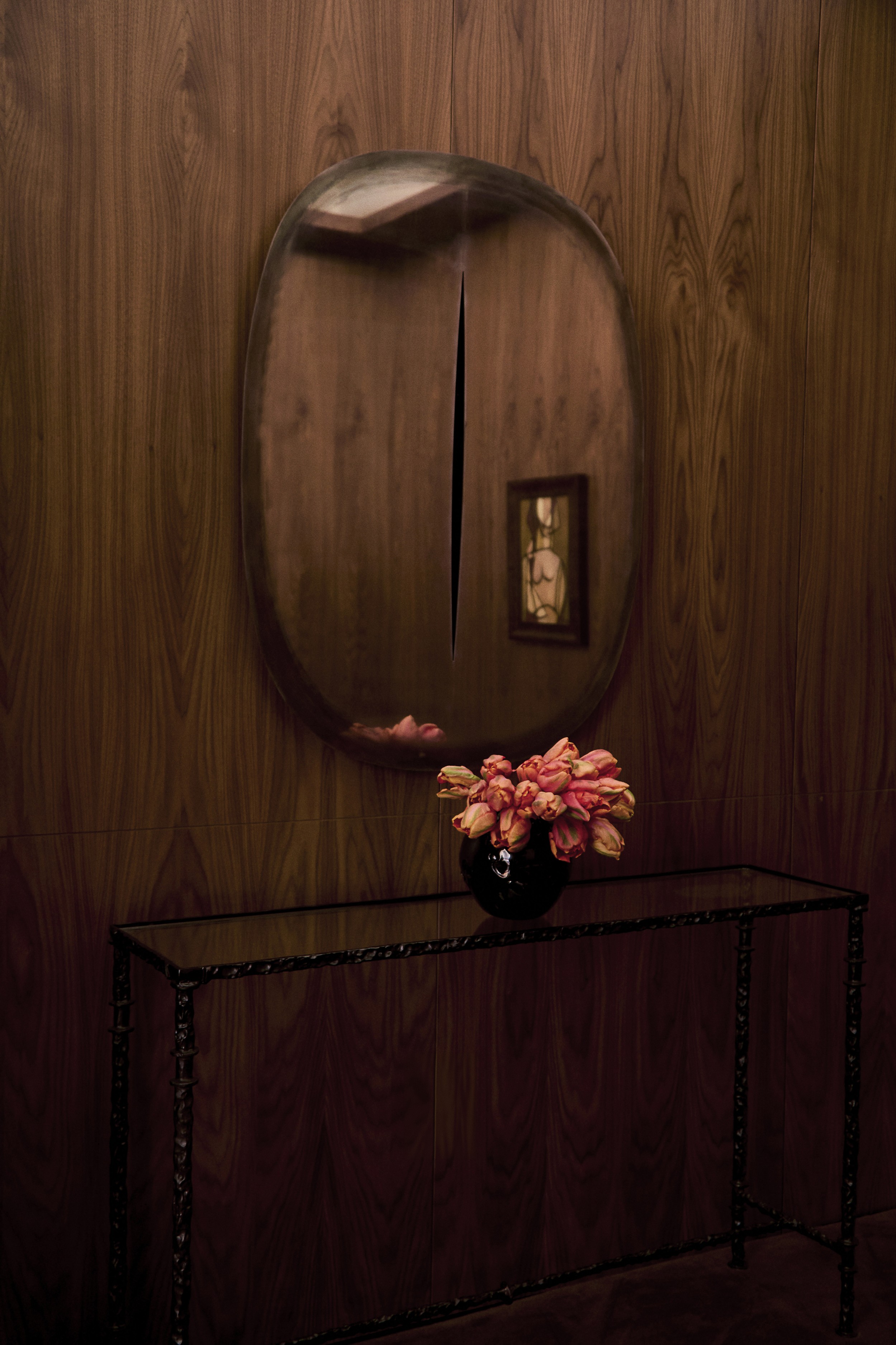 Contemporary mirror with a polished brass oval body with subtly distressed edges and a narrow slit in the middle (PHILIP JIVIDEN).