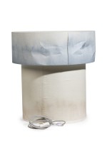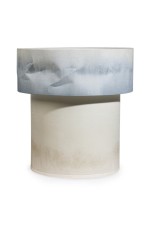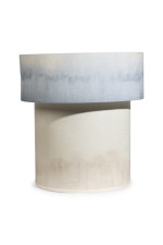 Contemporary "Cirrus Floor Lamp VII" with two graduating stout cylindrical bodies covered with natural fabric stained with blue hue (ELSA FOULON).