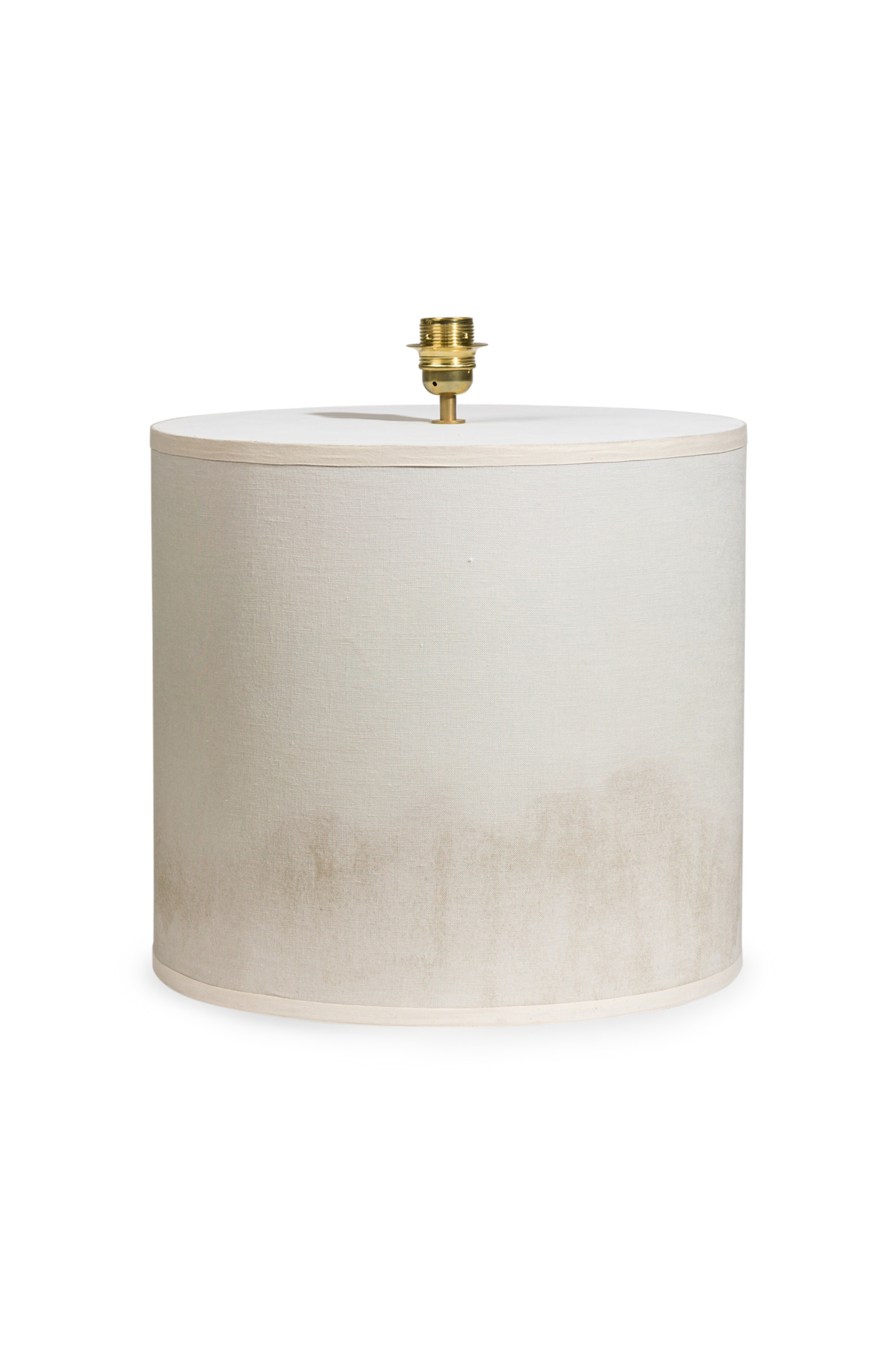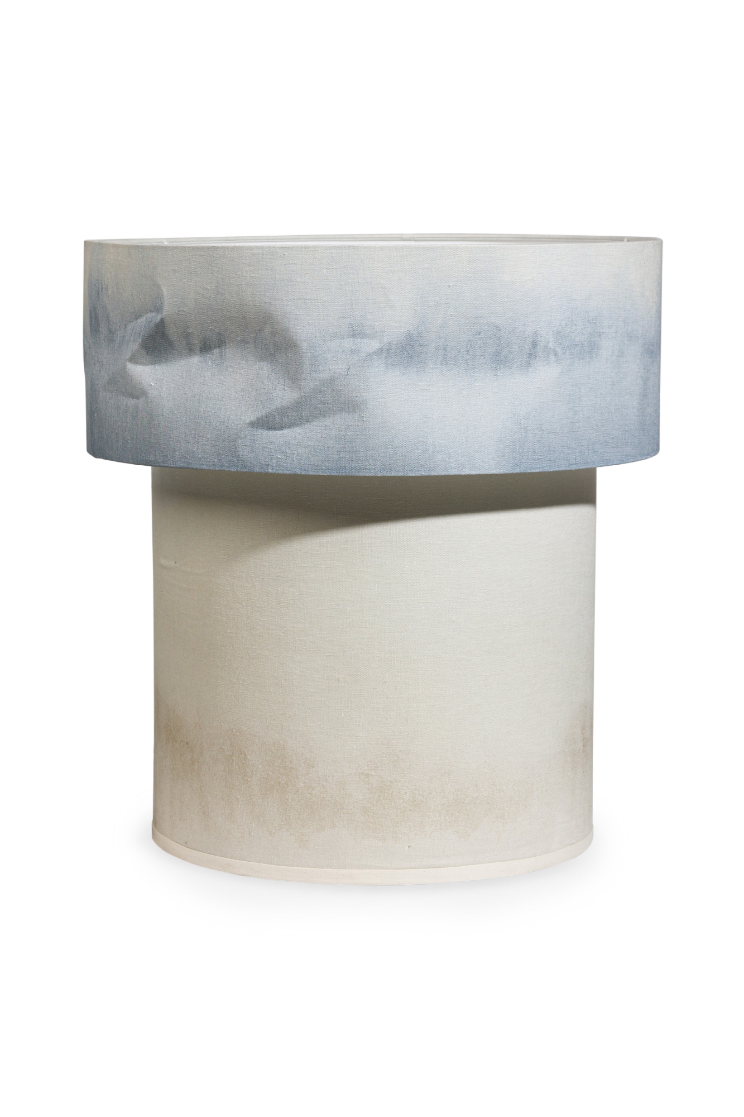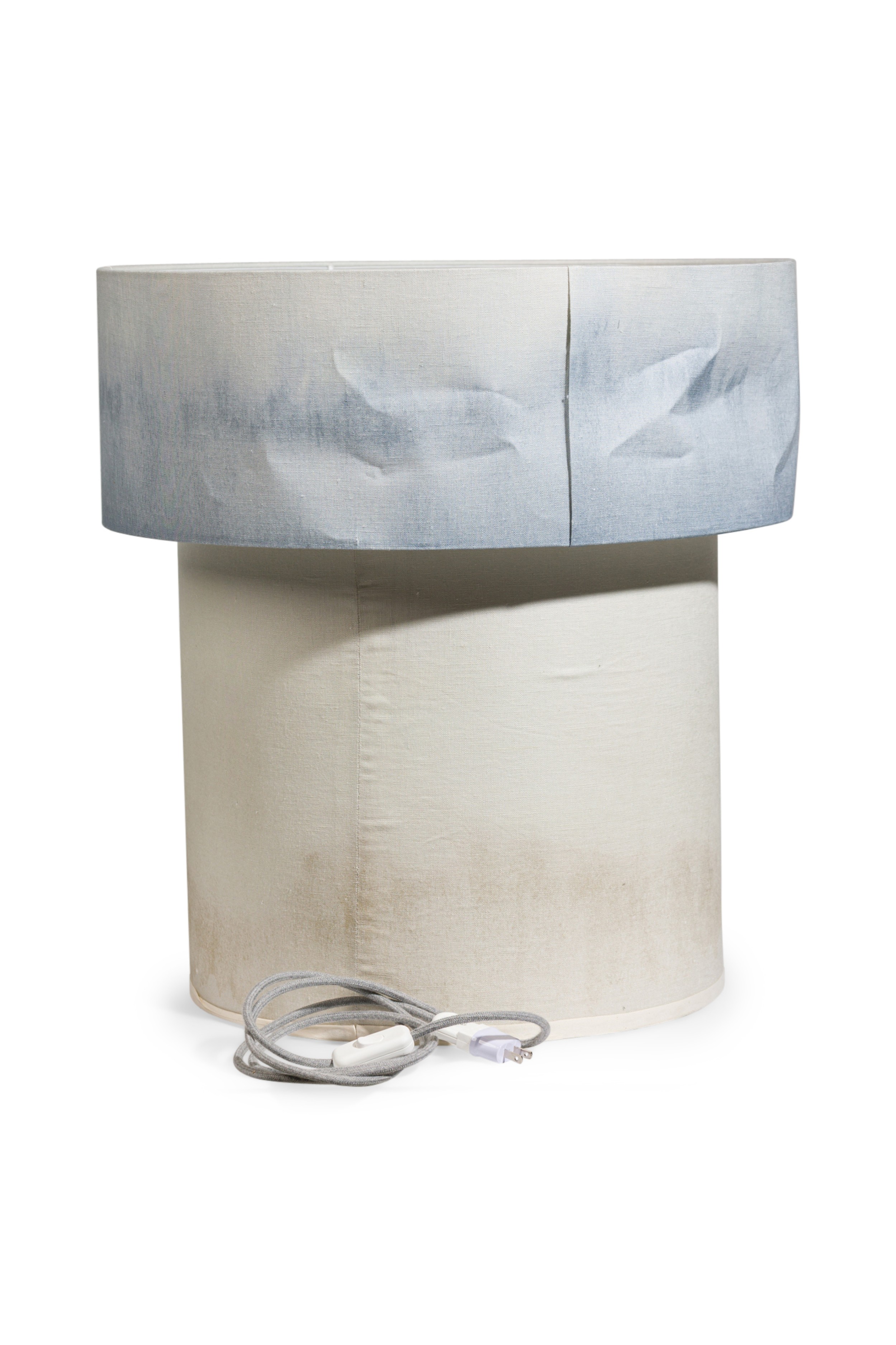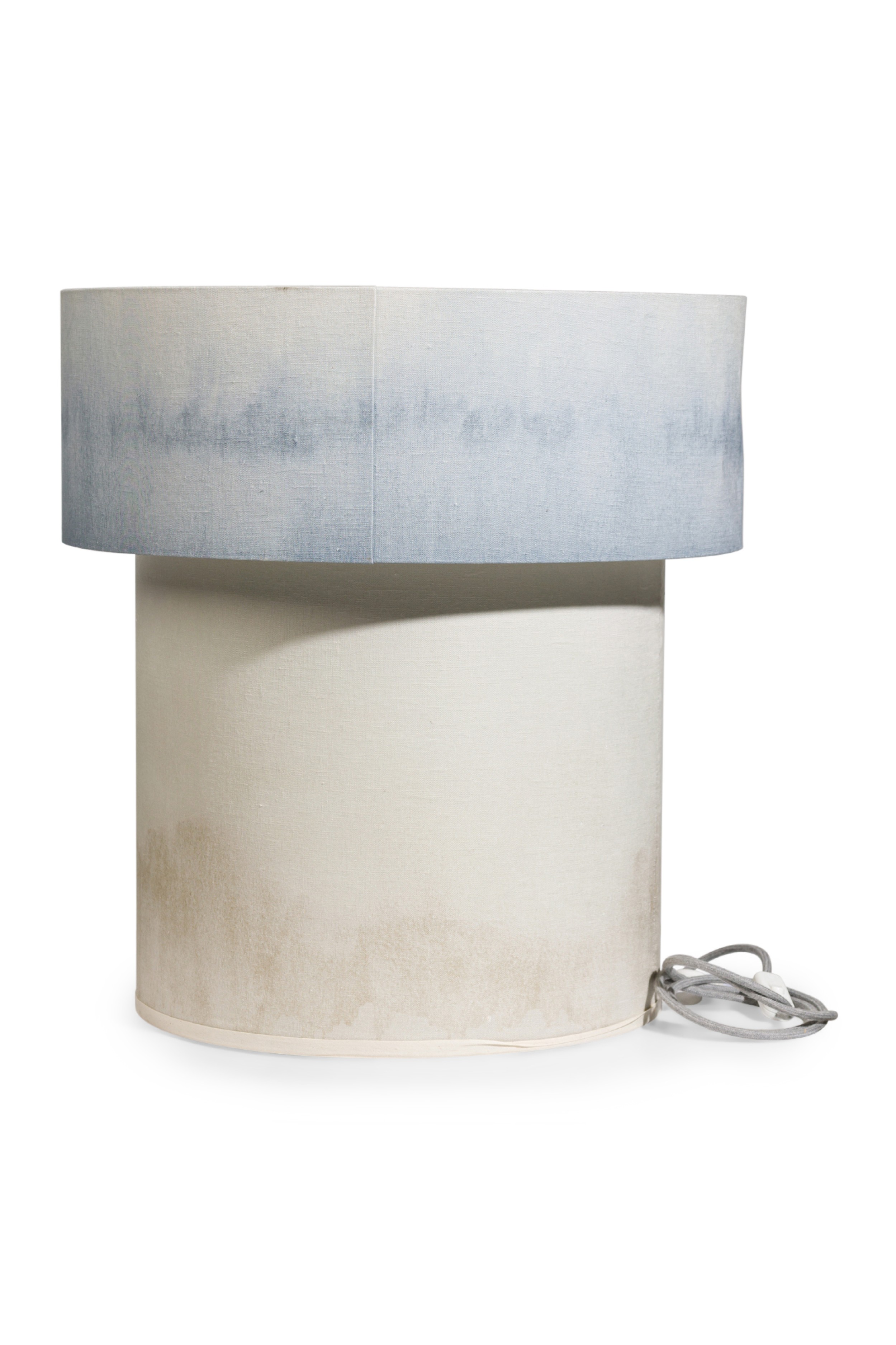 Contemporary "Cirrus Floor Lamp VII" with two graduating stout cylindrical bodies covered with natural fabric stained with blue hue (ELSA FOULON)
