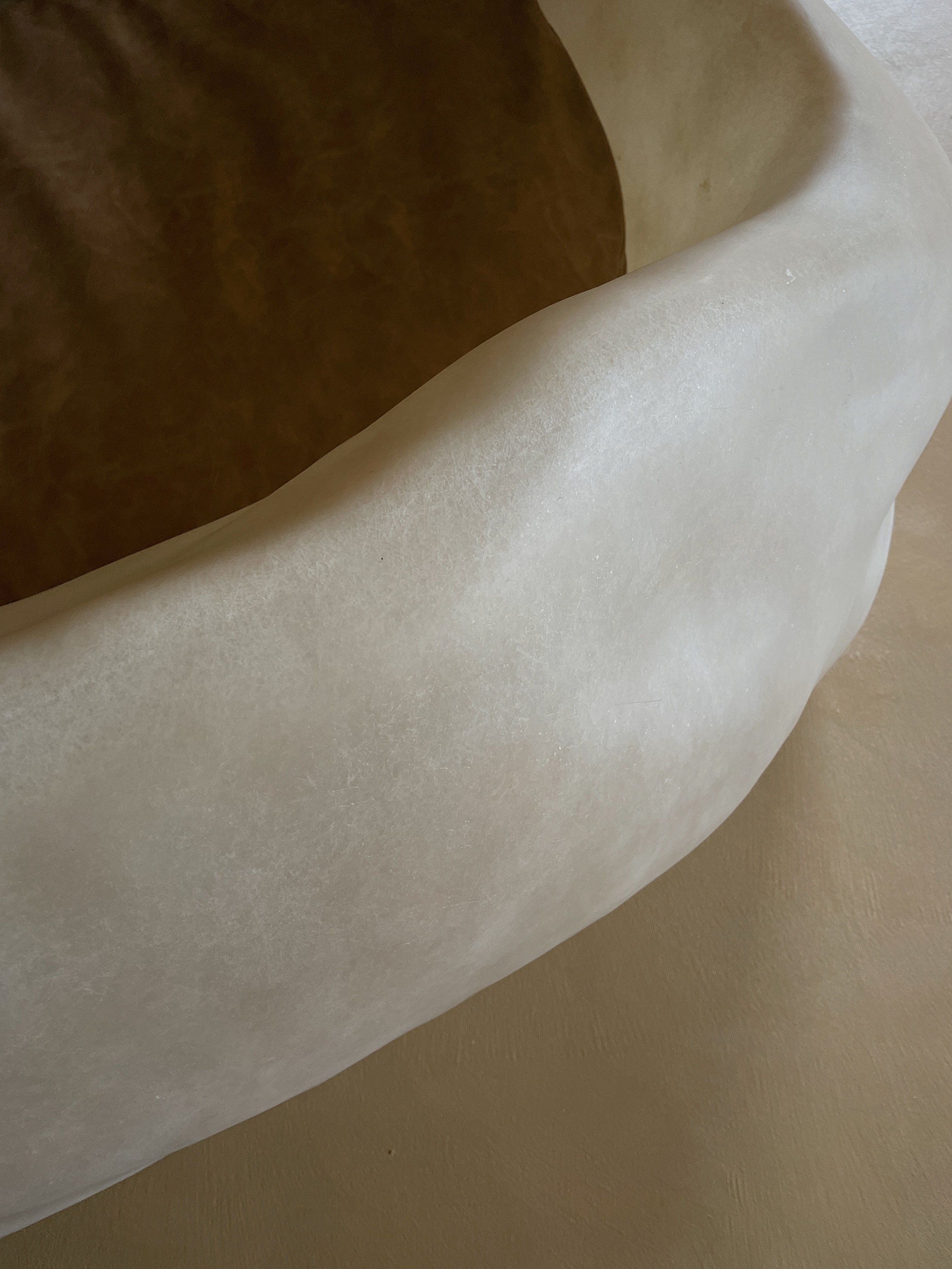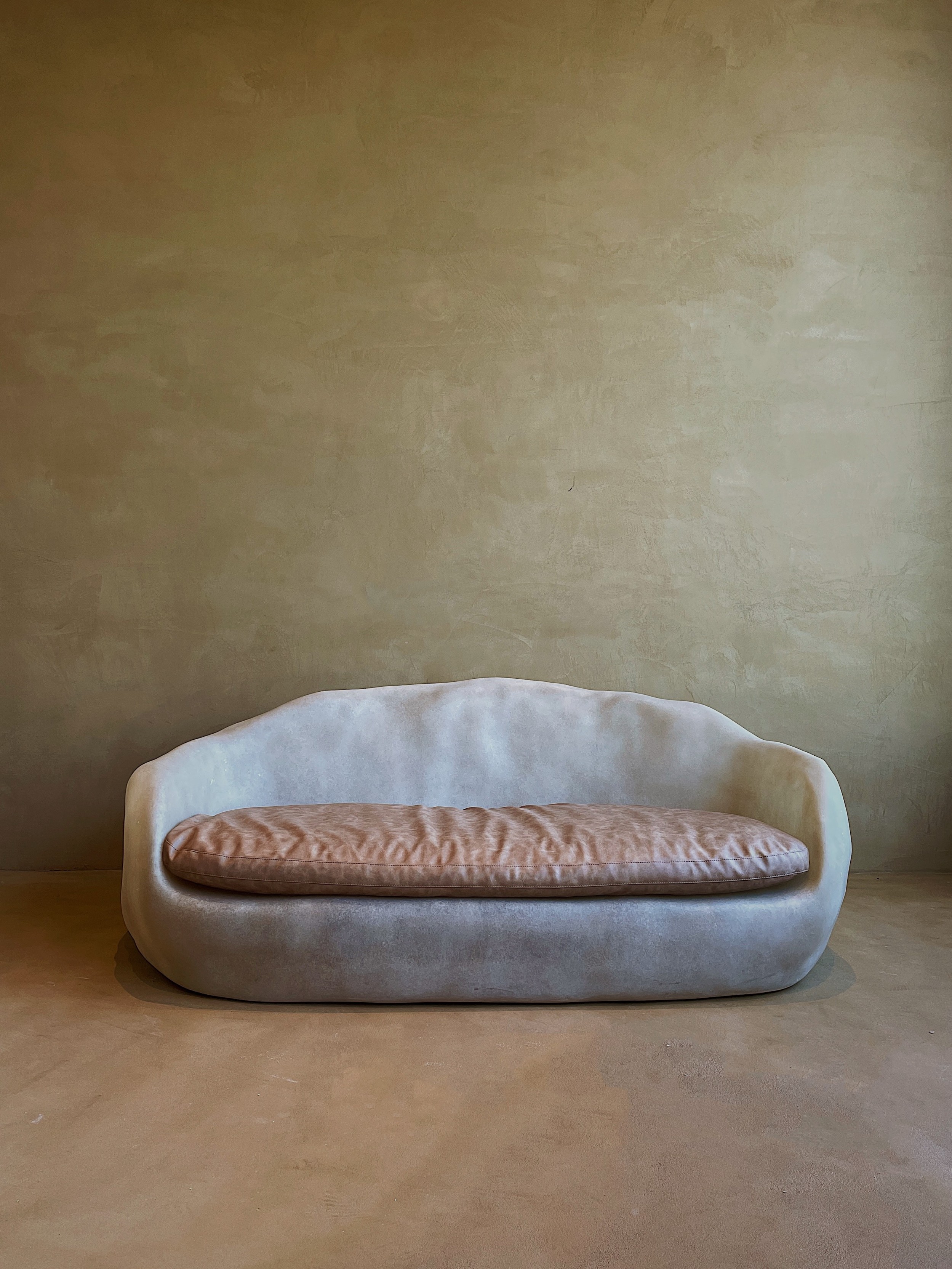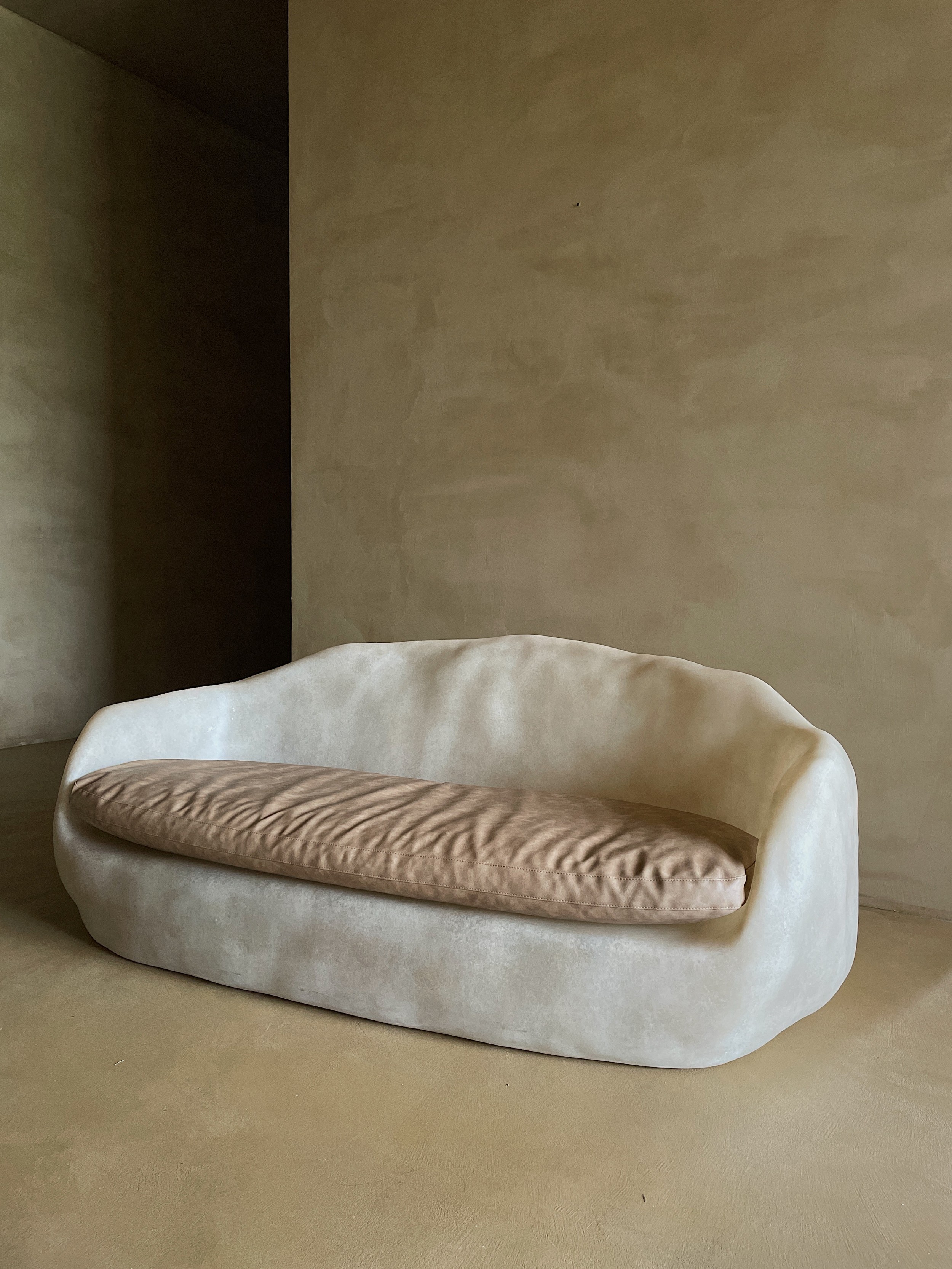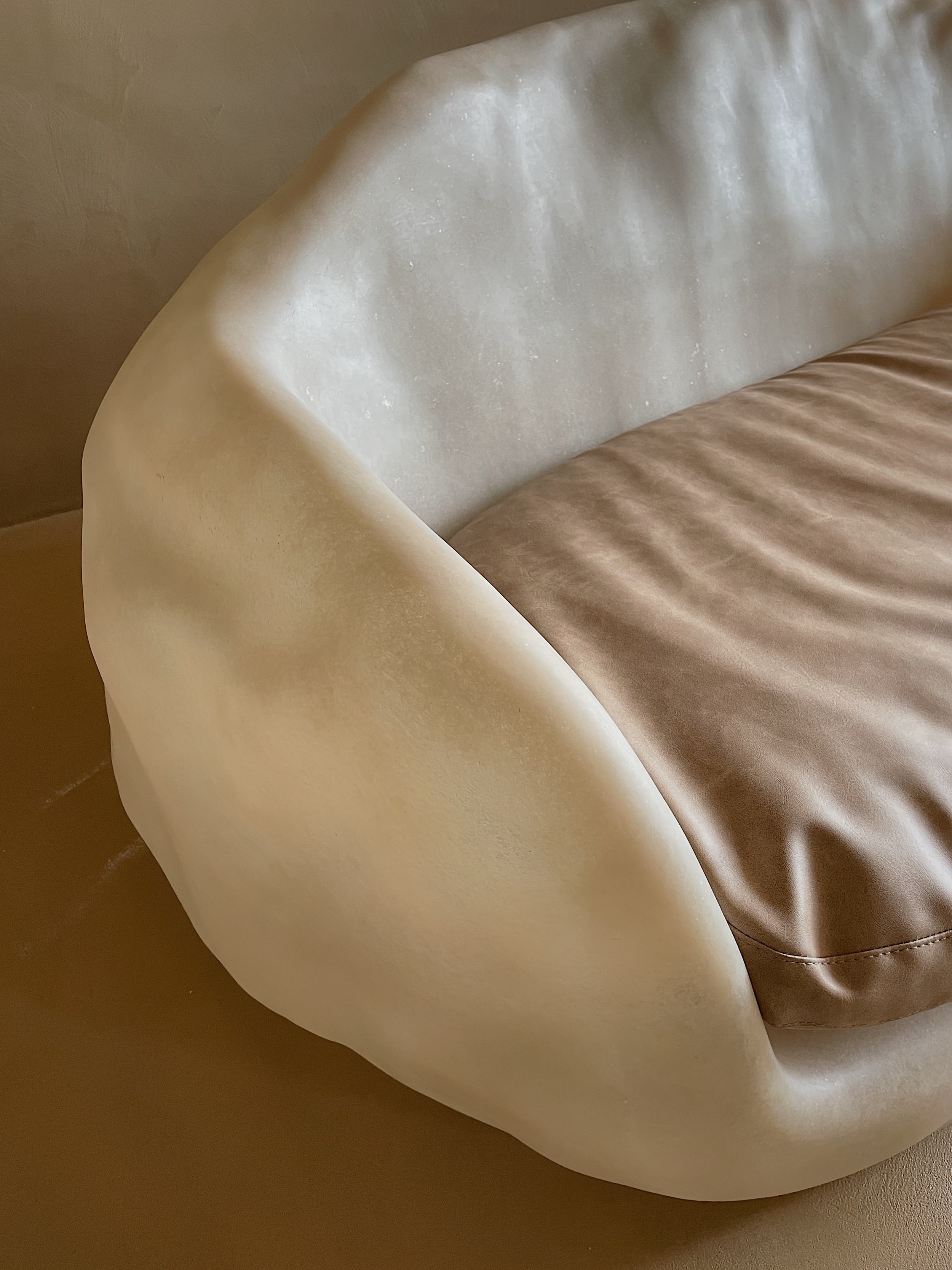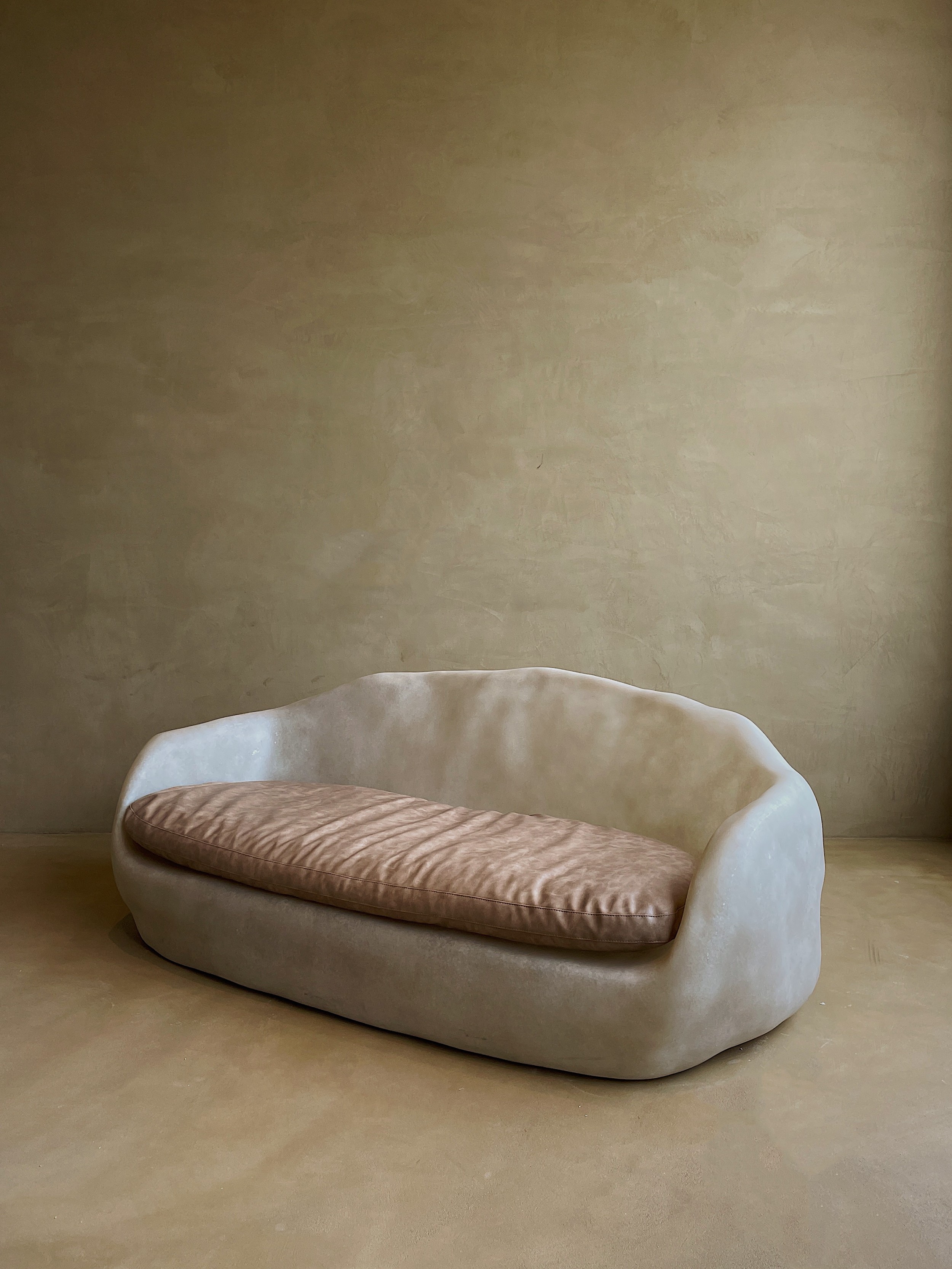 Contemporary sofa bearing a beige organically shaped fiberglass body with leather cushion seat (KAR STUDIO).