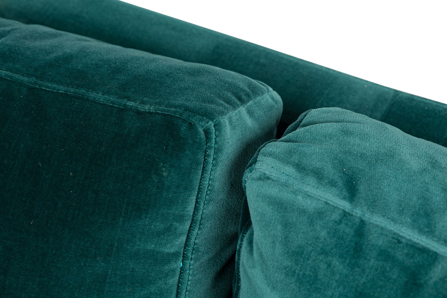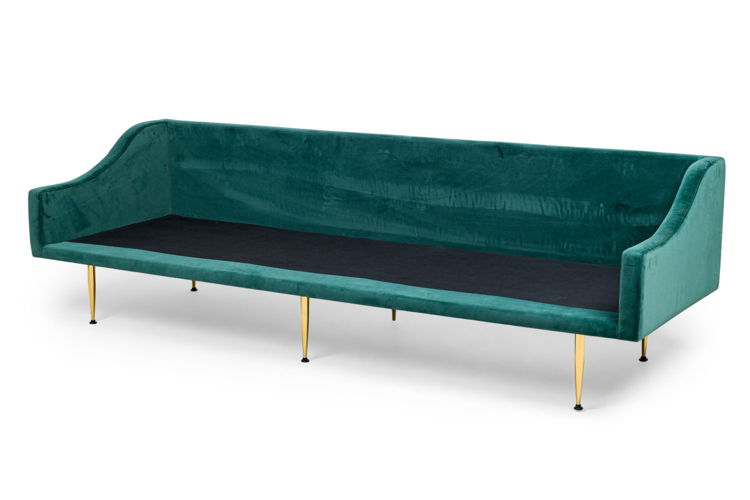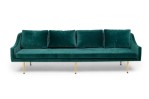 Contemporary / Modern "Sintra" sofa upholstered in dark sea green / teal velvet with four removable back cushions and a single long seat cushion, resting on tapered brass legs. (Available in charcoal: MOD2009, and red: MOD2010)