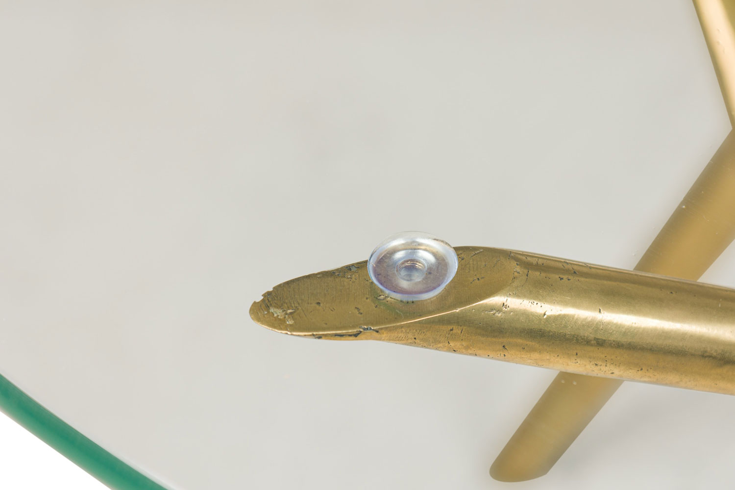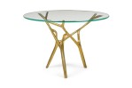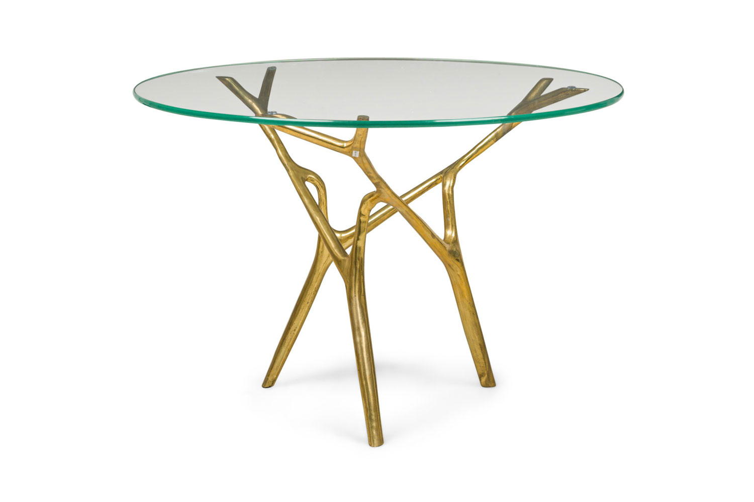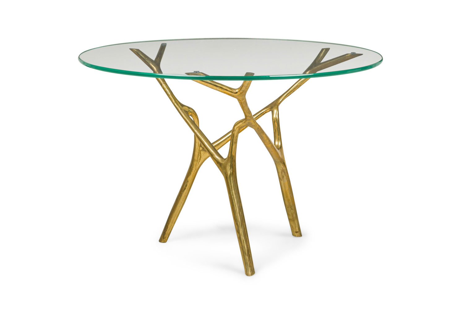Contemporary / Modern "Branco" dining / center table featuring an organic "branch" form base constructred from polished bronze supporting a circular clear glass table top. (Similar table in unpolished bronze: MOD2004, matching side table: MOD2033)