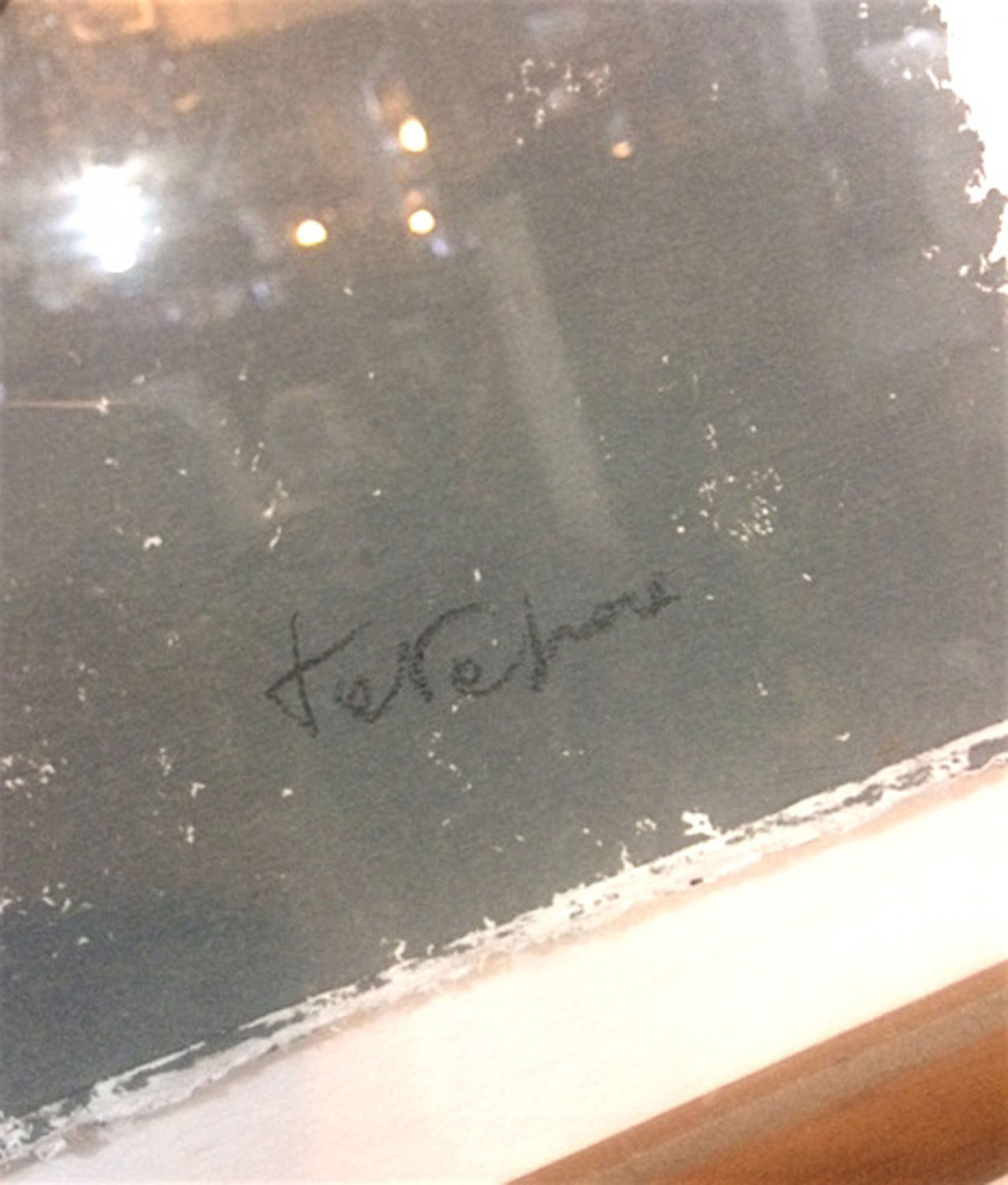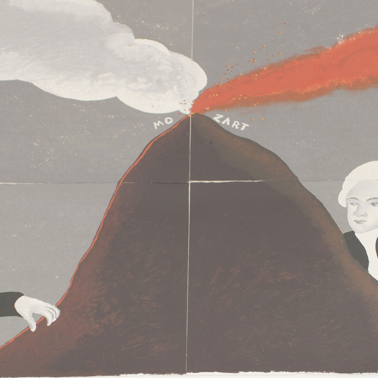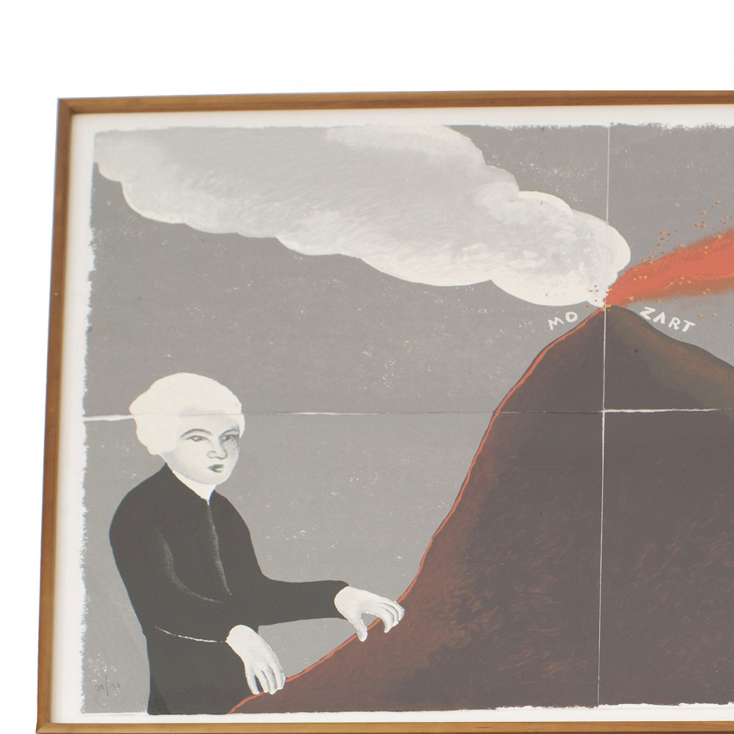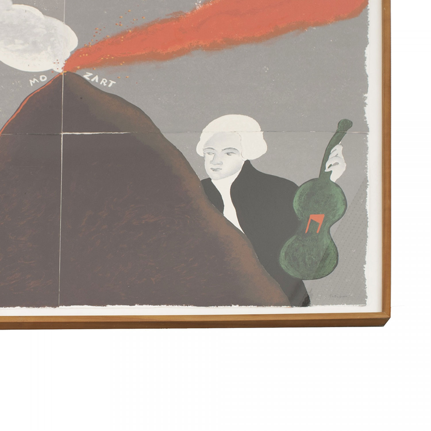 Contemporary art print of Mozart playing a 'volcano' piano and violin in beige matting in a large rectangular wooden frame. Limited editions 20/30.