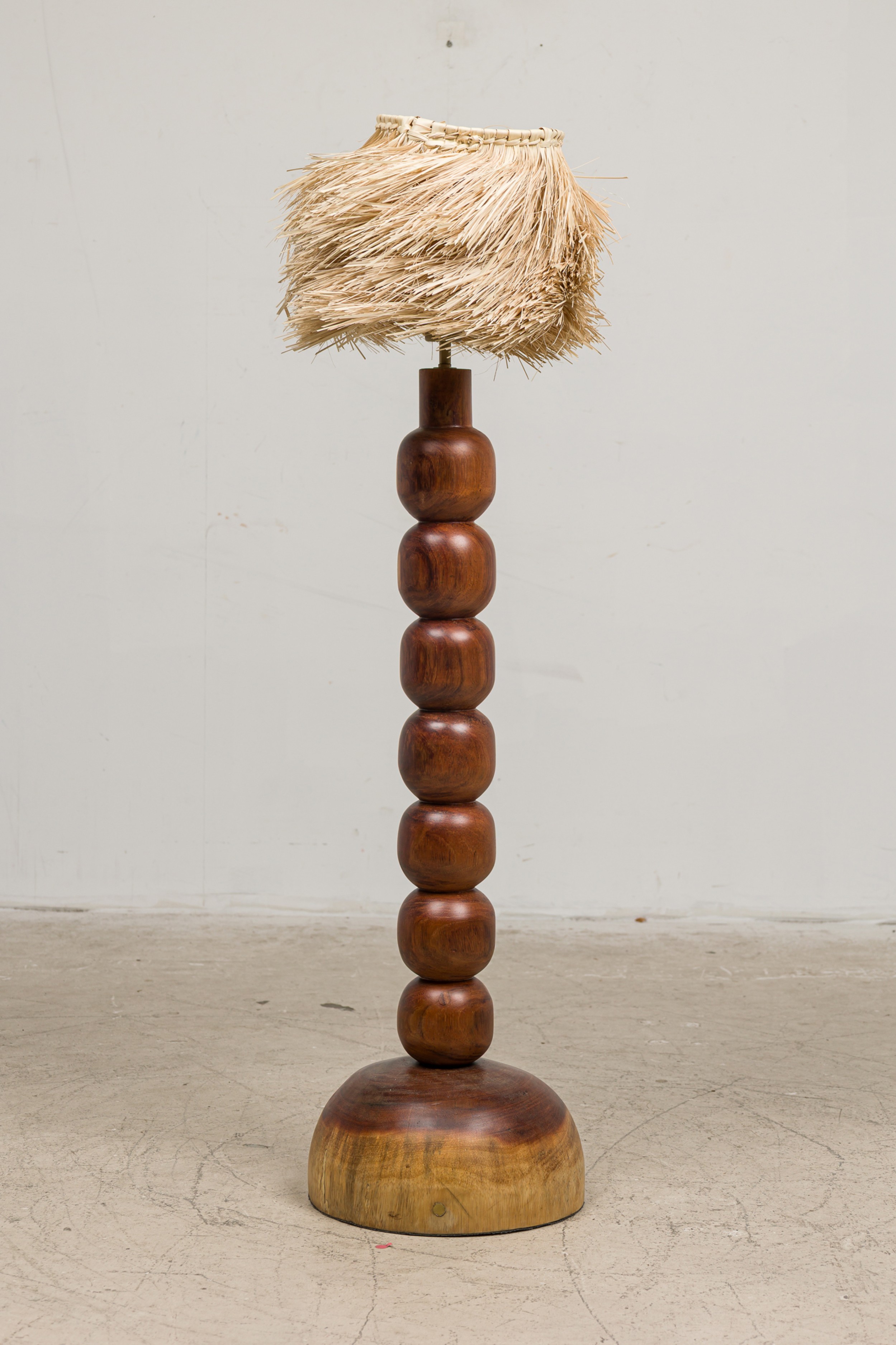 Contemporary natural jabin wood floor lamp with palm screen bearing staggered wooden balls on the stem ending on a dome shaped base (DANIEL OROZCO)