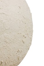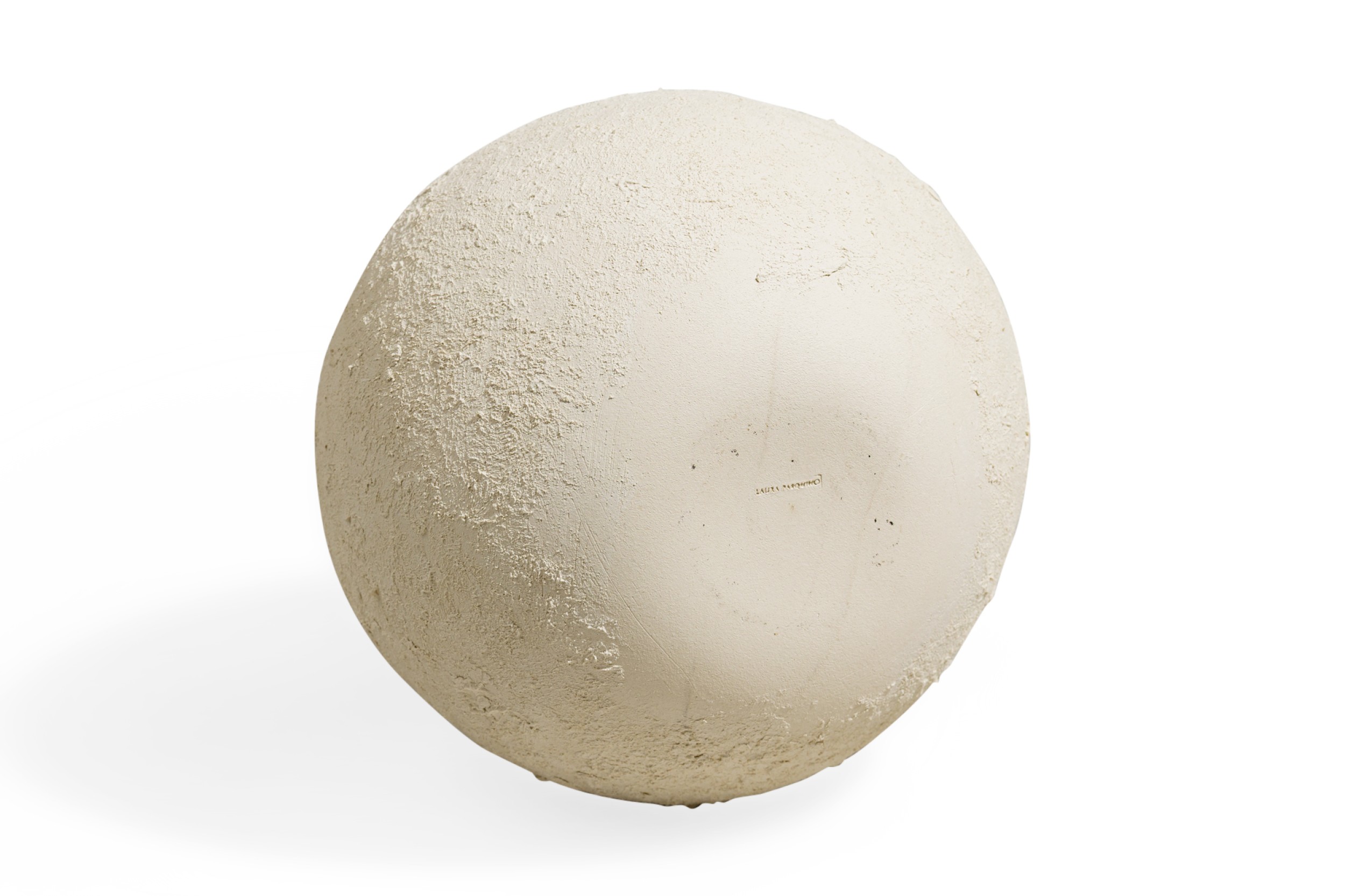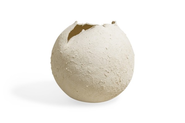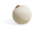 Contemporary sculptural urn/vase featuring a hand-crafted spherical beige body with an irregular, organically cracked opening and a rich textural surface (LAURA PASQUINO).