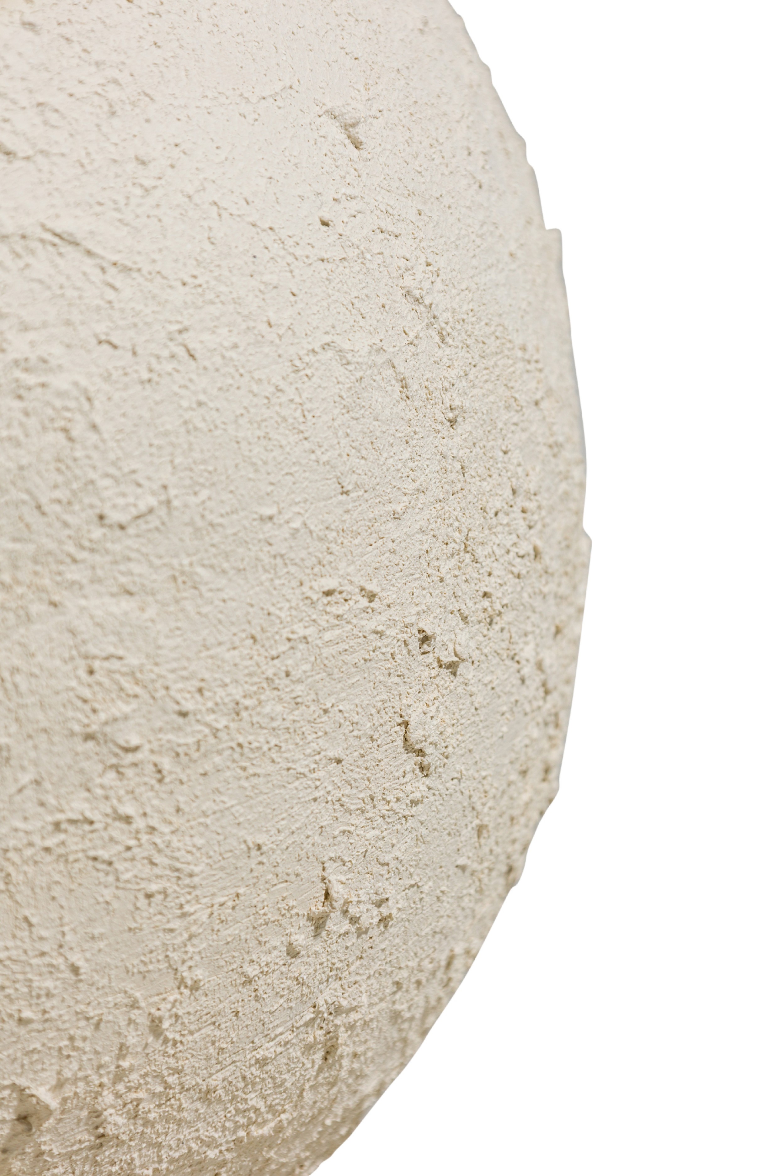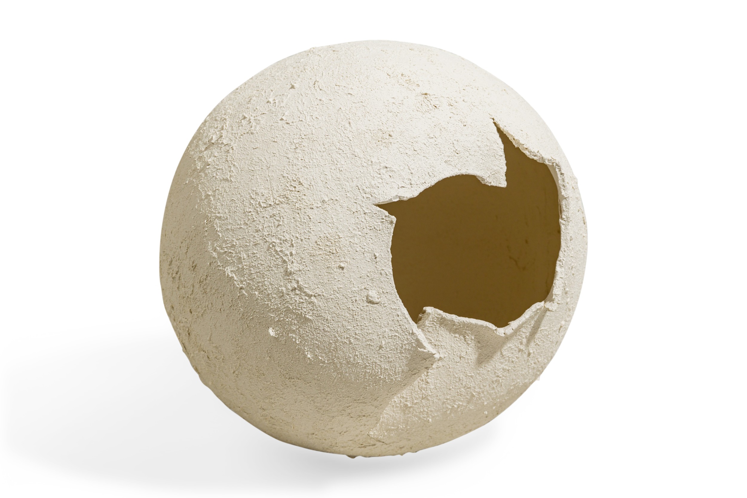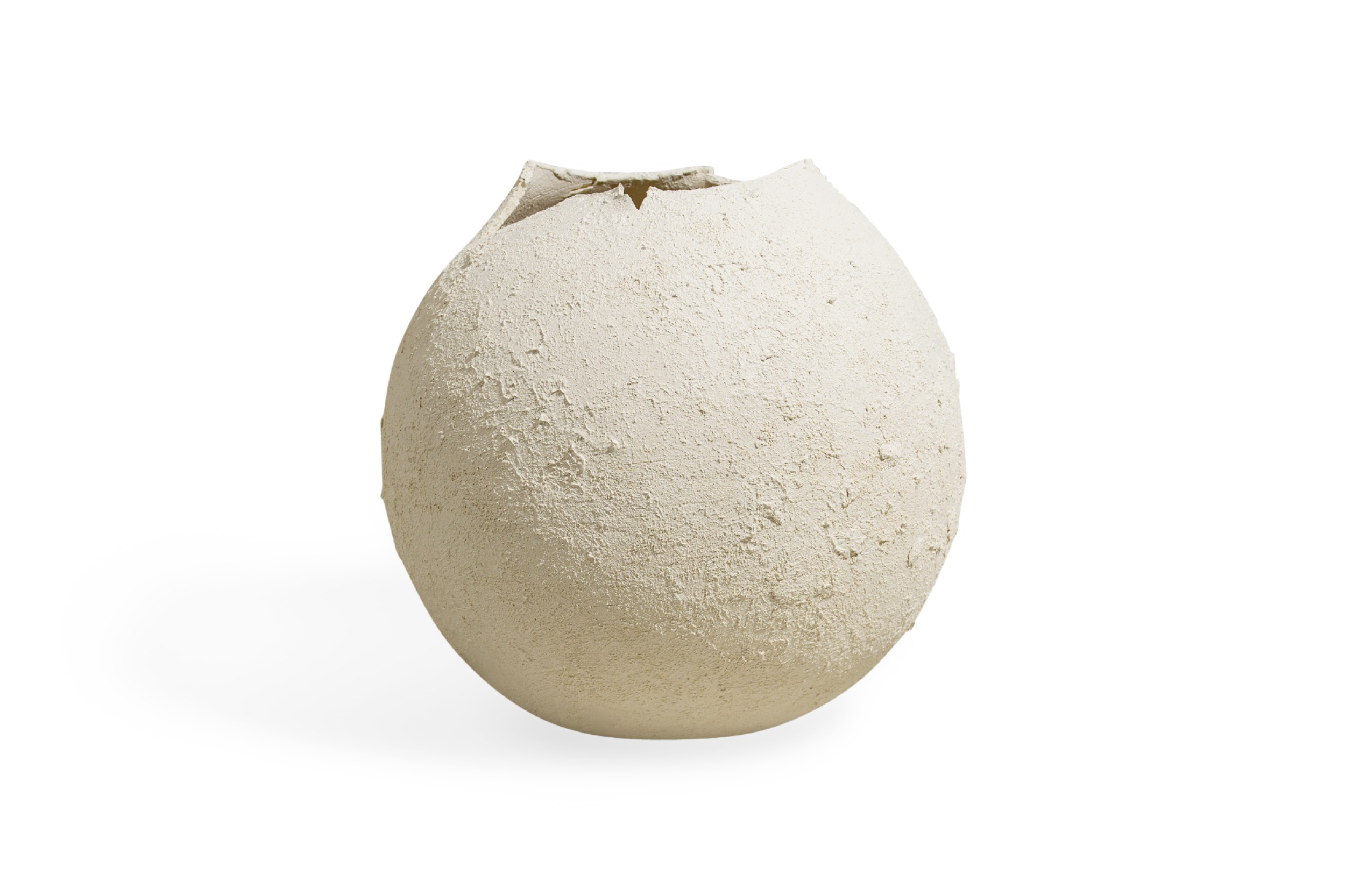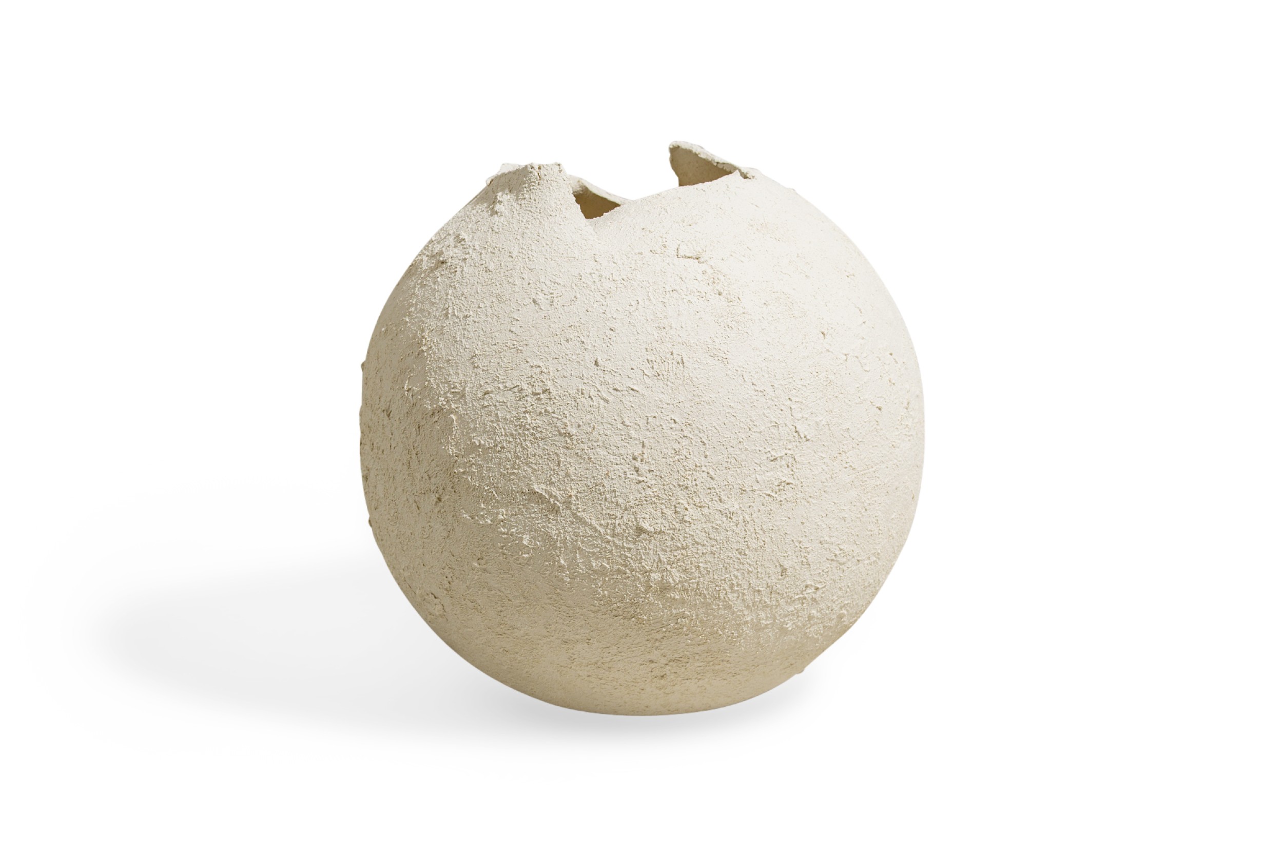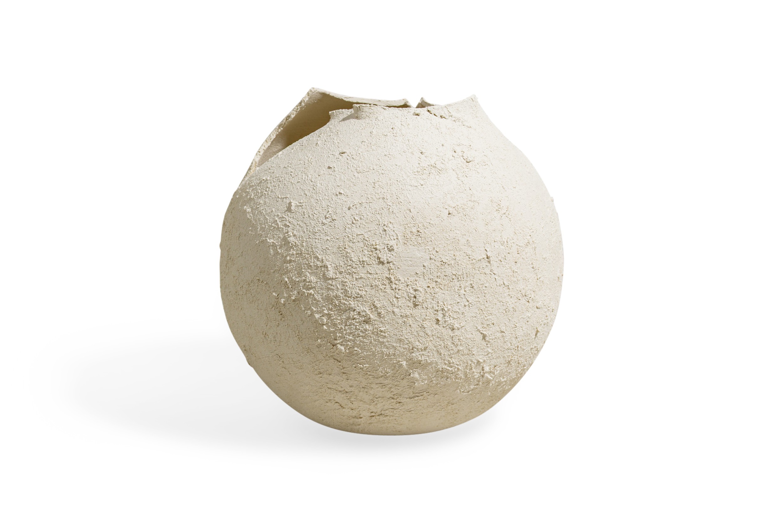 Contemporary sculptural urn/vase featuring a hand-crafted spherical beige body with an irregular, organically cracked opening and a rich textural surface (LAURA PASQUINO)