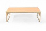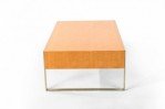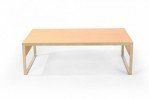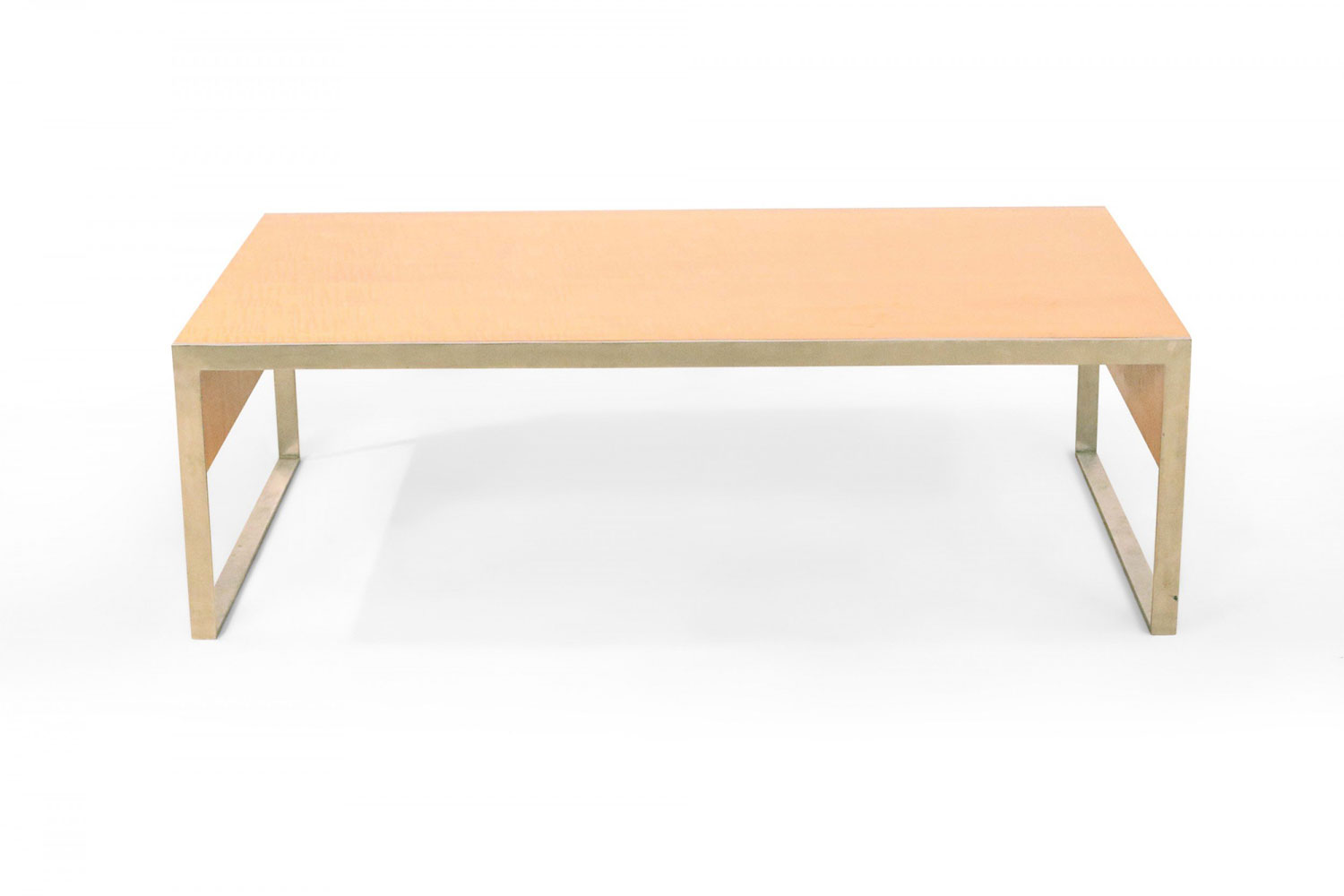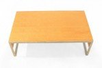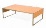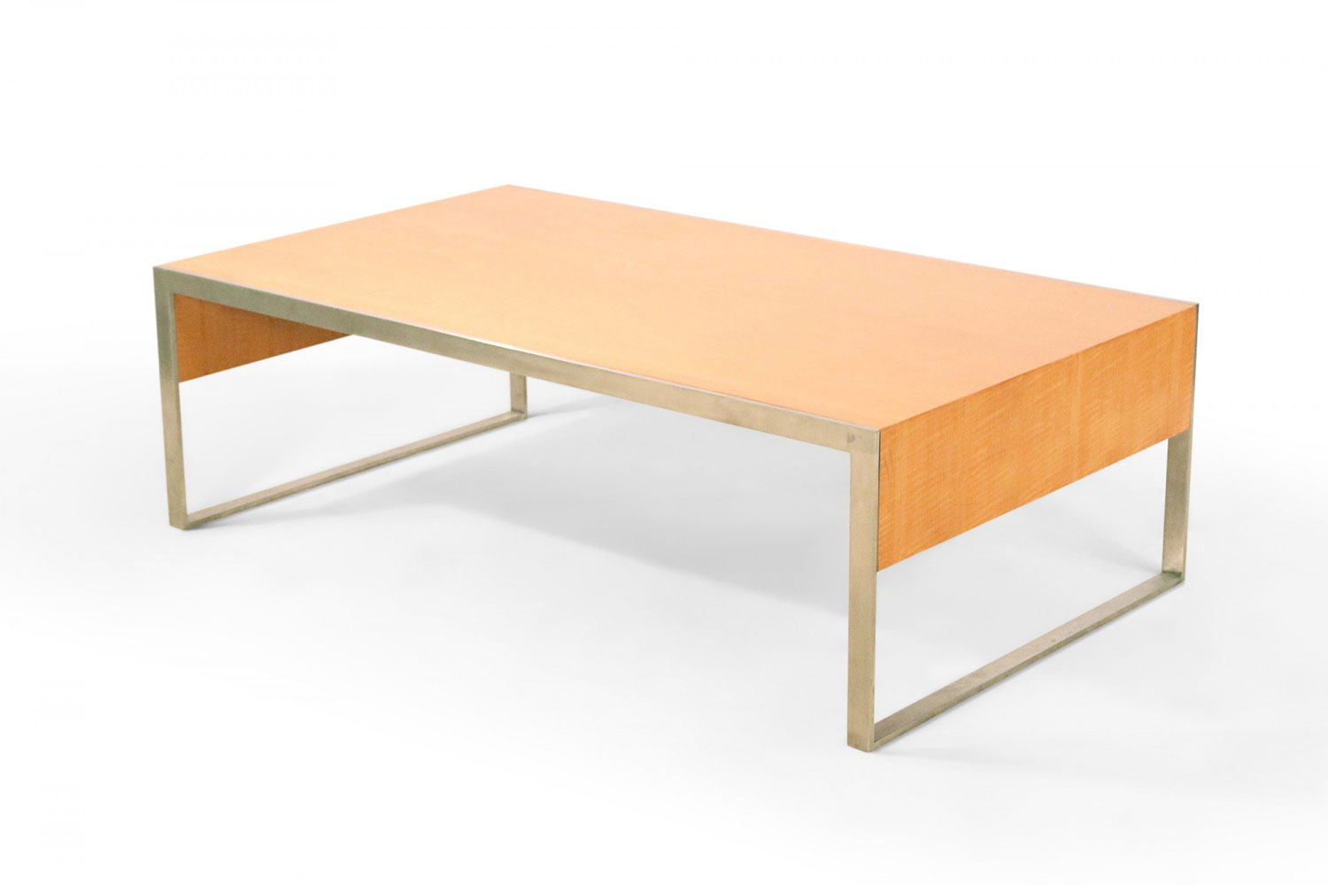 Contemporary rectangular coffee table with maple top and short sides on a steel rectangular frame.