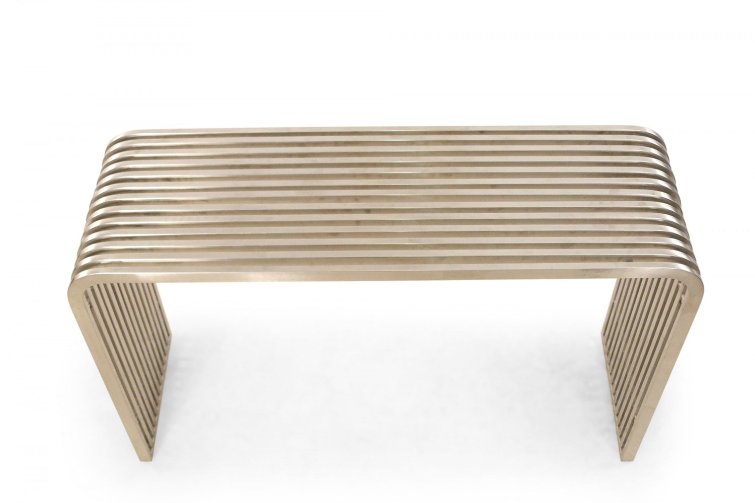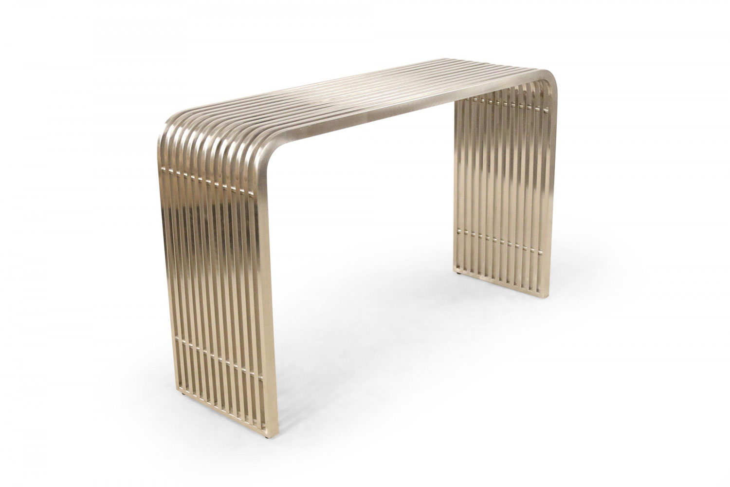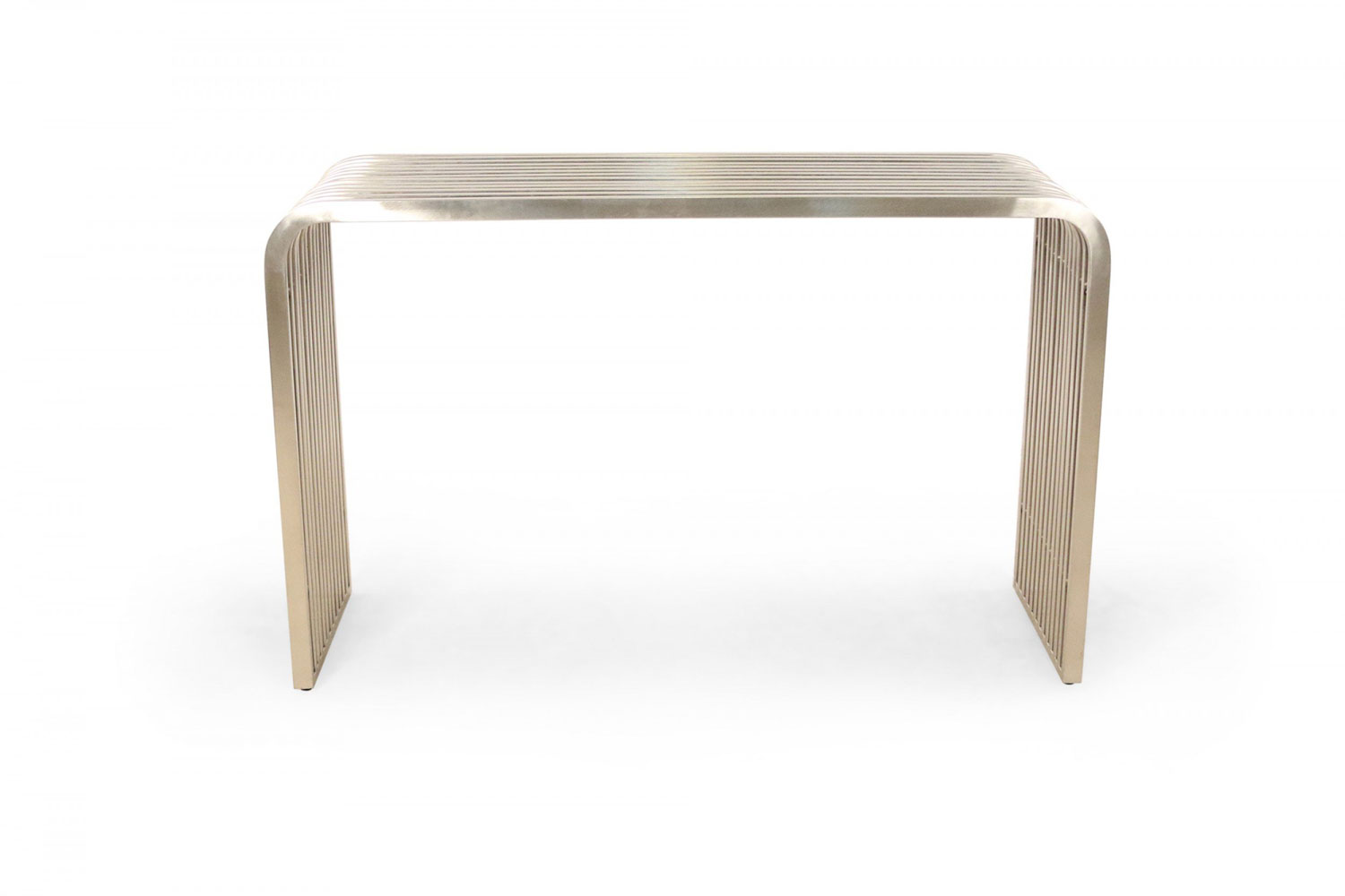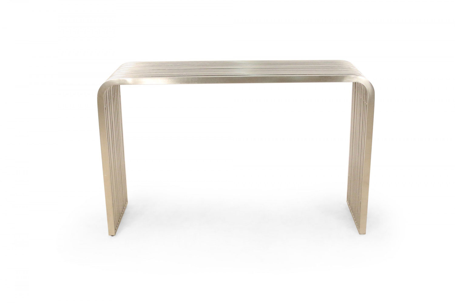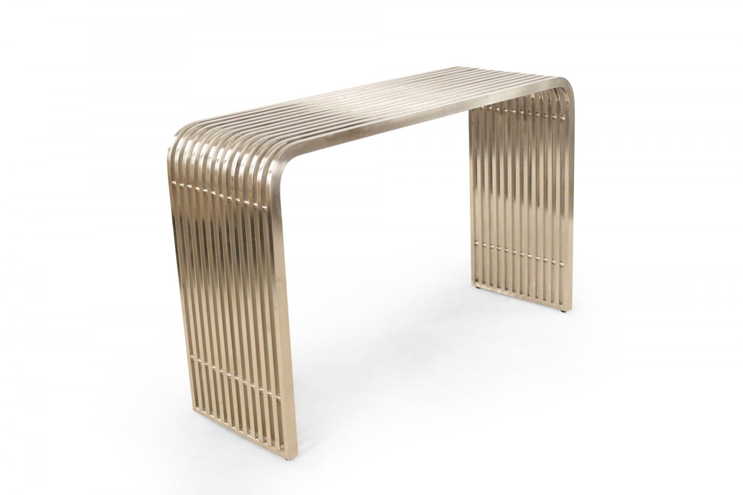 Pair of Contemporary Silver Metal Curved Metal Slat Console Tables